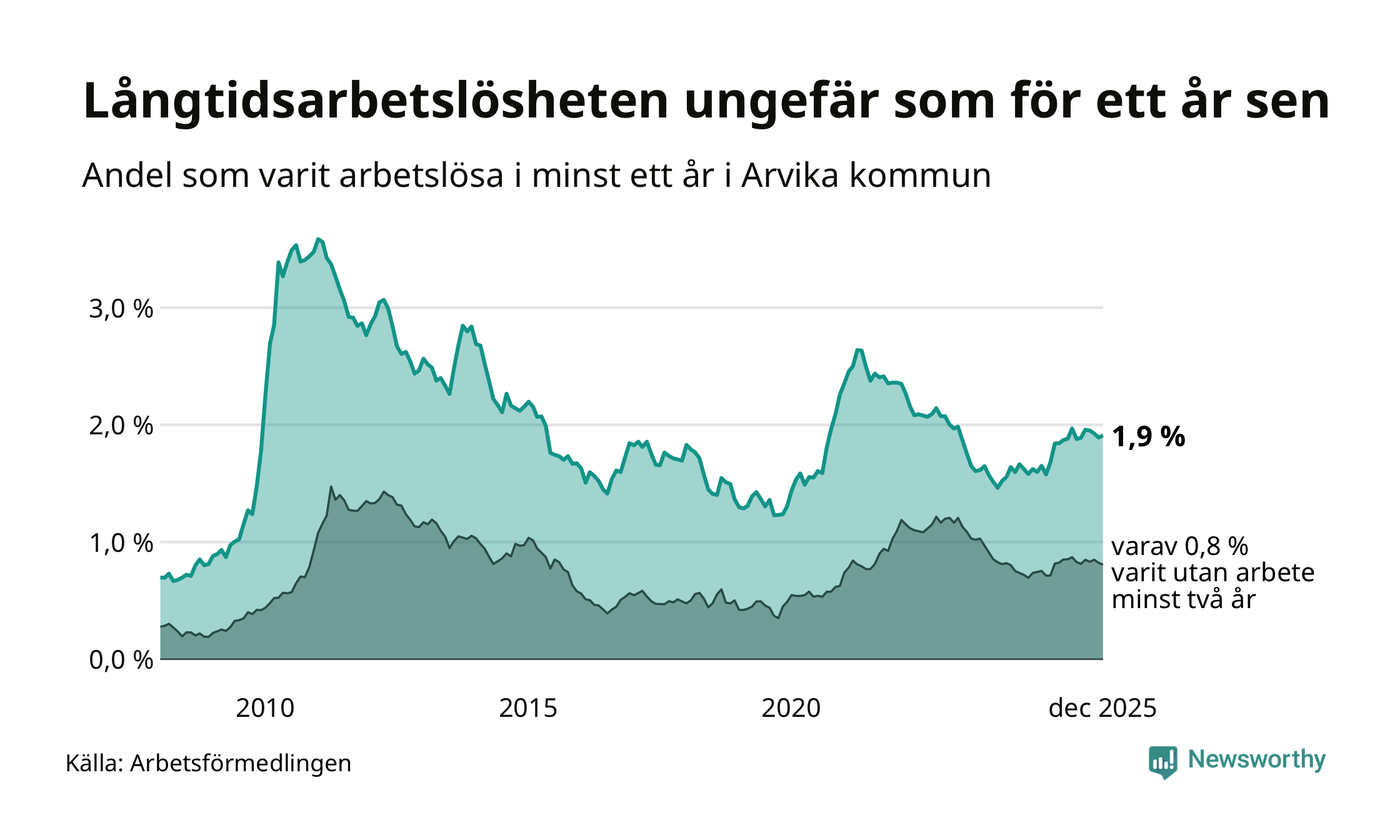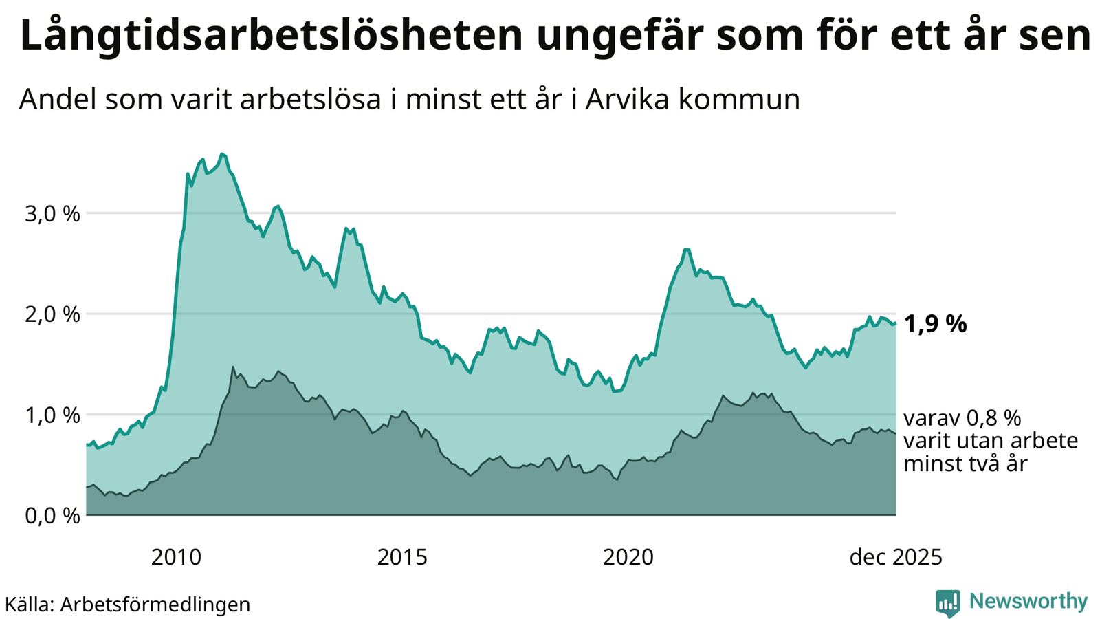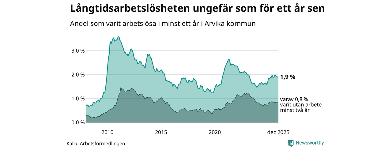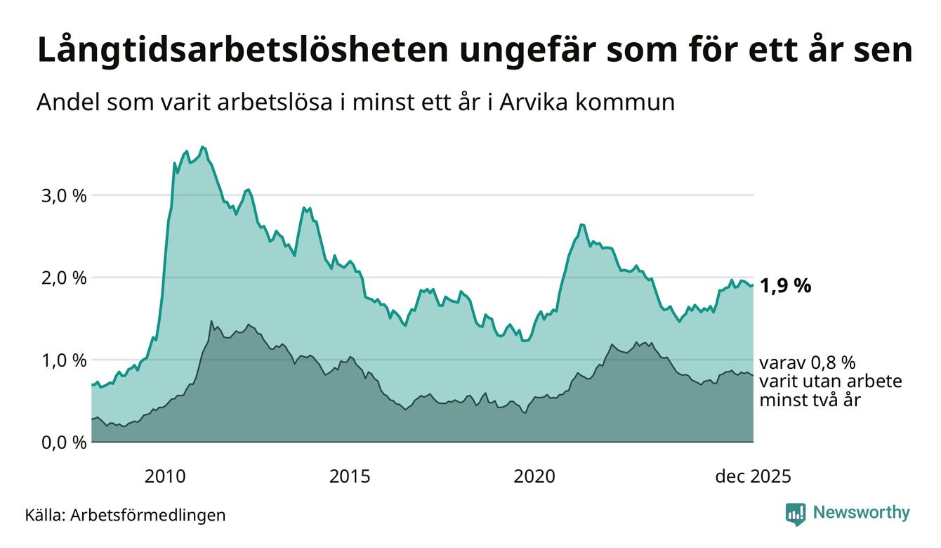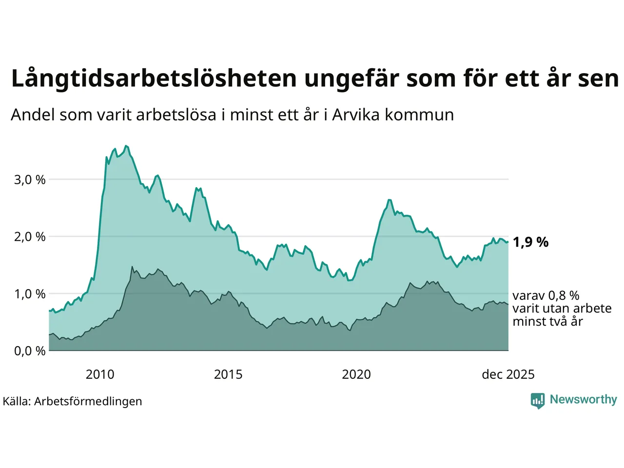I december hade 225 Arvikabor varit arbetslösa i minst ett år, vilket är två fler än månaden innan. 225 personer motsvarar 1,9 procent av arbetskraften i kommunen – andelen långtidsarbetslösa är ungefär på samma nivå som för ett år sedan.