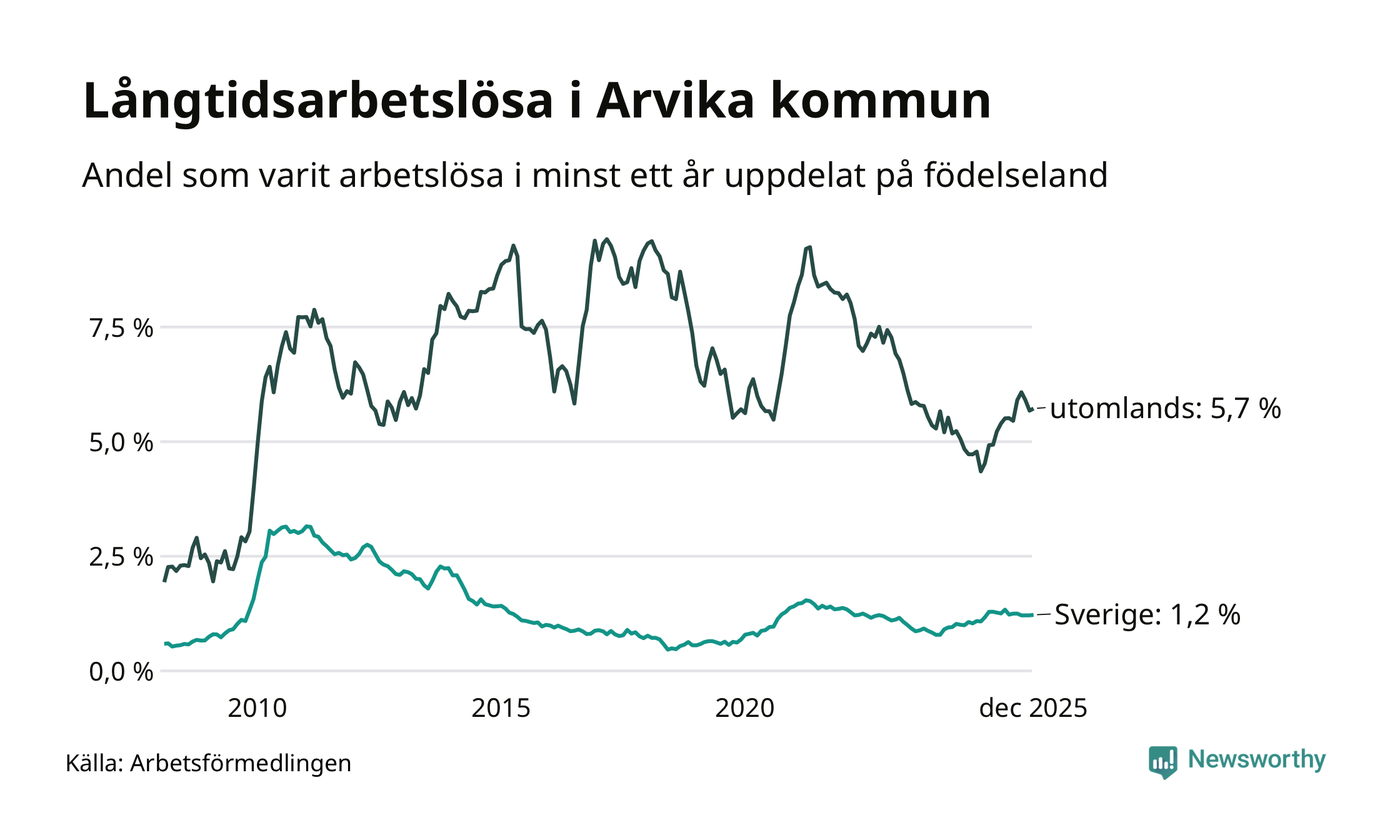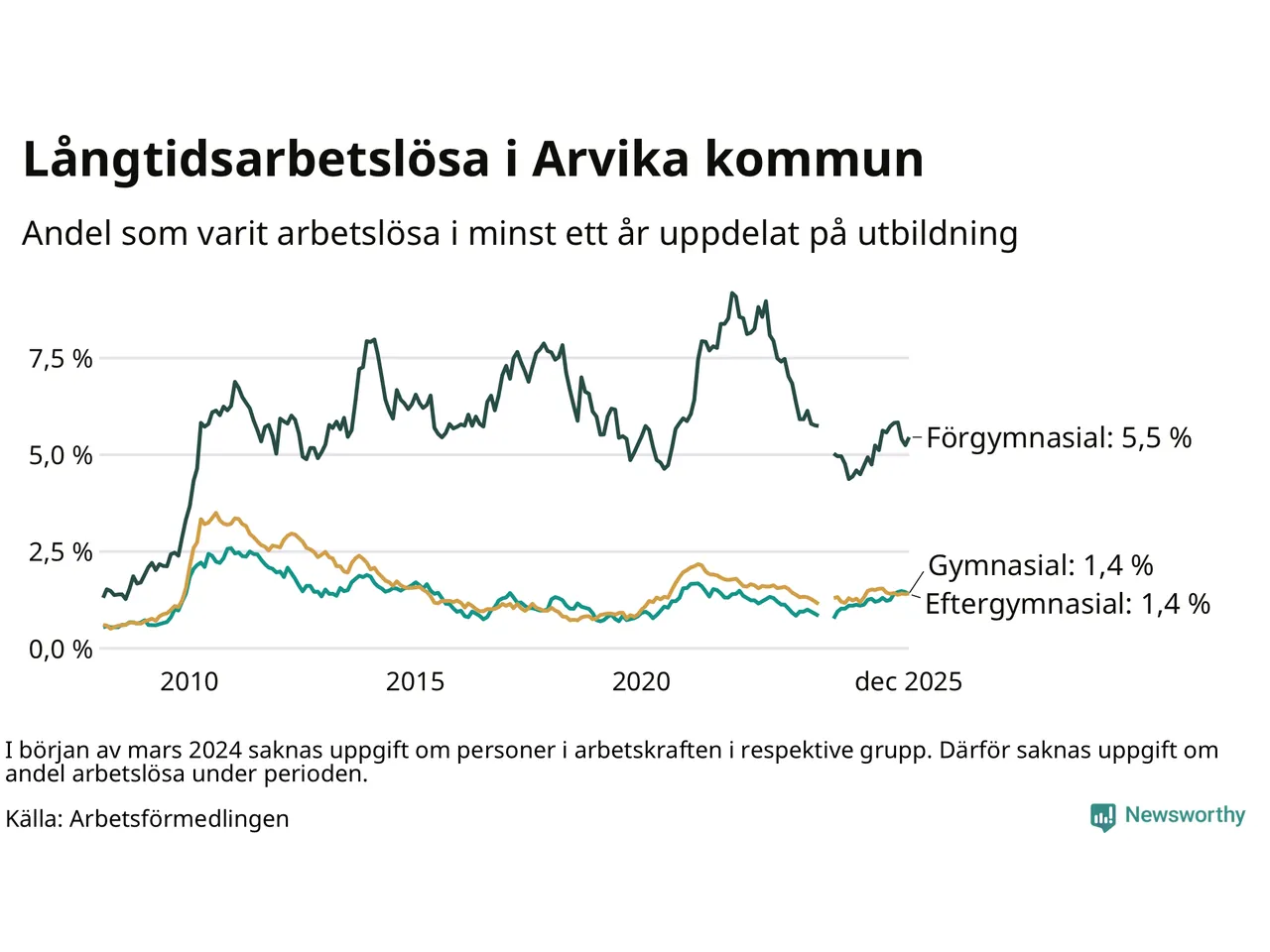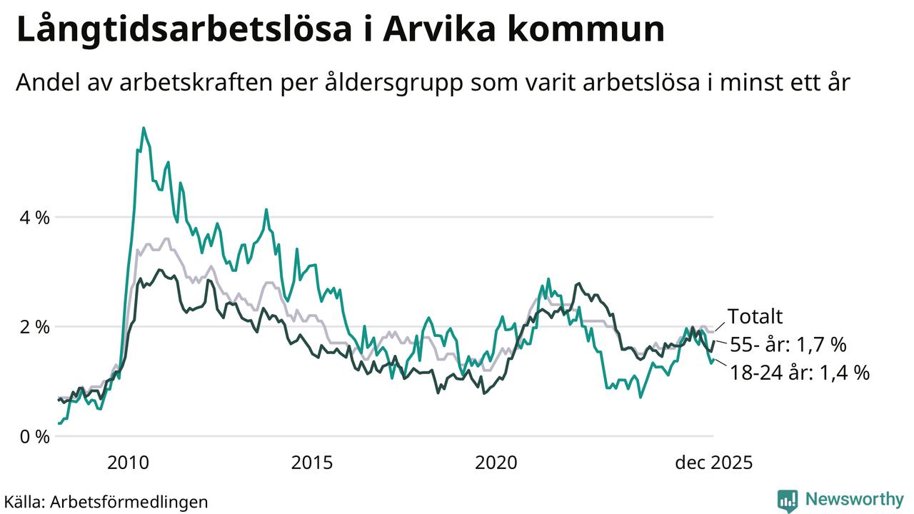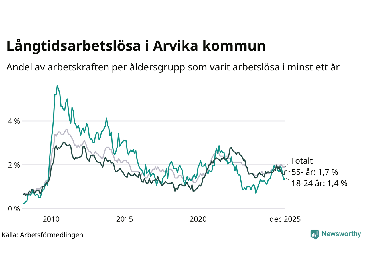 I december hade 225 Arvikabor varit arbetslösa i minst ett år, vilket är två fler än månaden innan. 225 personer motsvarar 1,9 procent av arbetskraften i kommunen – andelen långtidsarbetslösa är ungefär på samma nivå som för ett år sedan.