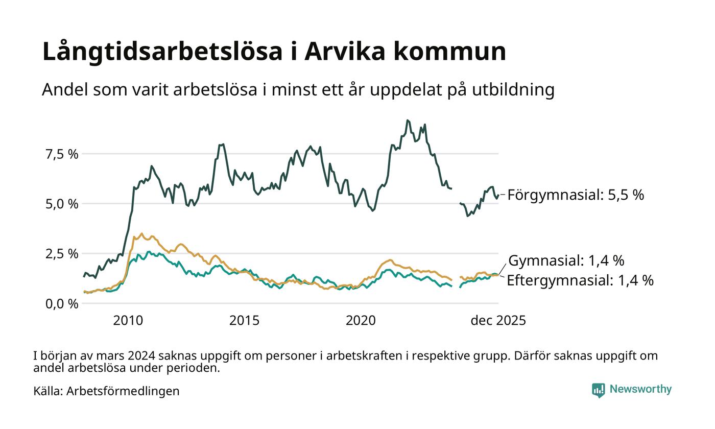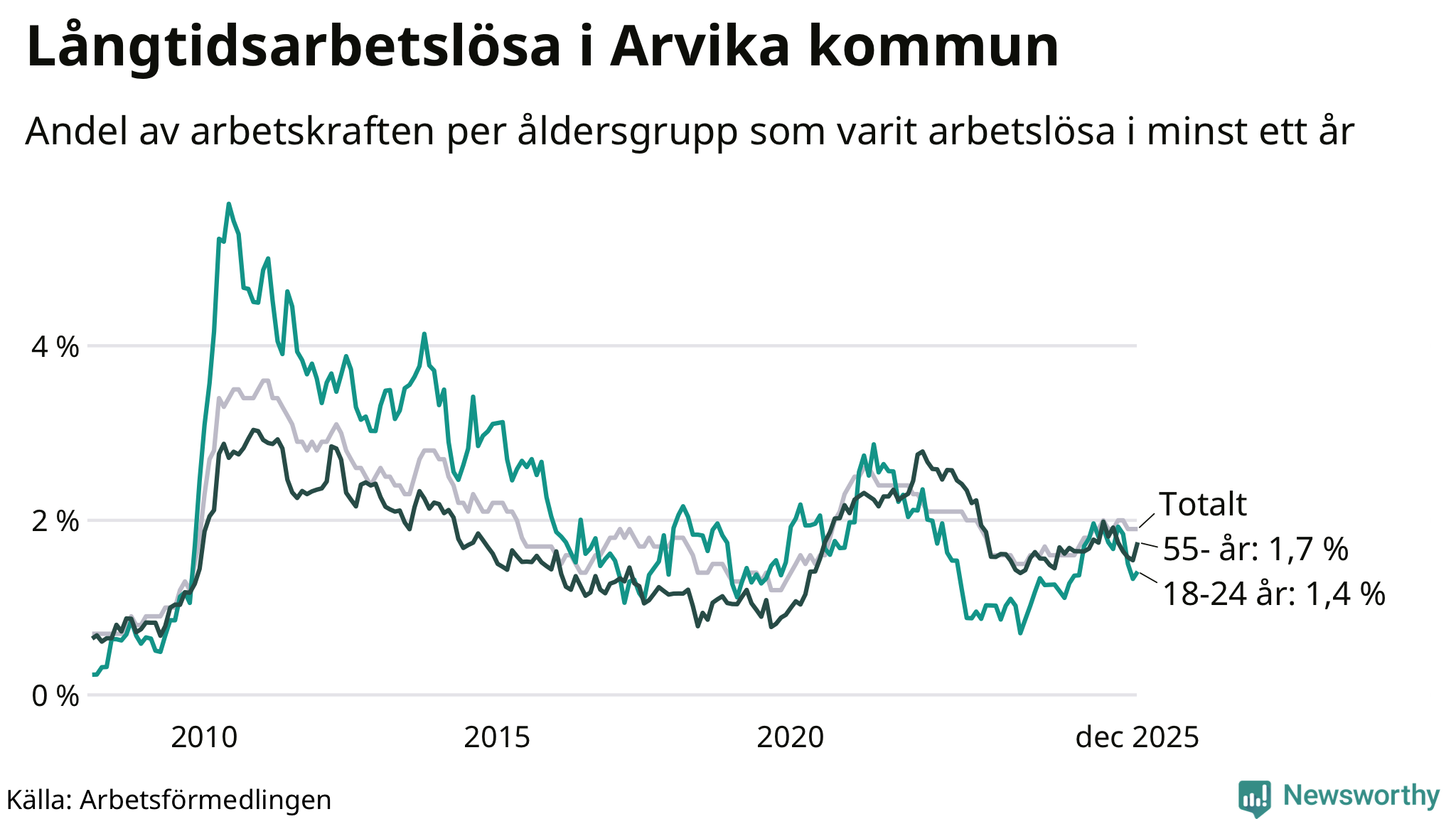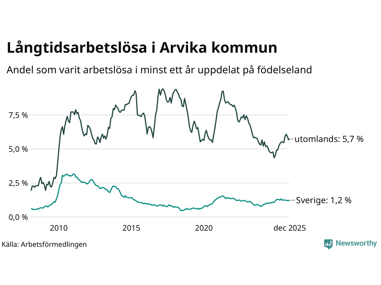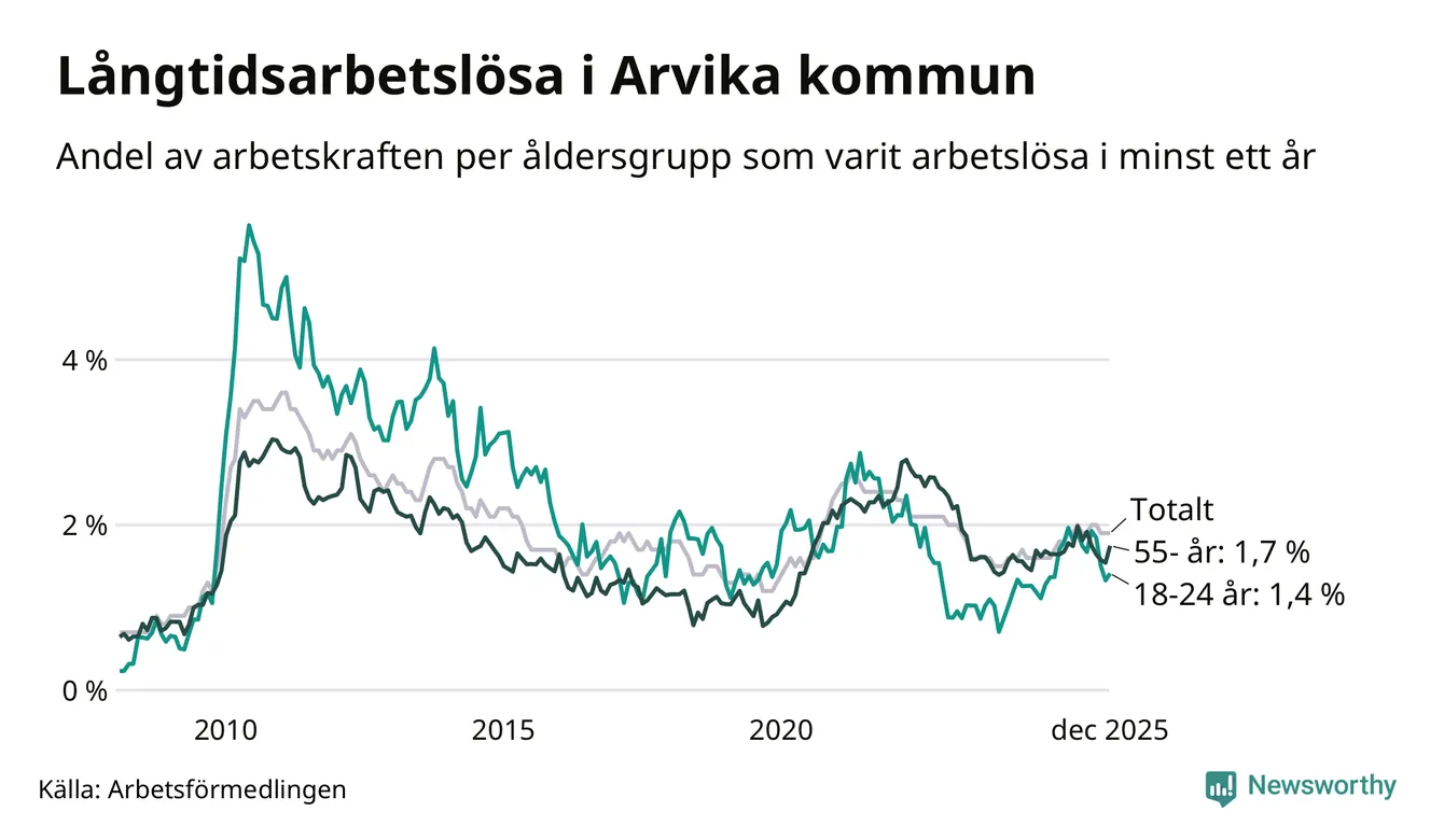 I december hade 225 Arvikabor varit arbetslösa i minst ett år, vilket är två fler än månaden innan. 225 personer motsvarar 1,9 procent av arbetskraften i kommunen – andelen långtidsarbetslösa är ungefär på samma nivå som för ett år sedan.