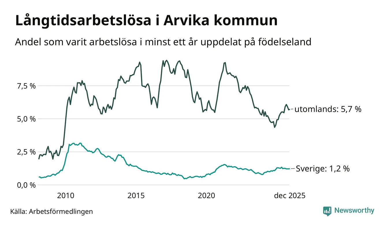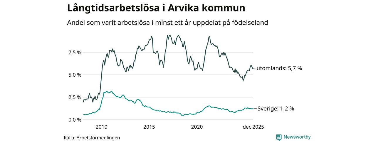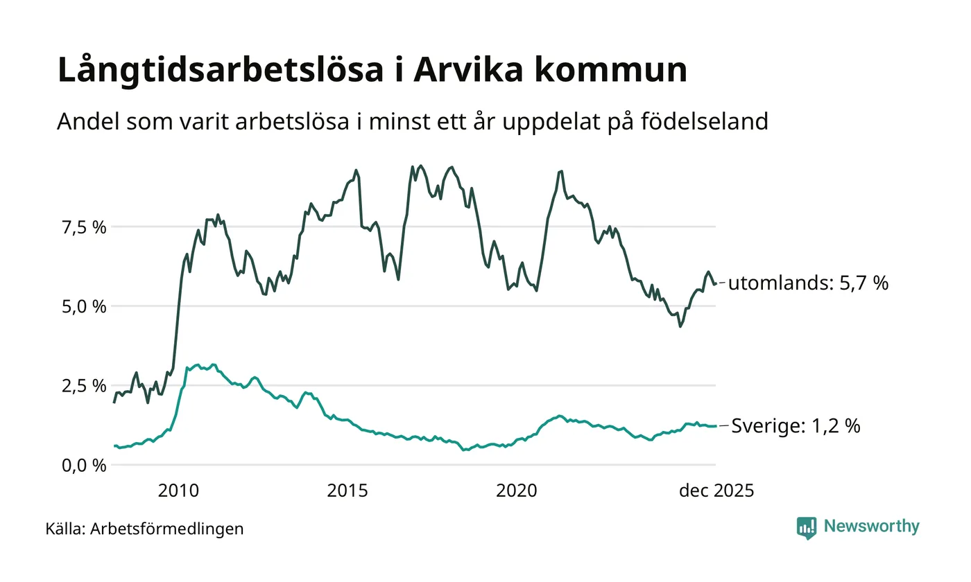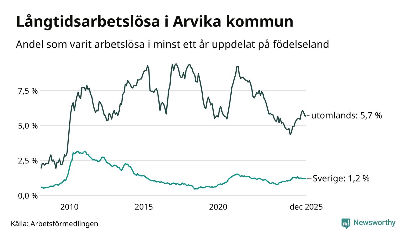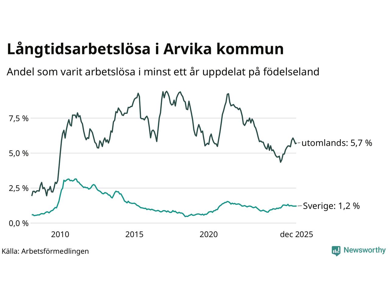 122 av de långtidsarbetslösa i Arvika är födda i Sverige, medan 103 är födda utomlands. Det innebär att långtidsarbetslösheten bland Sverigefödda är 1,2 procent, medan den är fem gånger så hög – 5,7 procent – bland födda utomlands. Även i riket som helhet är arbetslösheten högre bland utrikesfödda.
