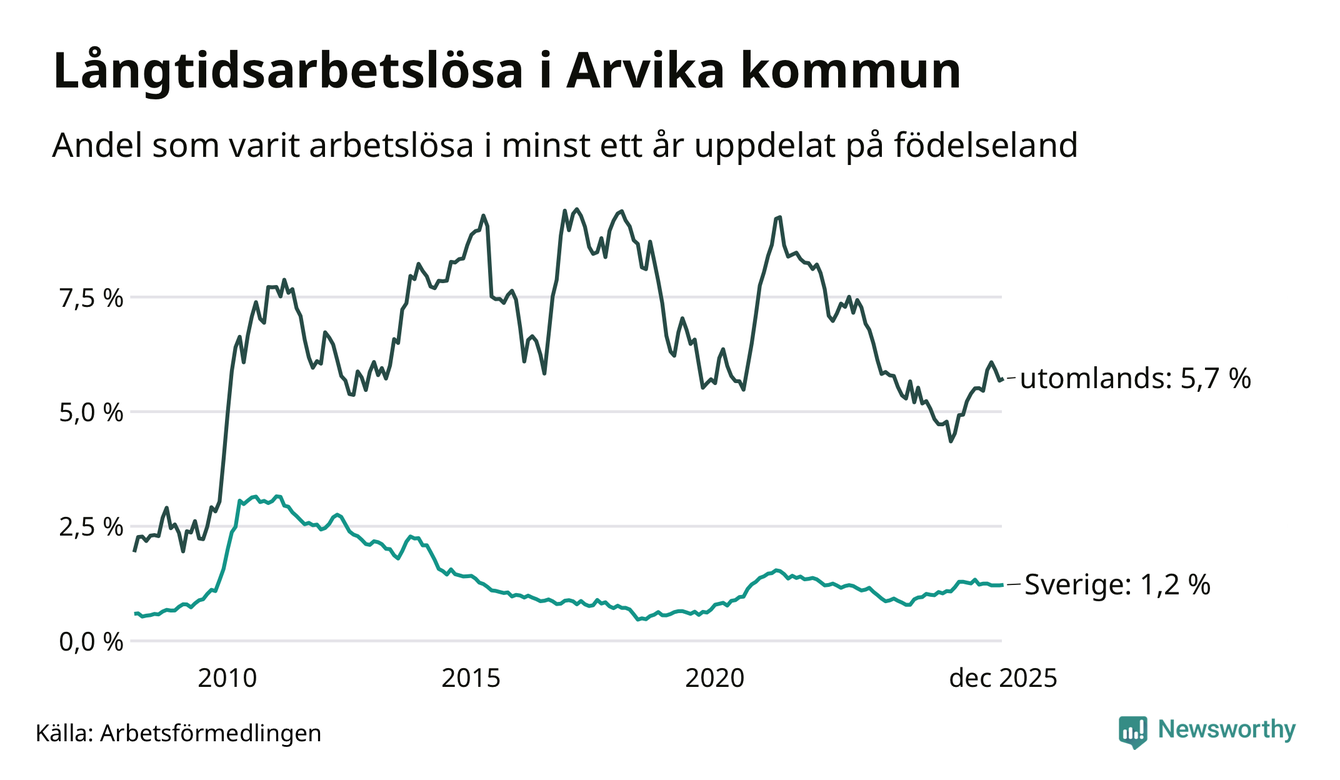 Graf: Andel arbetslösa uppdelat på födelseland i Arvika