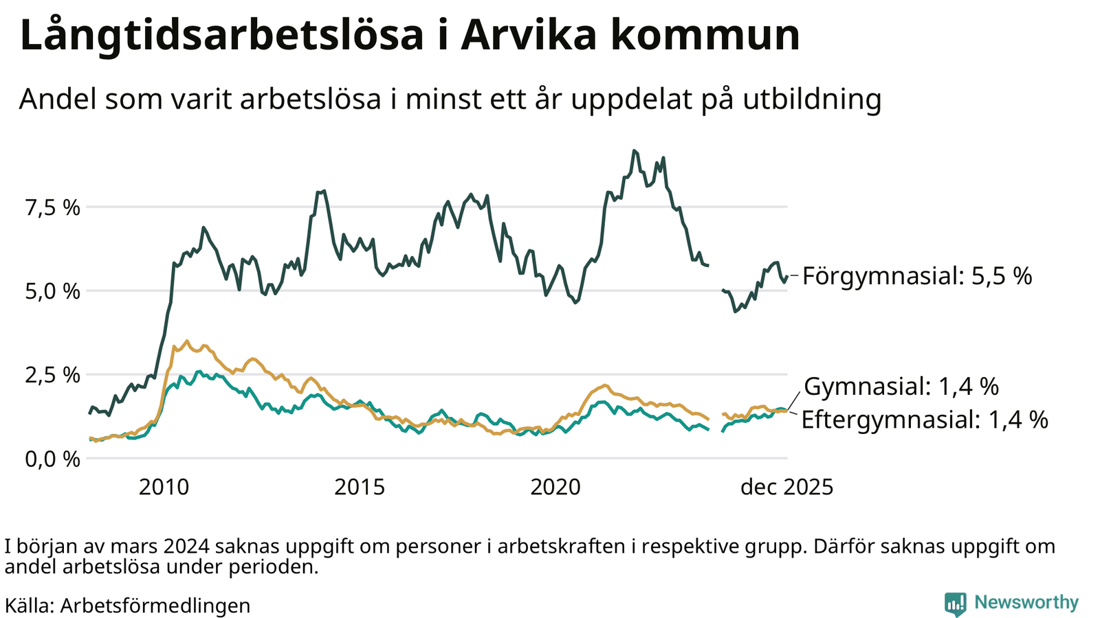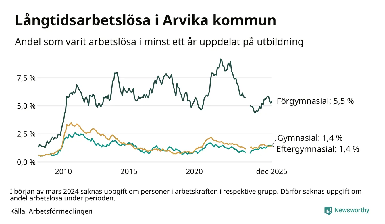Graf över andel långtidsarbetslösa i Arvika uppdelat på utbildningsnivå