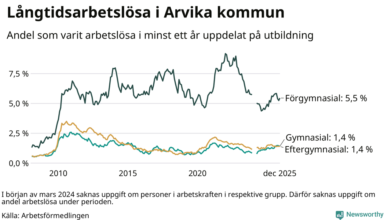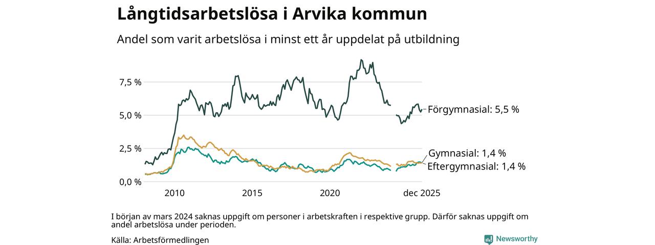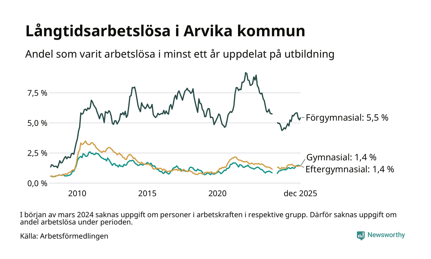 Graf: Andel arbetslösa i Arvika som varit utan arbete i minst 12 månader