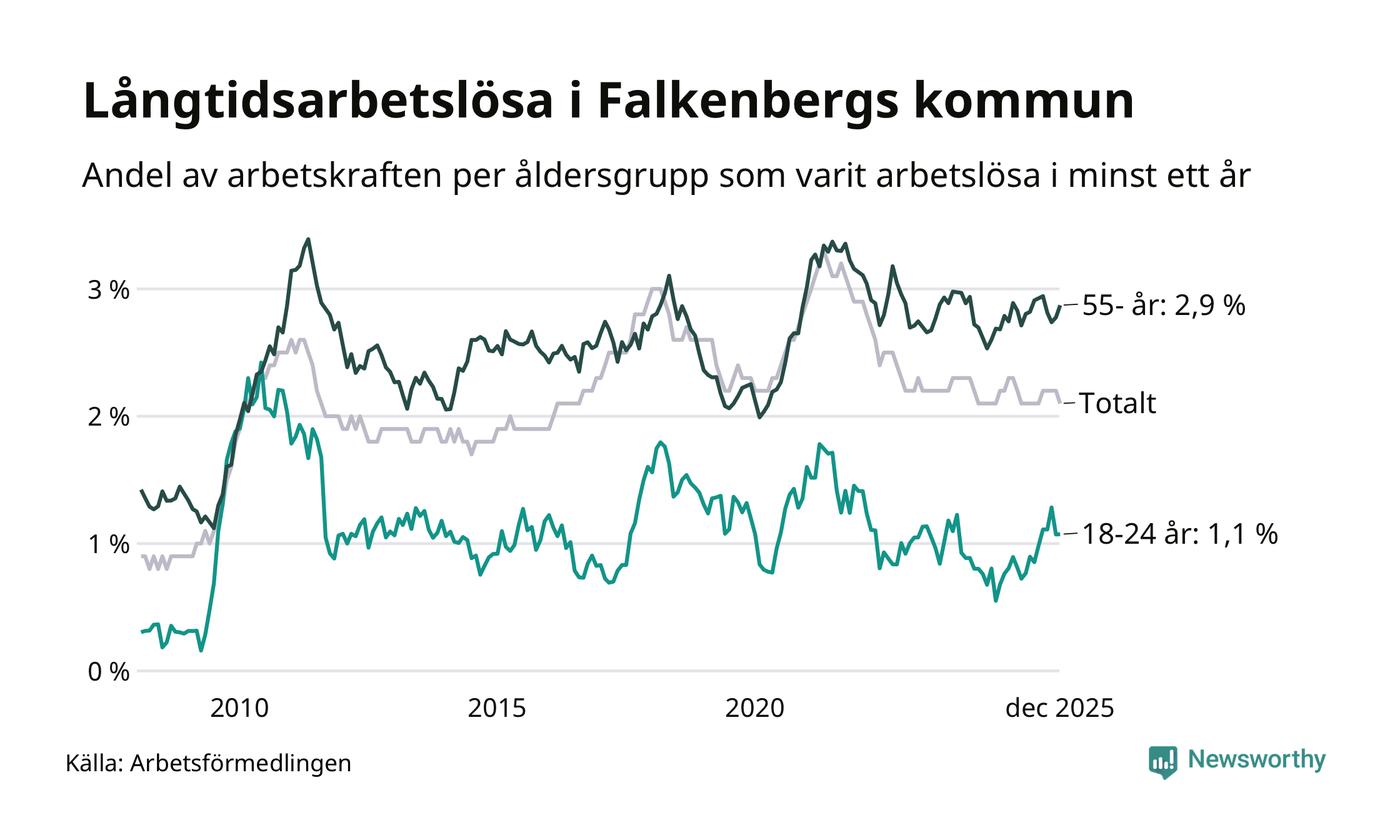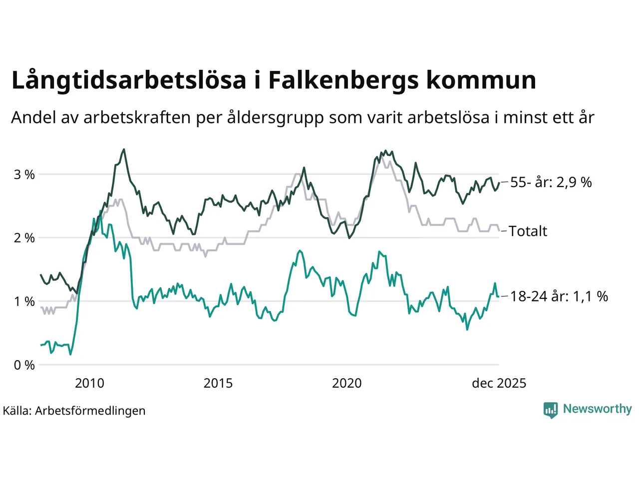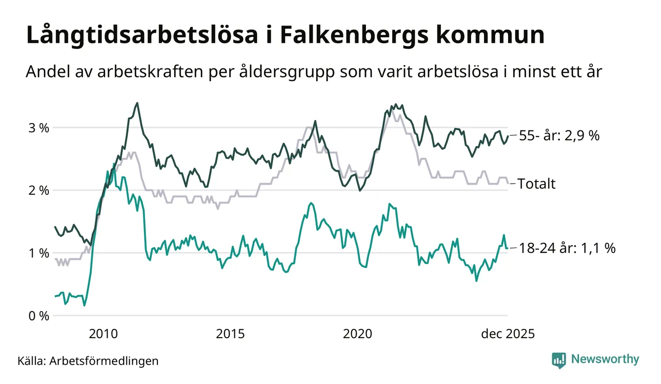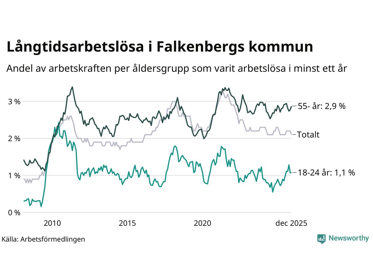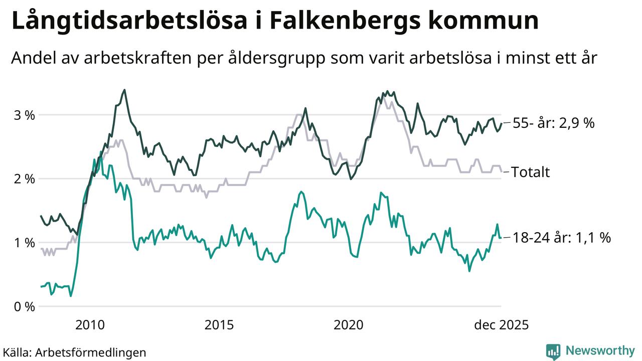 Av de 486 personerna som varit arbetslösa i mer än ett år i Falkenbergs kommun är 155 personer mellan 55 och 651 år och 25 är mellan 18 och 24 år. För den äldre gruppen är andelen arbetslösa 2,9 procent medan den i den yngre gruppen är 1,1 procent. Även i riket som helhet är långtidsarbetslösheten högre i gruppen äldre.