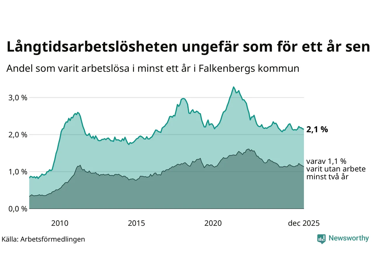 I december hade 486 Falkenbergsbor varit arbetslösa i minst ett år, vilket är två färre än månaden innan. Det är den fjärde månaden i rad med minskande antal långtidsarbetslösa. 486 personer motsvarar 2,1 procent av arbetskraften i kommunen – andelen långtidsarbetslösa är ungefär på samma nivå som för ett år sedan.