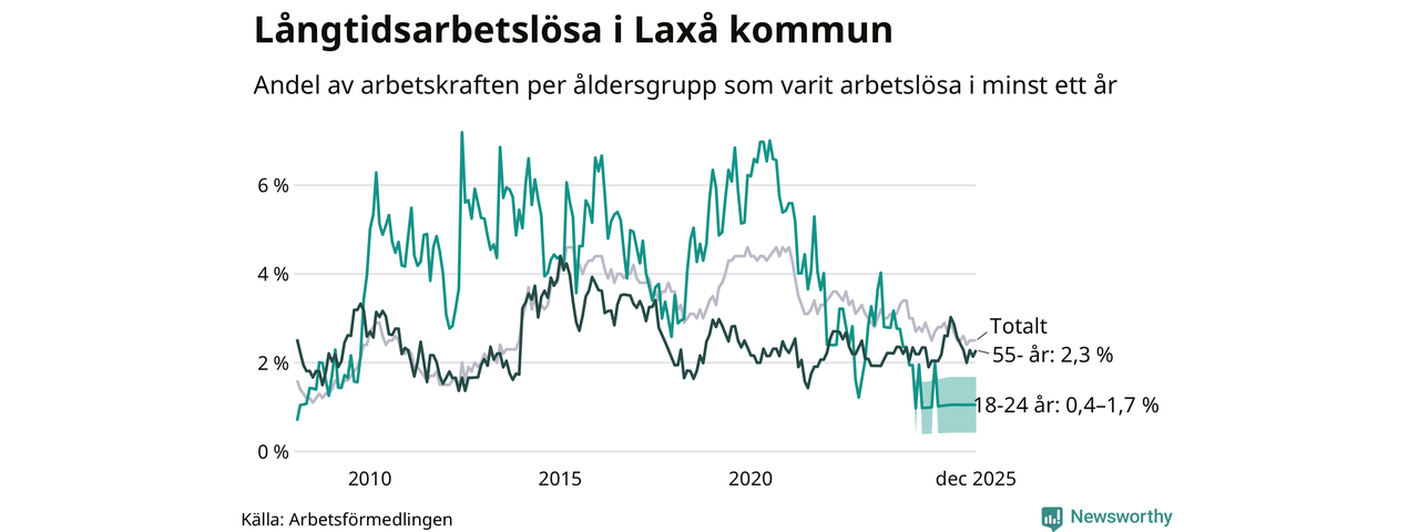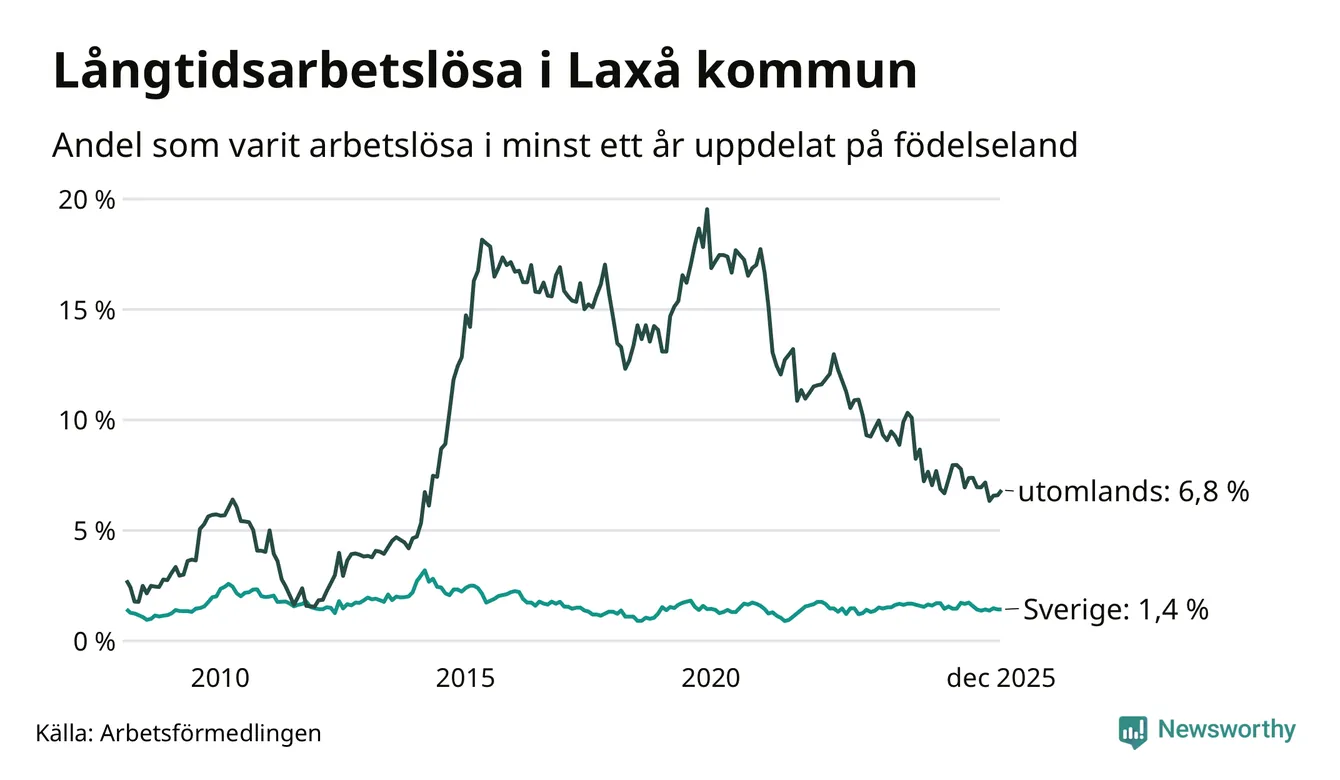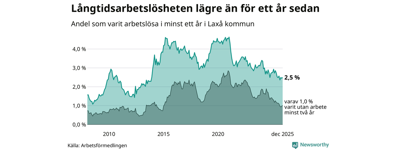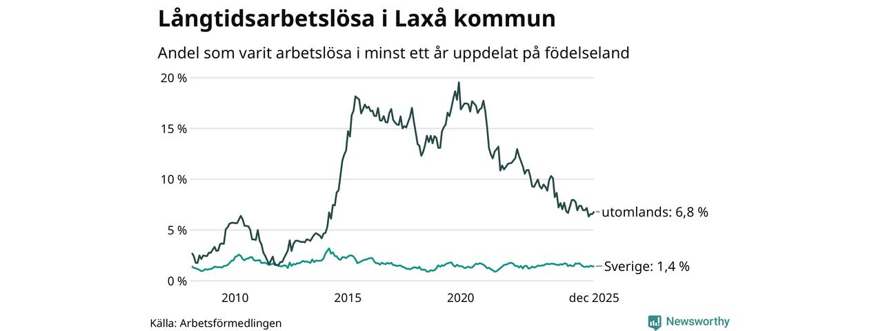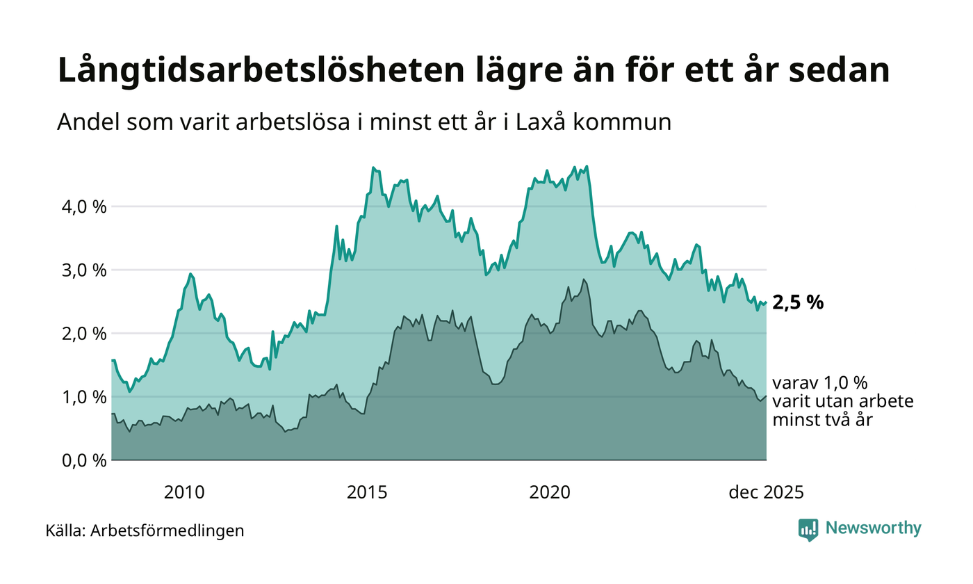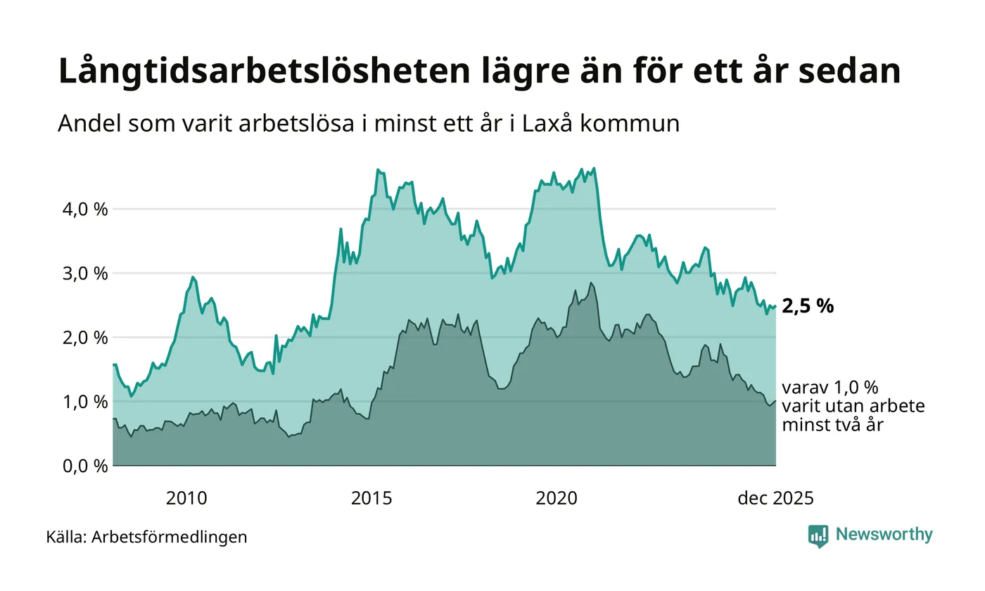 I december hade 59 Laxåbor varit arbetslösa i minst ett år, vilket är en fler än månaden innan. 59 personer motsvarar 2,5 procent av arbetskraften i kommunen – andelen långtidsarbetslösa är 0,3 procentenheter lägre än samma månad för ett år sedan.