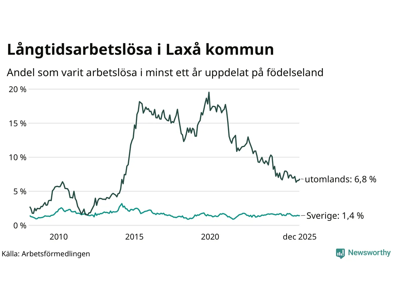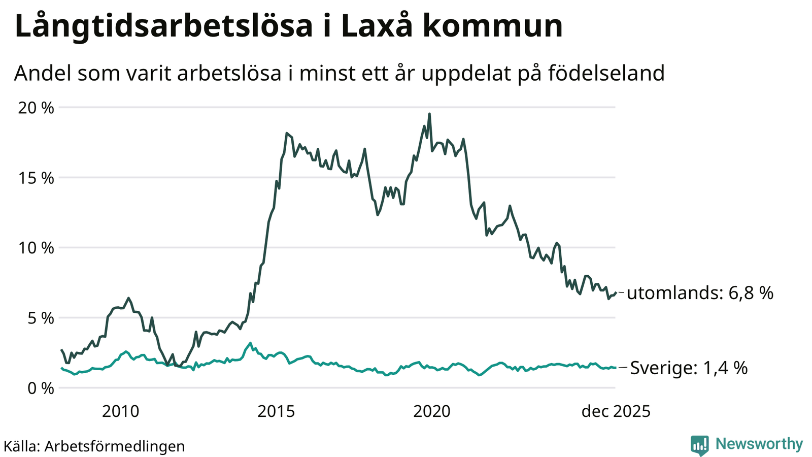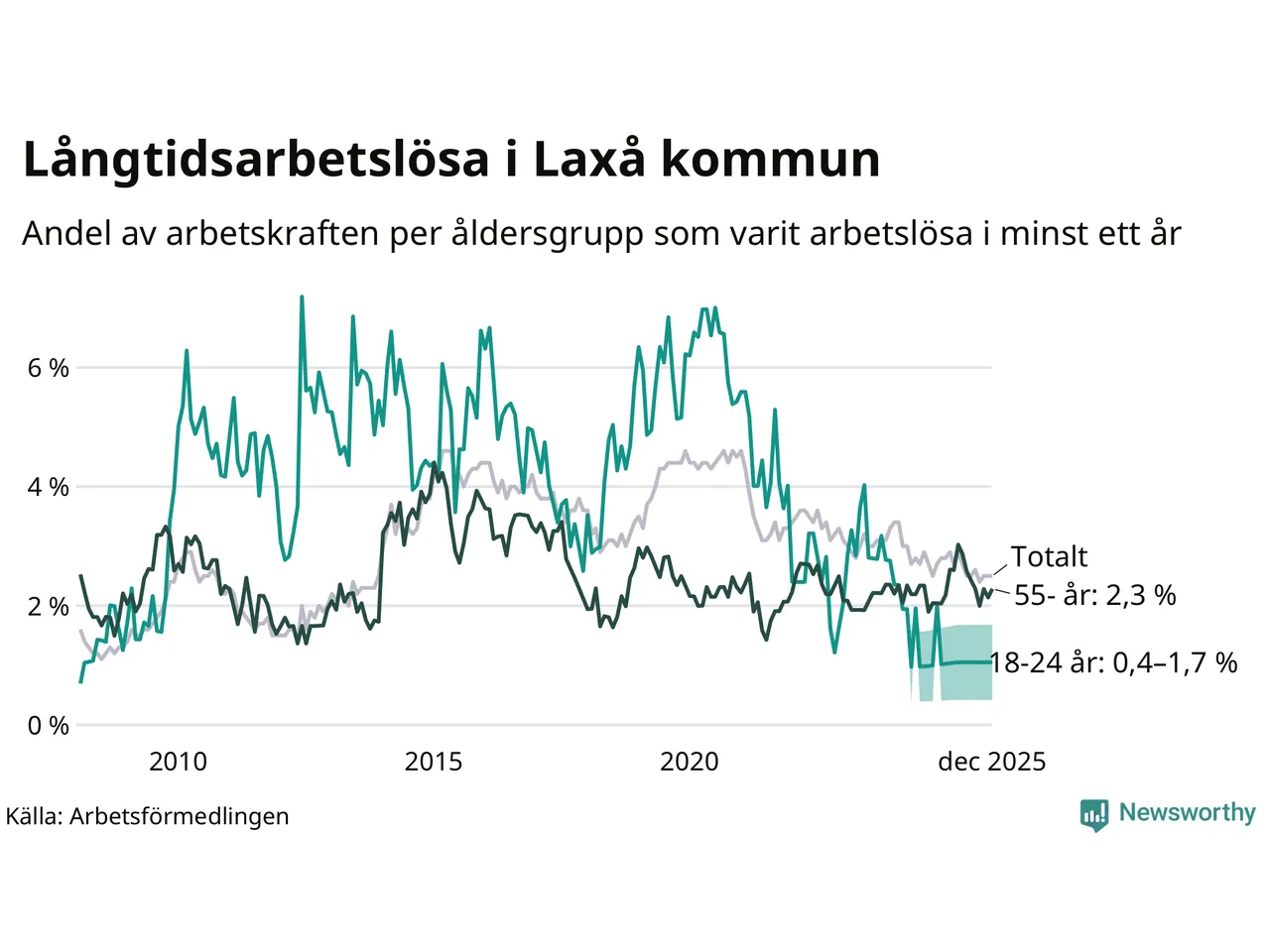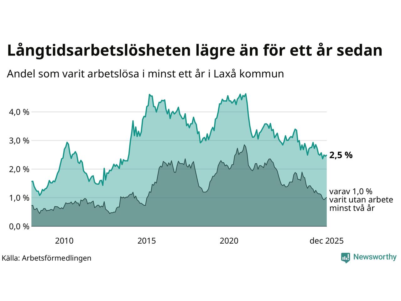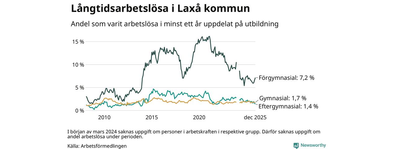 I december hade 59 Laxåbor varit arbetslösa i minst ett år, vilket är en fler än månaden innan. 59 personer motsvarar 2,5 procent av arbetskraften i kommunen – andelen långtidsarbetslösa är 0,3 procentenheter lägre än samma månad för ett år sedan.