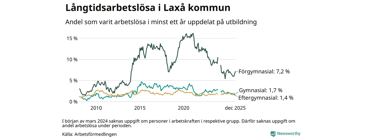 Andelen som varit utan arbete i minst ett år i Laxå var lägre i december jämfört med samma månad för ett år sedan. Det visar Arbetsfömedlingens senaste månadsstatistik.
