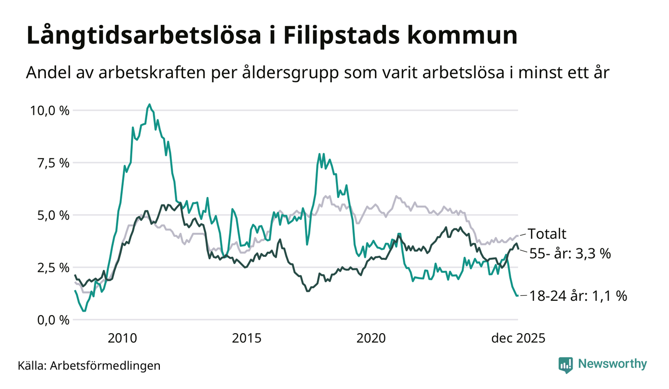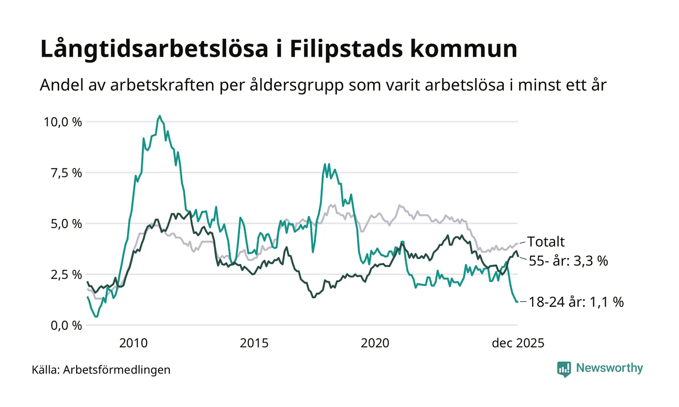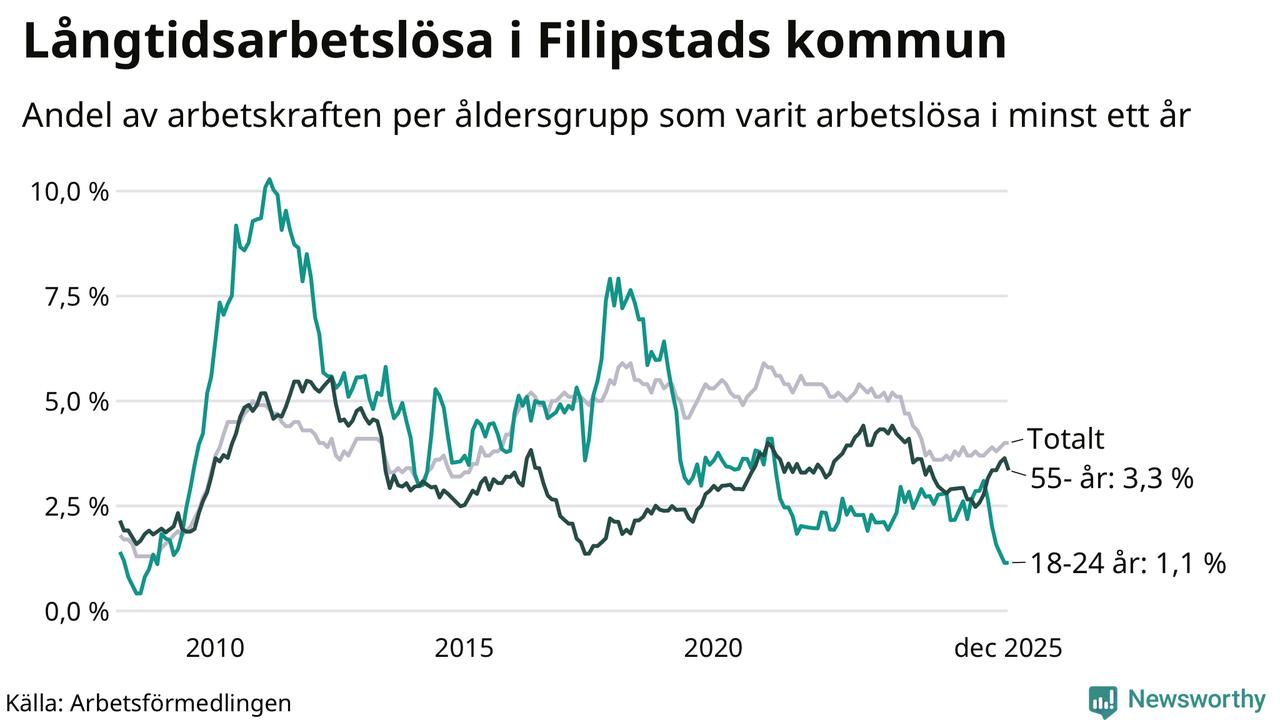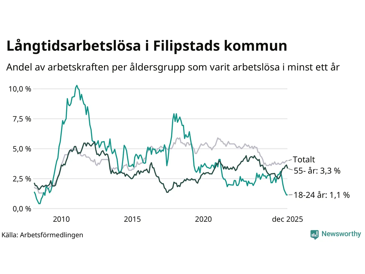 I december hade 161 Filipstadsbor varit arbetslösa i minst ett år, vilket är två färre än månaden innan. 161 personer motsvarar 4,0 procent av arbetskraften i kommunen – andelen långtidsarbetslösa är 0,3 procentenheter högre än samma månad för ett år sedan.