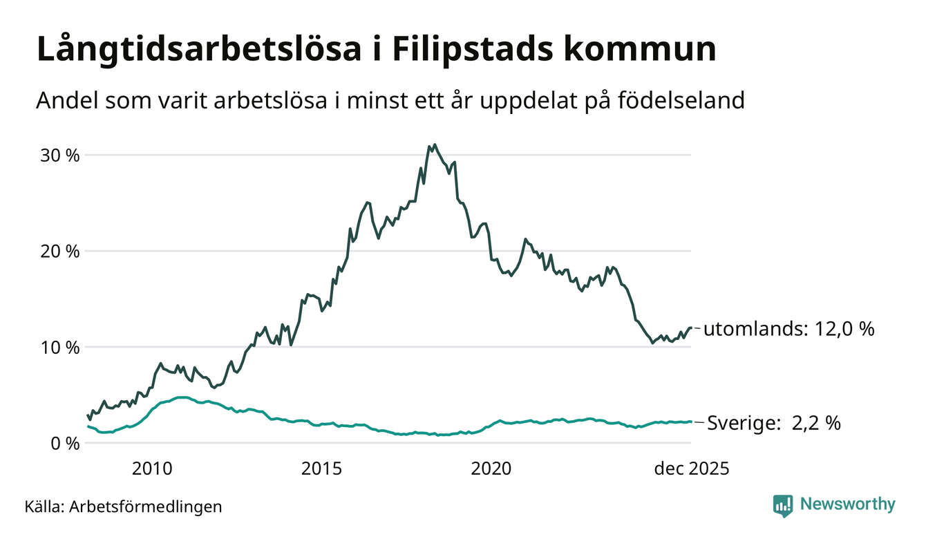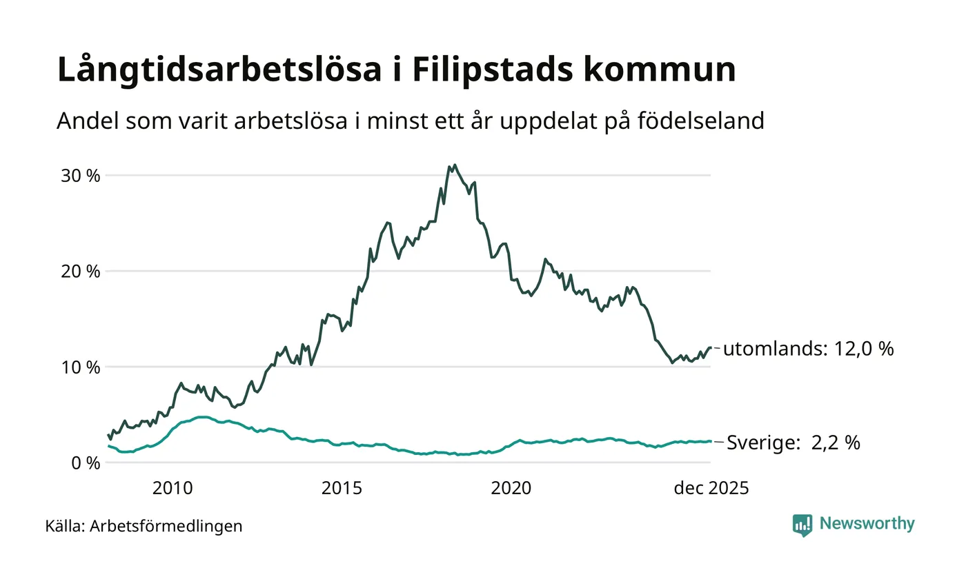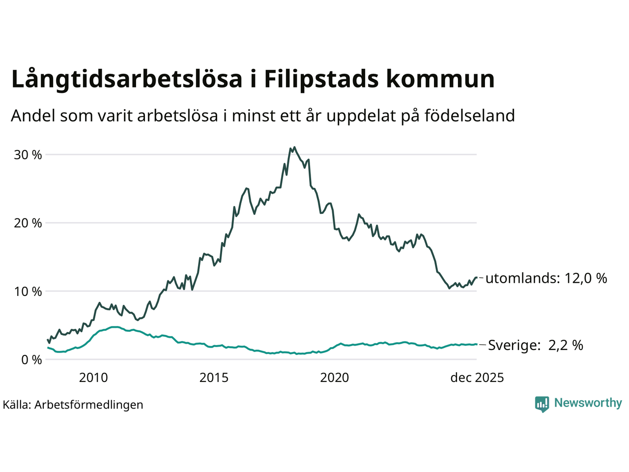 72 av de långtidsarbetslösa i Filipstad är födda i Sverige, medan 89 är födda utomlands. Det innebär att långtidsarbetslösheten bland Sverigefödda är 2,2 procent, medan den är fem gånger så hög – 12,0 procent – bland födda utomlands. Även i riket som helhet är arbetslösheten högre bland utrikesfödda.
