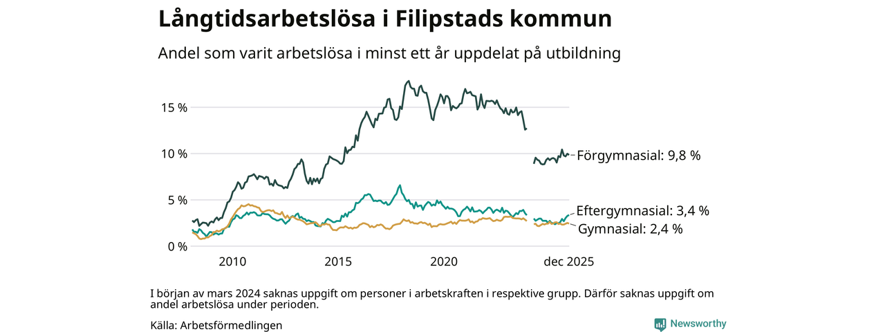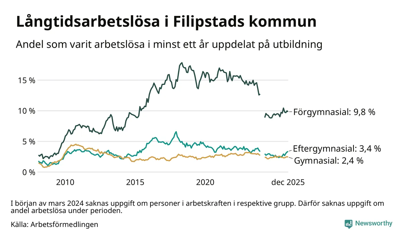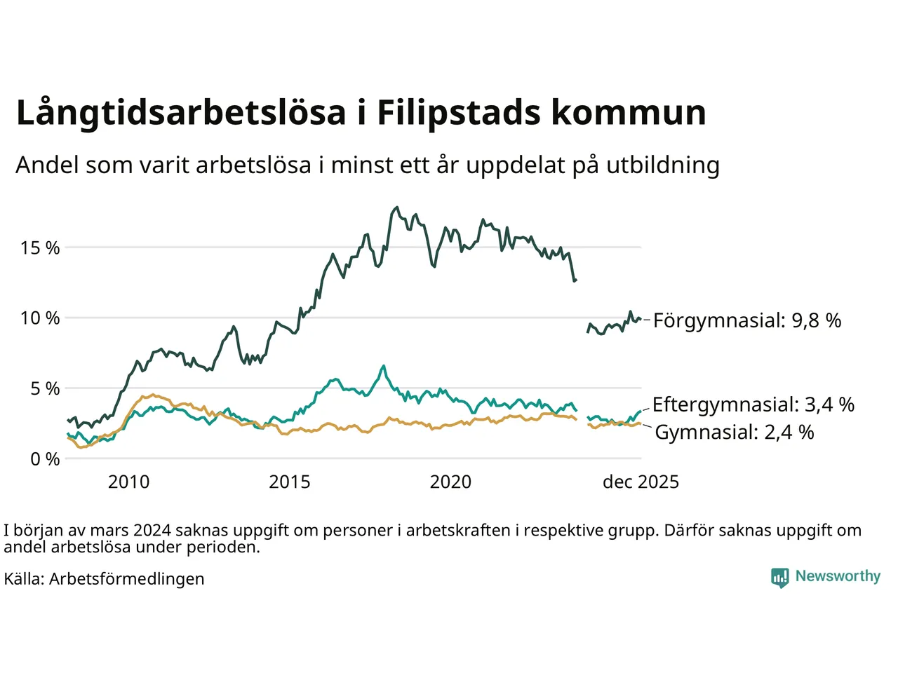 Andelen som varit utan arbete i minst ett år i Filipstad i december var högre än för ett år sedan. Men jämfört med i november har antalet långtidsarbetslösa minskat.