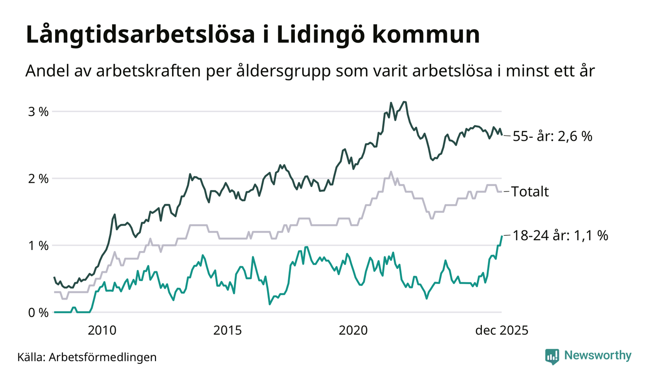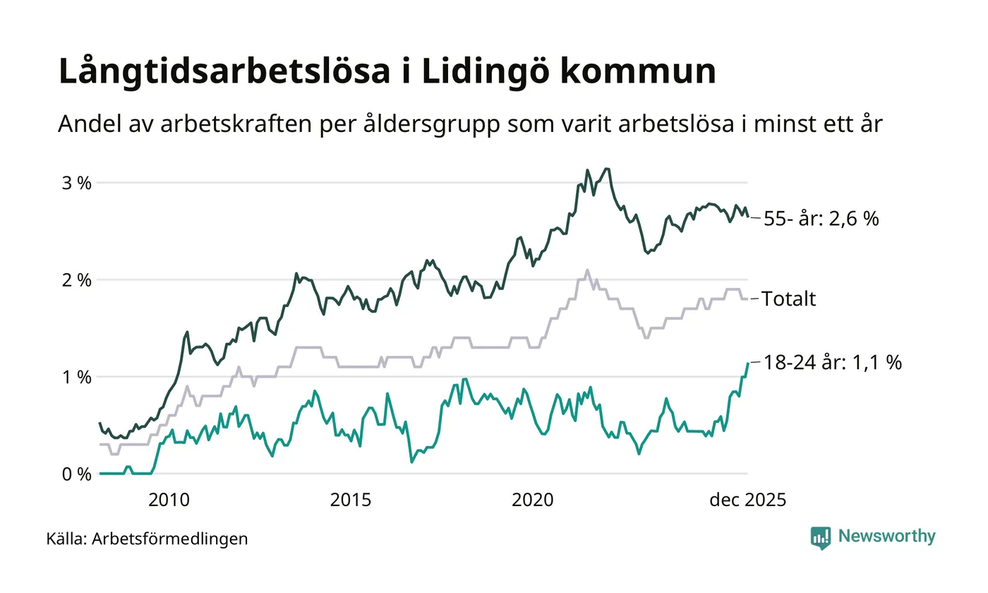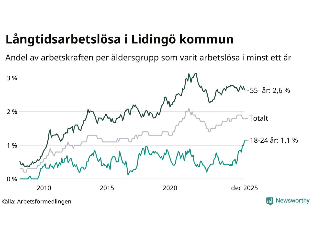 Av de 405 personerna som varit arbetslösa i mer än ett år i Lidingö kommun är 135 personer mellan 55 och 651 år och 23 är mellan 18 och 24 år. För den äldre gruppen är andelen arbetslösa 2,6 procent medan den i den yngre gruppen är 1,1 procent. Även i riket som helhet är långtidsarbetslösheten högre i gruppen äldre.