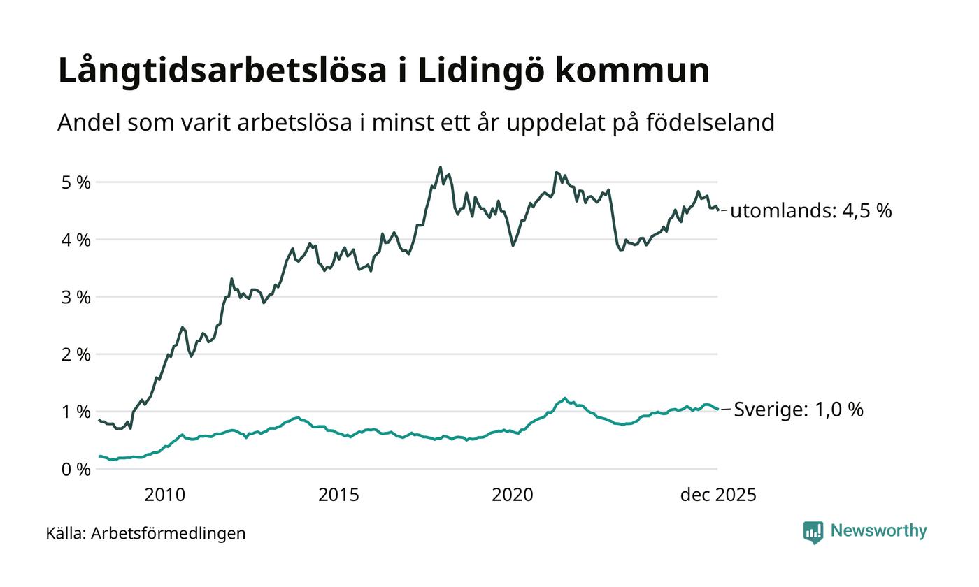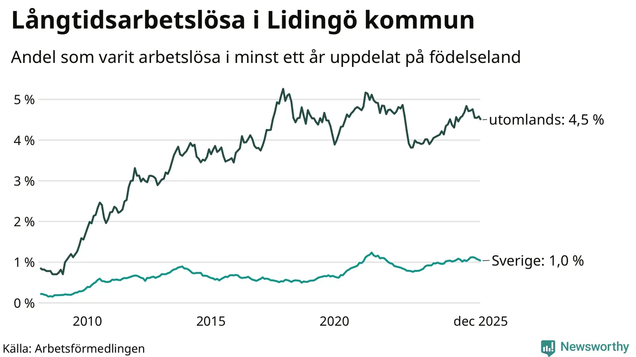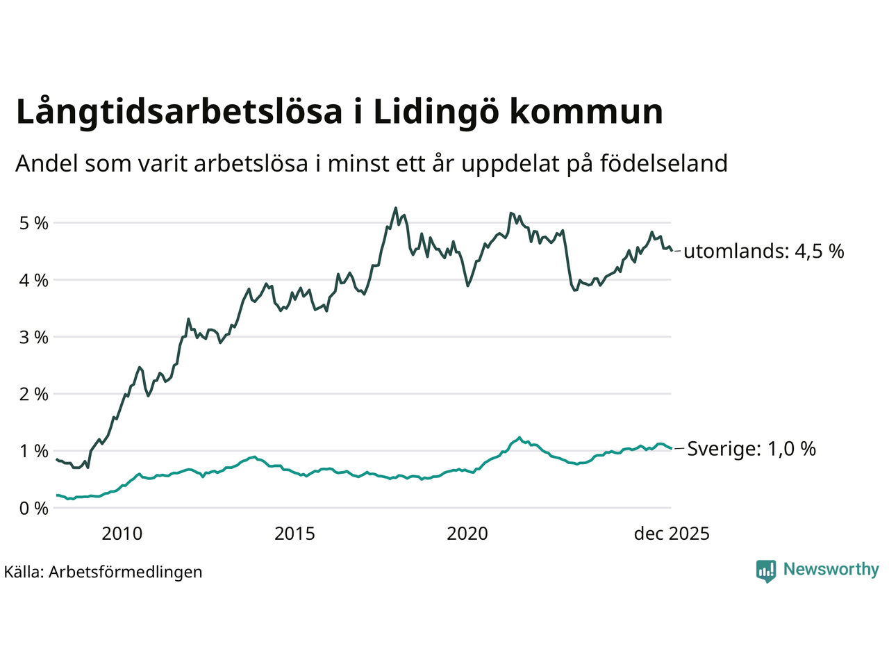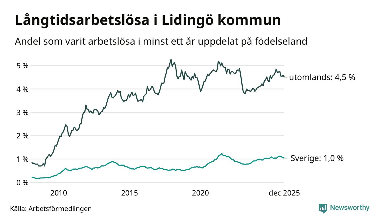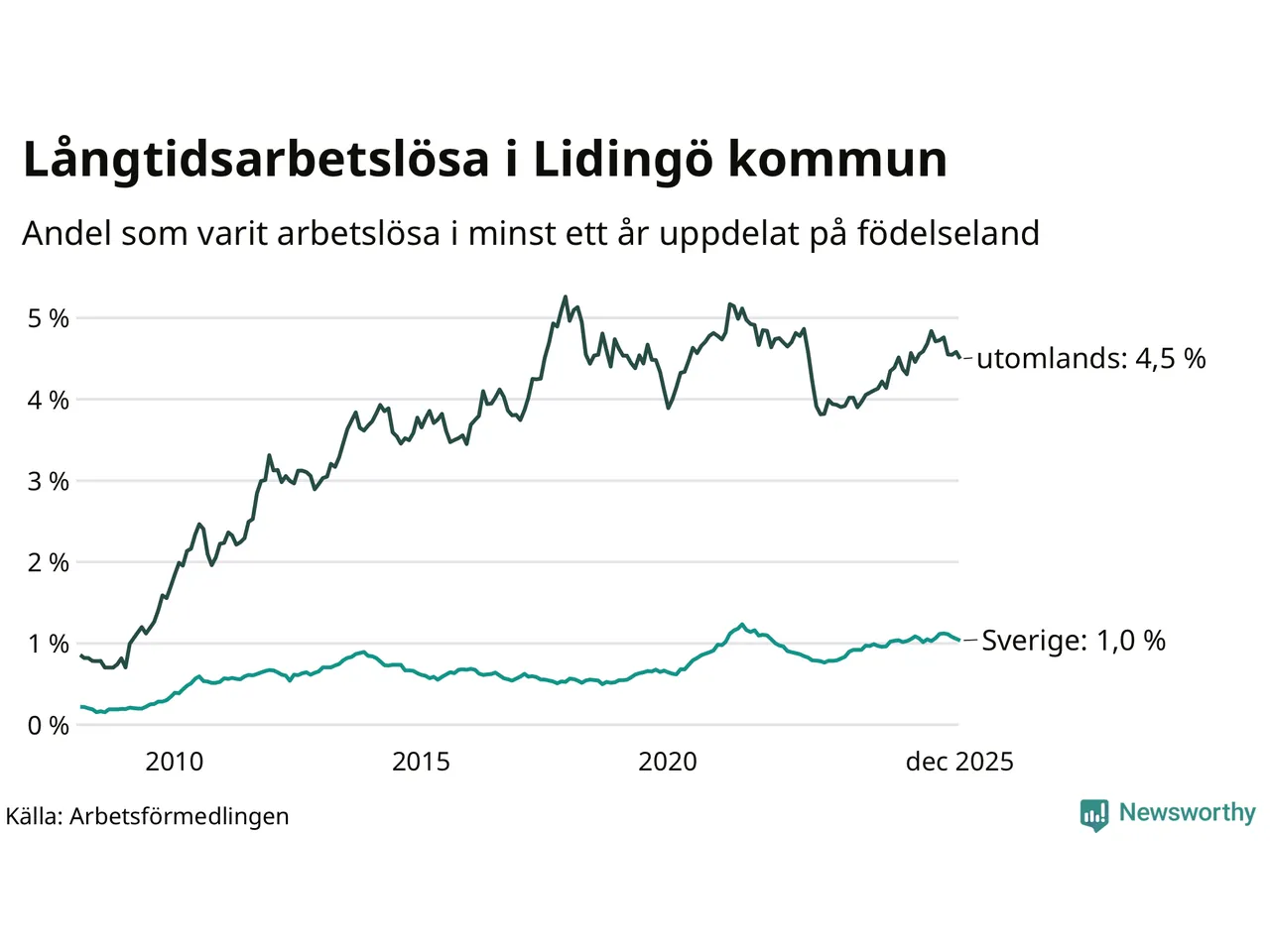 181 av de långtidsarbetslösa på Lidingö är födda i Sverige, medan 224 är födda utomlands. Det innebär att långtidsarbetslösheten bland Sverigefödda är 1,0 procent, medan den är fyra gånger så hög – 4,5 procent – bland födda utomlands. Även i riket som helhet är arbetslösheten högre bland utrikesfödda.