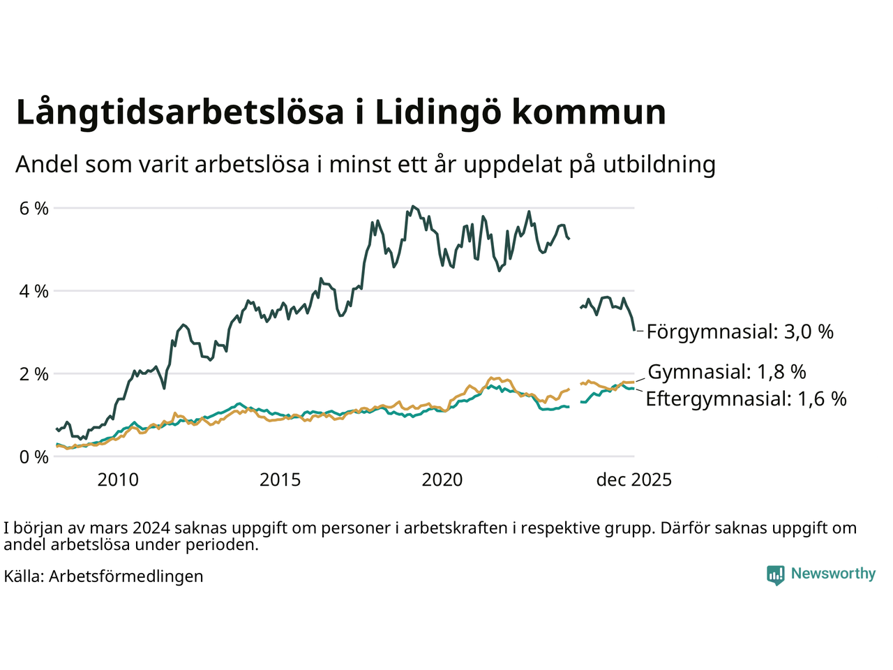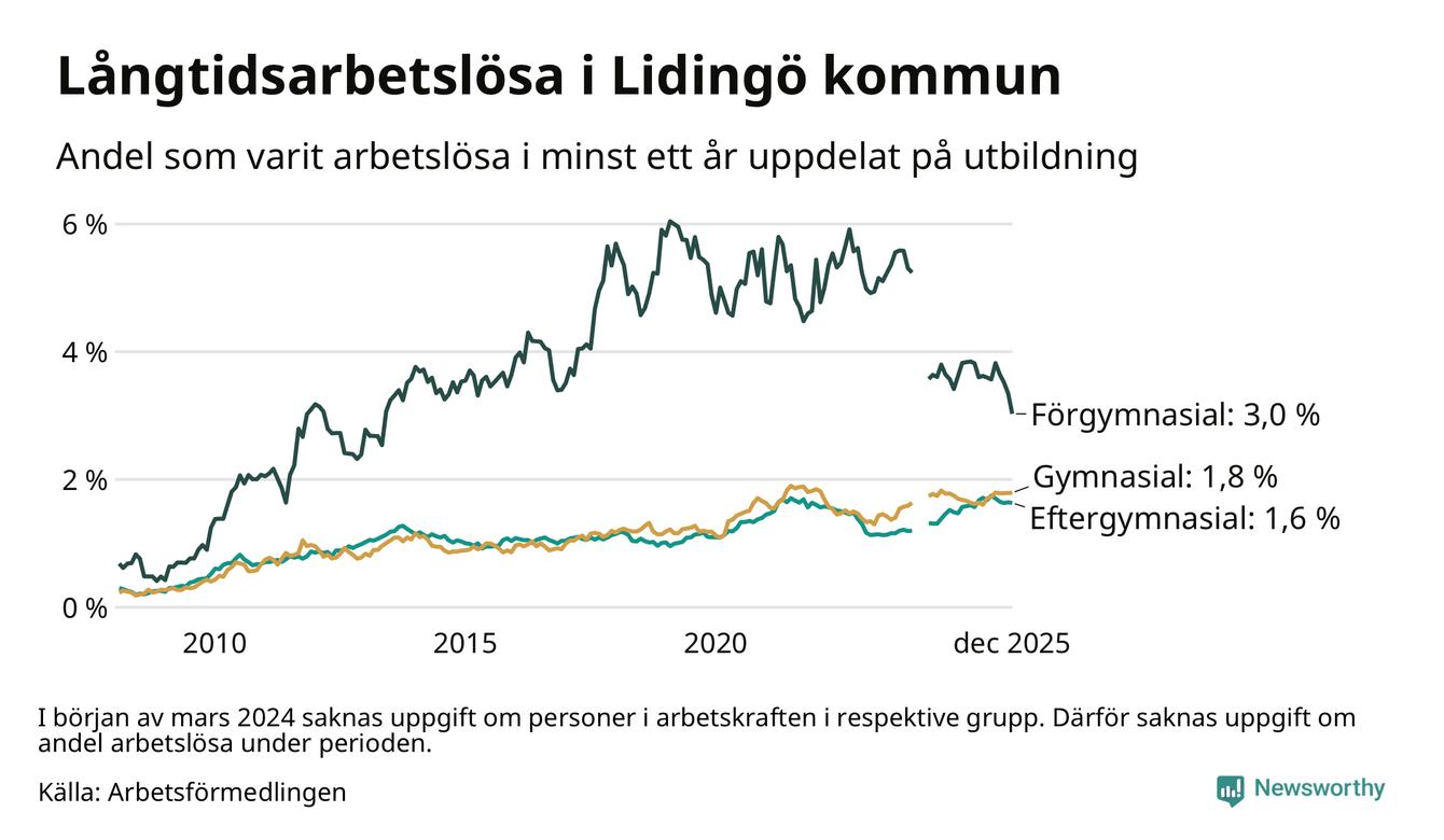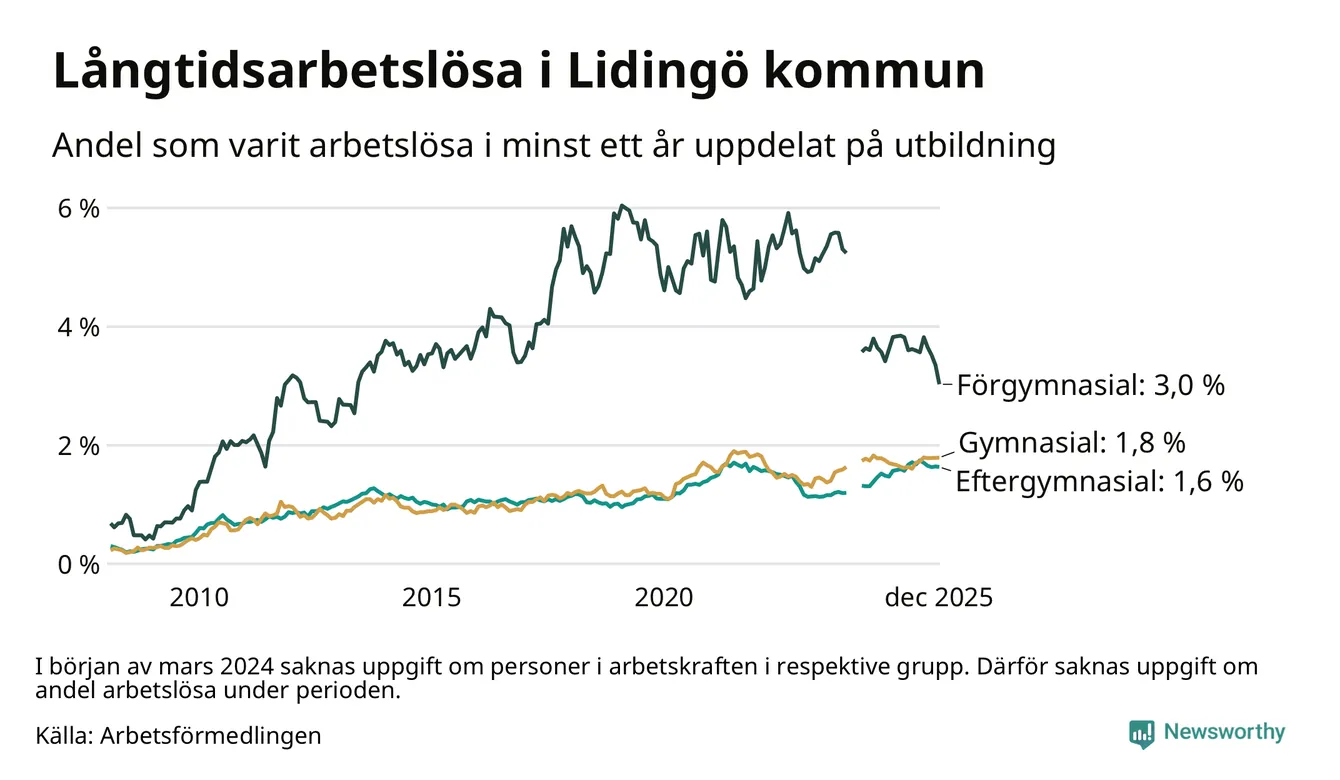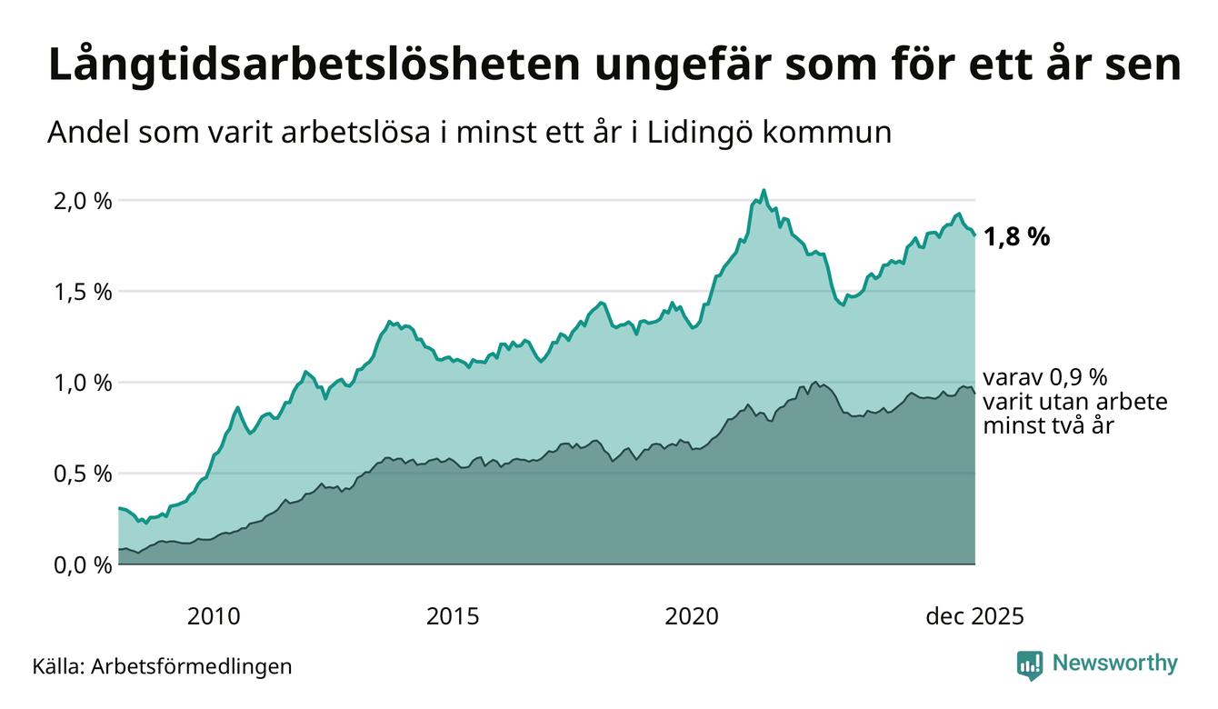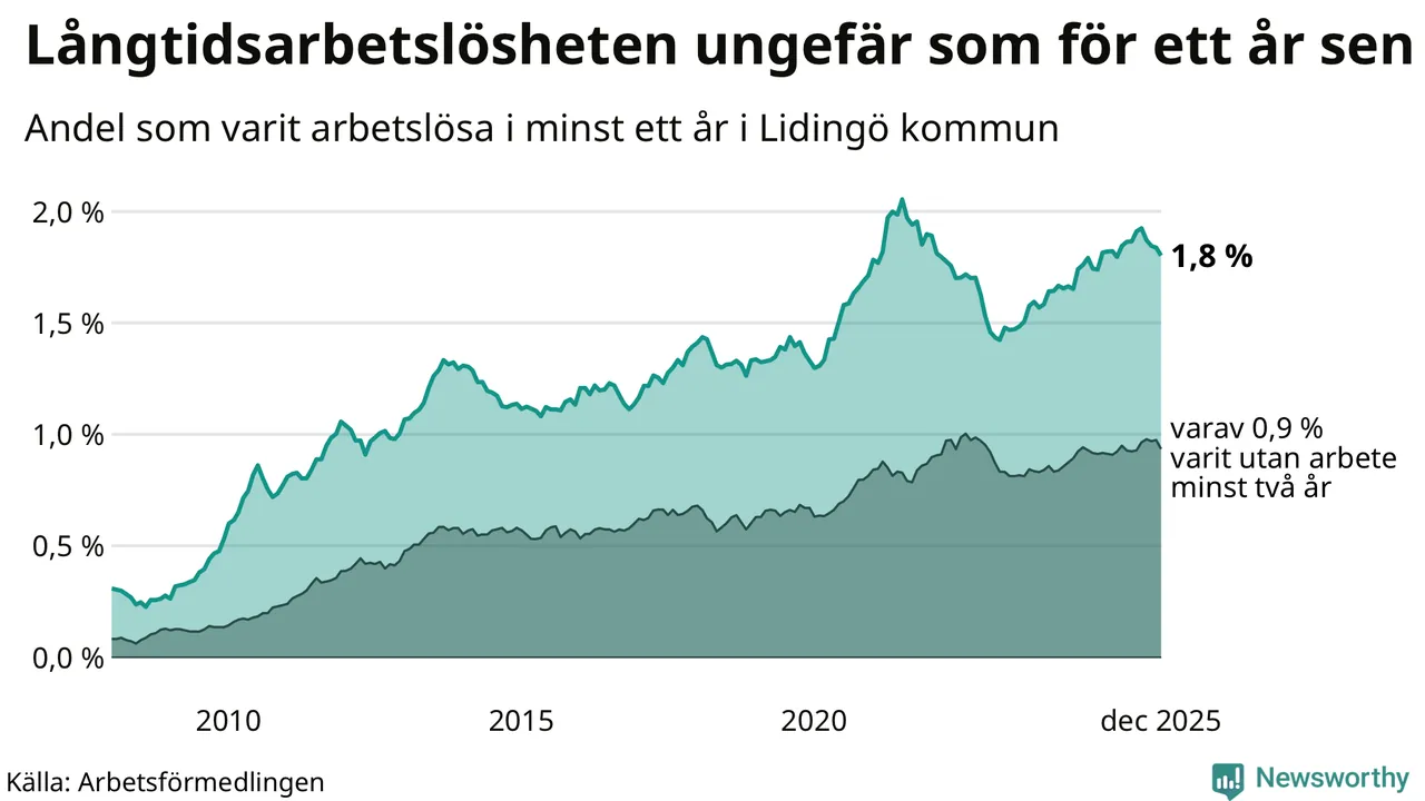 I december hade 405 Lidingöbor varit arbetslösa i minst ett år, vilket är åtta färre än månaden innan. Det är den fjärde månaden i rad med minskande antal långtidsarbetslösa. 405 personer motsvarar 1,8 procent av arbetskraften i kommunen – andelen långtidsarbetslösa är ungefär på samma nivå som för ett år sedan.