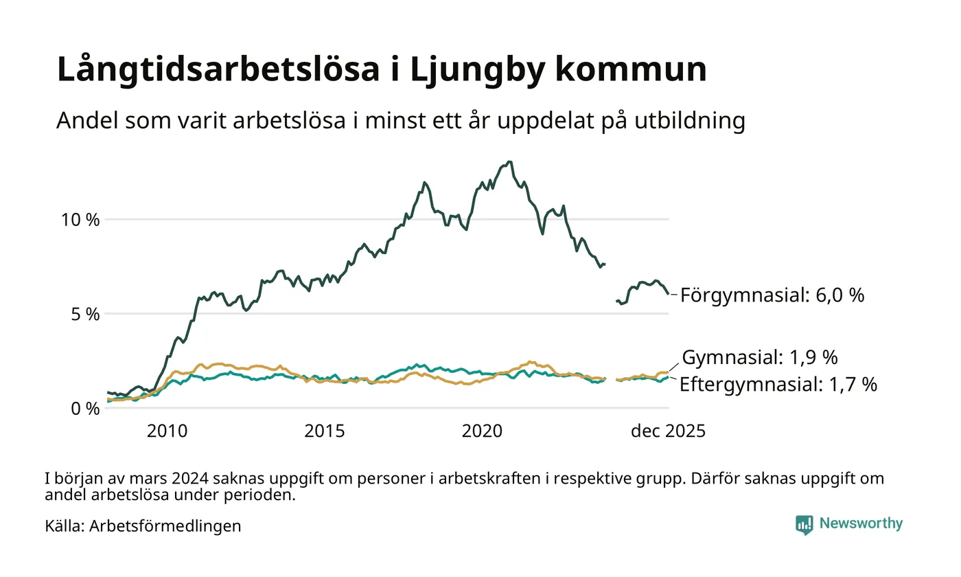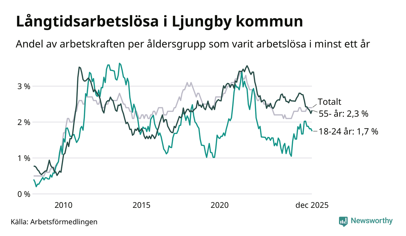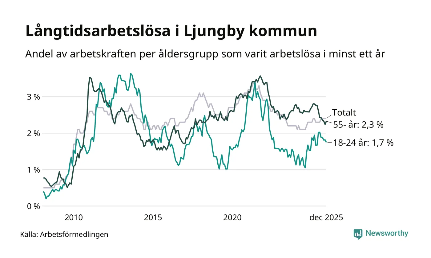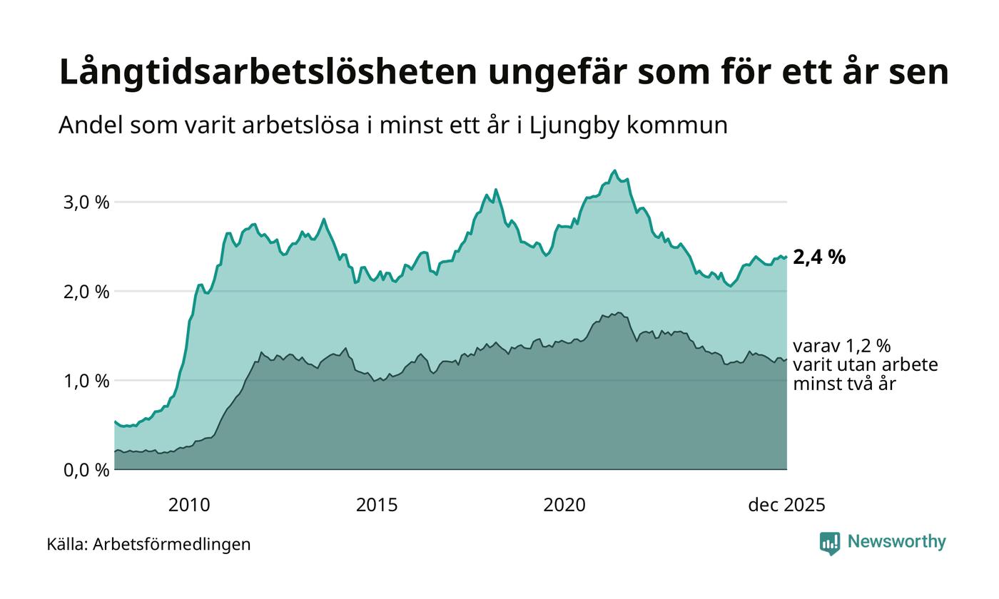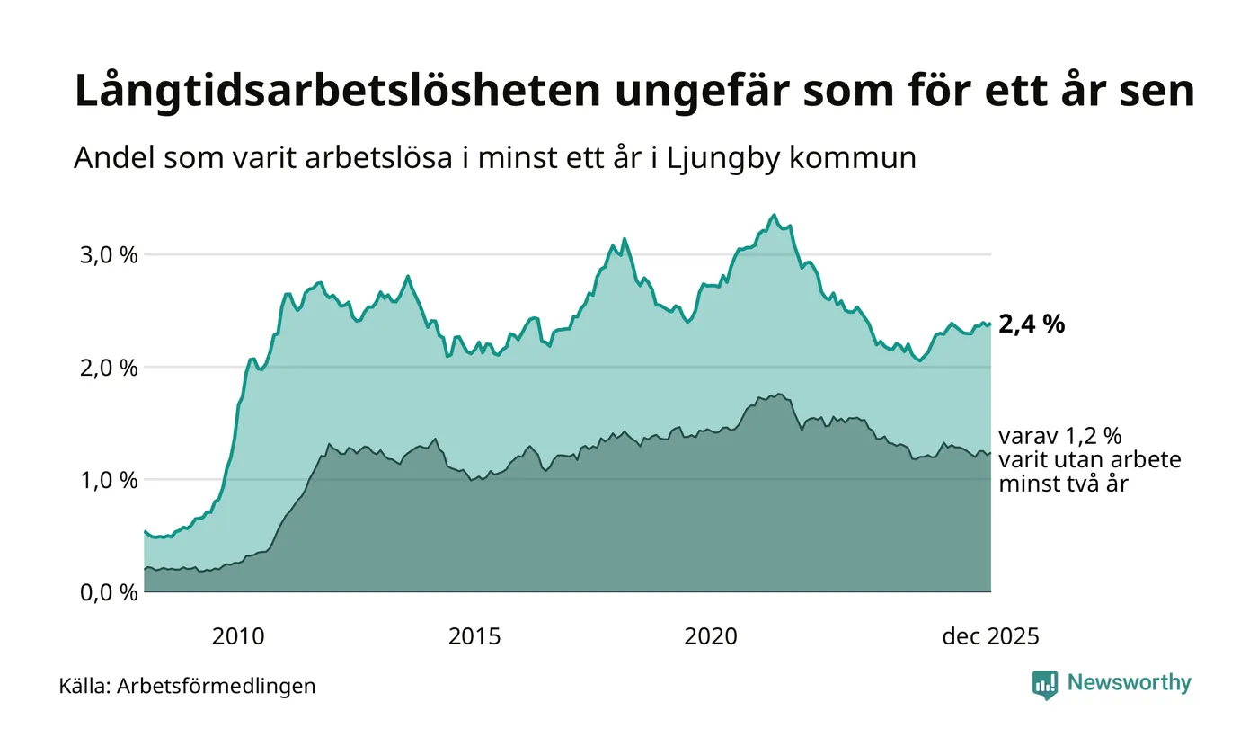 I december hade 330 Ljungbybor varit arbetslösa i minst ett år, vilket är tre fler än månaden innan. 330 personer motsvarar 2,4 procent av arbetskraften i kommunen – andelen långtidsarbetslösa är ungefär på samma nivå som för ett år sedan.