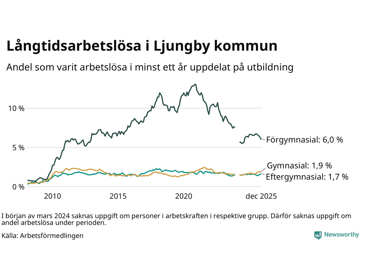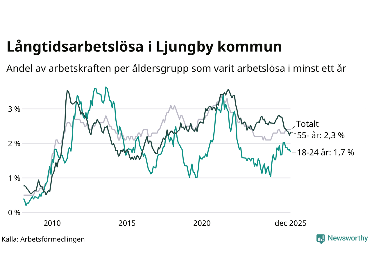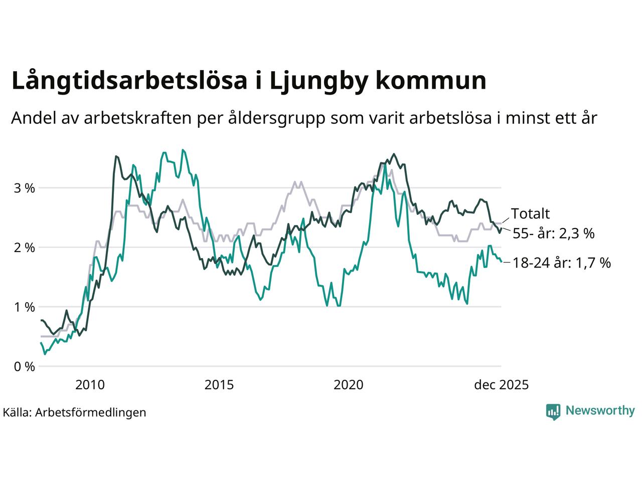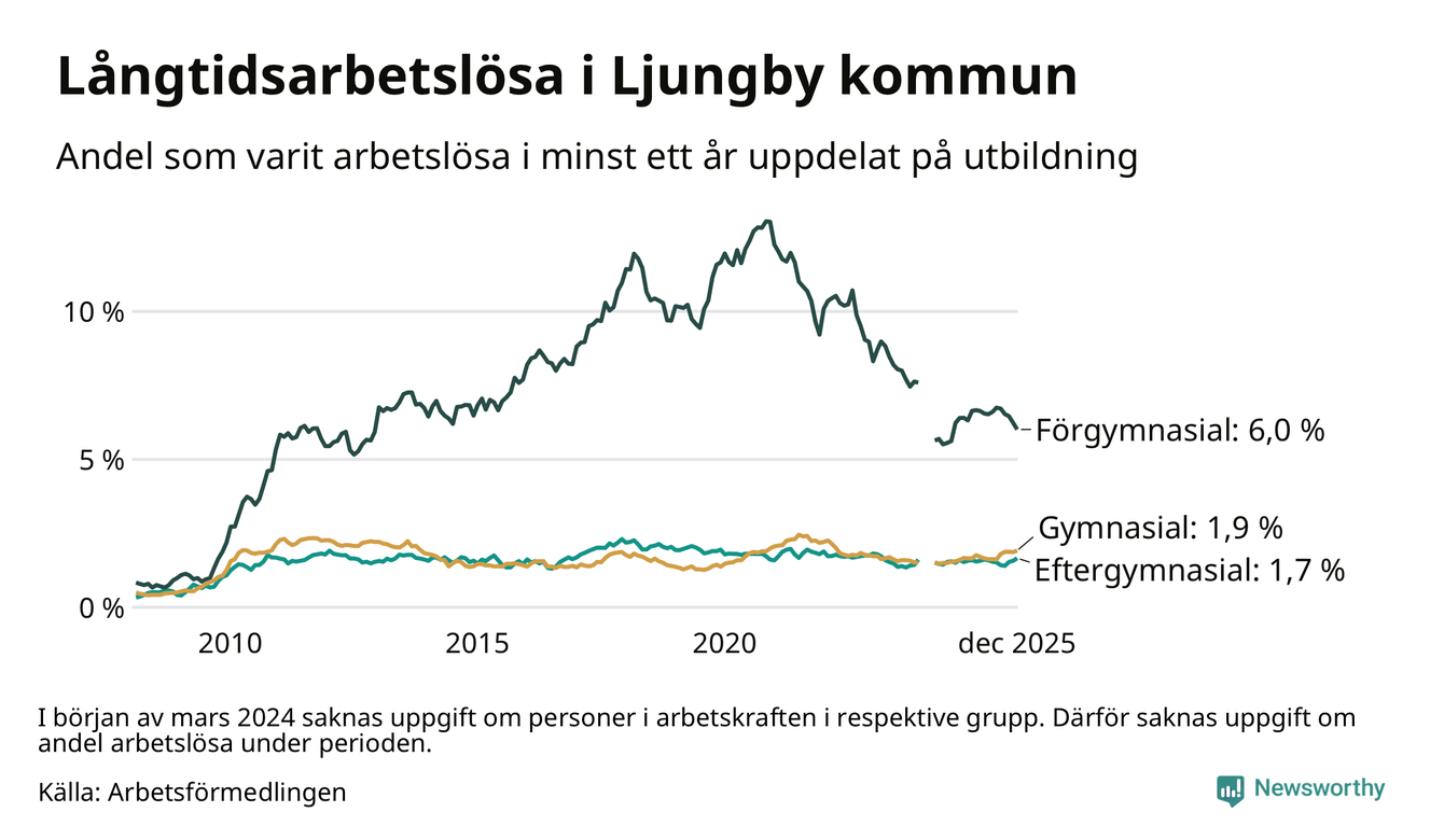 I december hade 330 Ljungbybor varit arbetslösa i minst ett år, vilket är tre fler än månaden innan. 330 personer motsvarar 2,4 procent av arbetskraften i kommunen – andelen långtidsarbetslösa är ungefär på samma nivå som för ett år sedan.
