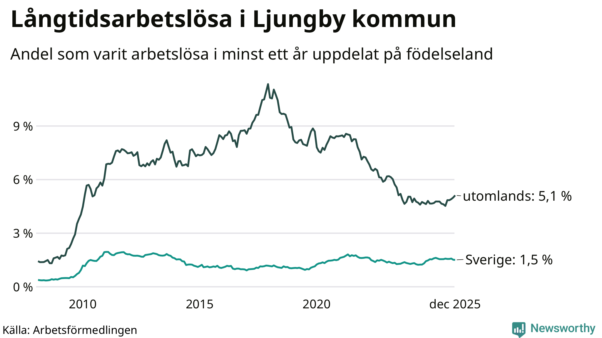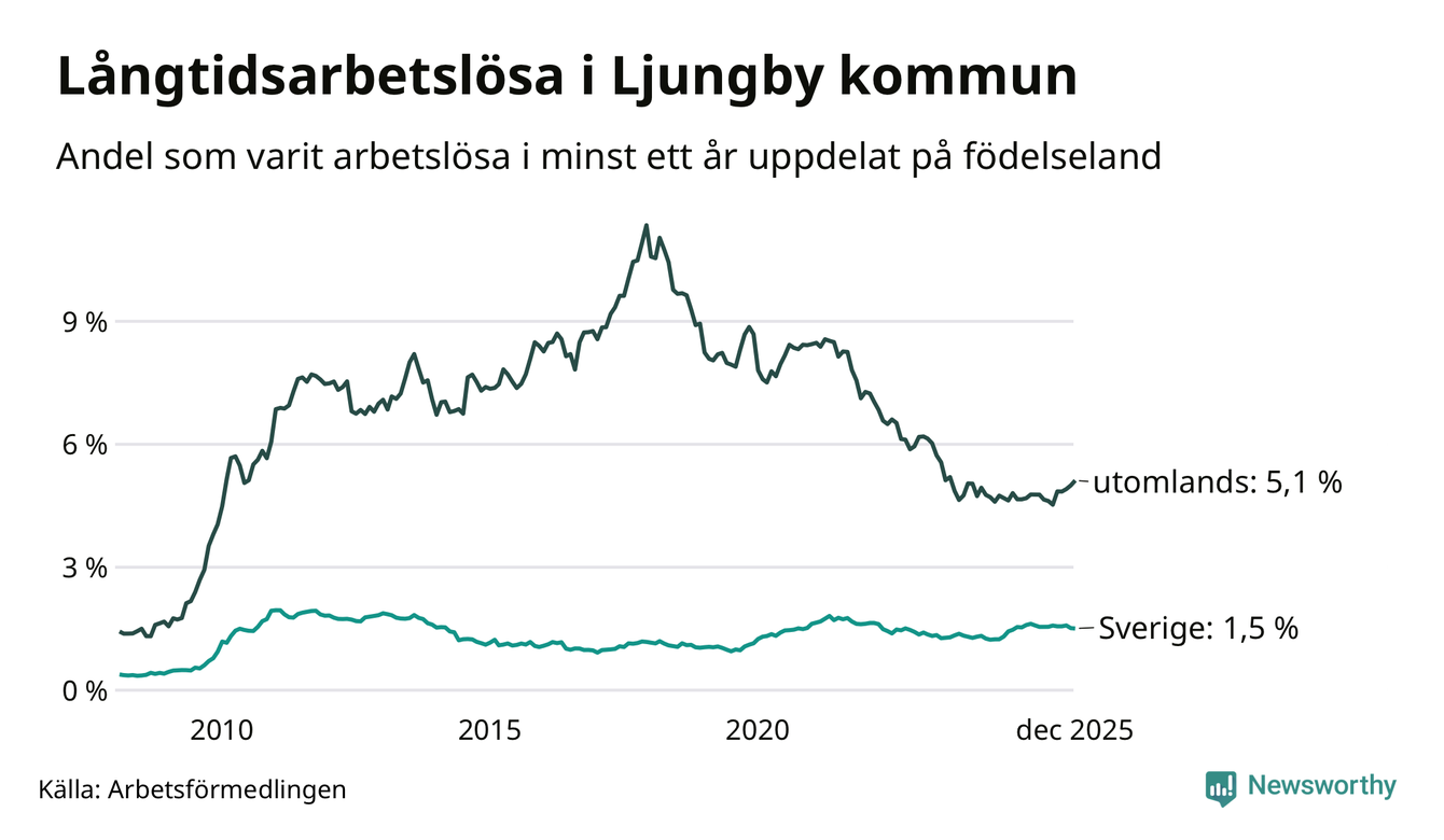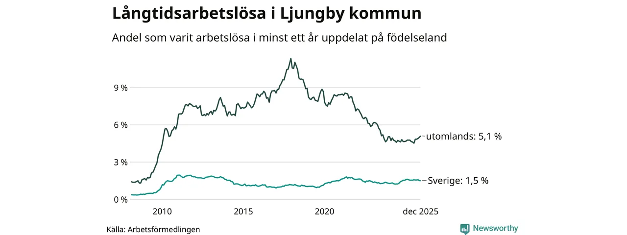 157 av de långtidsarbetslösa i Ljungby är födda i Sverige, medan 173 är födda utomlands. Det innebär att långtidsarbetslösheten bland Sverigefödda är 1,5 procent, medan den är tre gånger så hög – 5,1 procent – bland födda utomlands. Även i riket som helhet är arbetslösheten högre bland utrikesfödda.