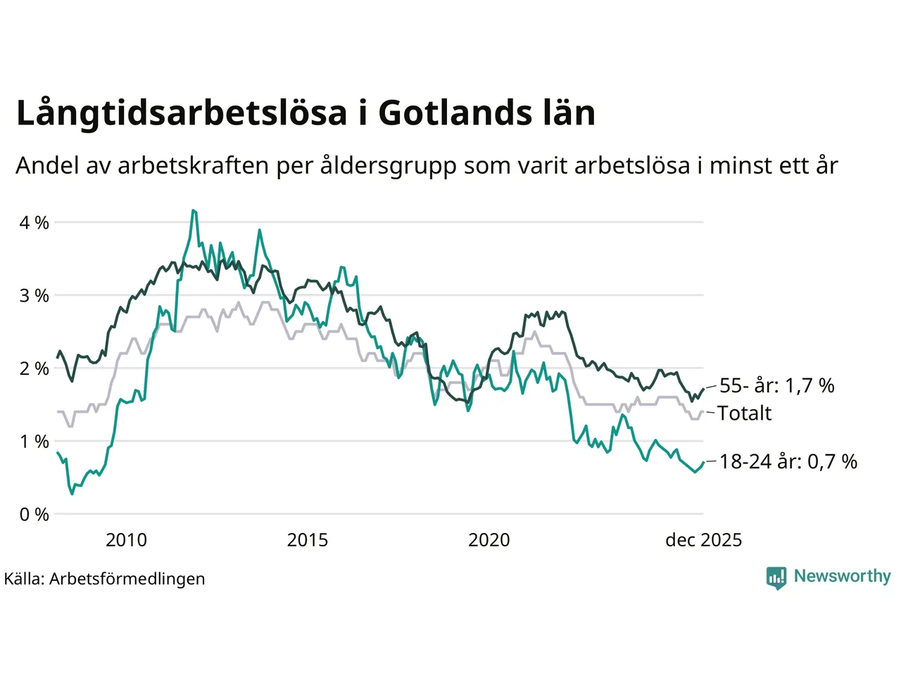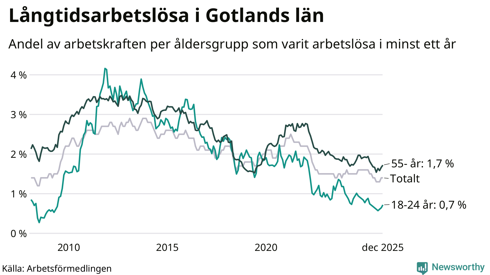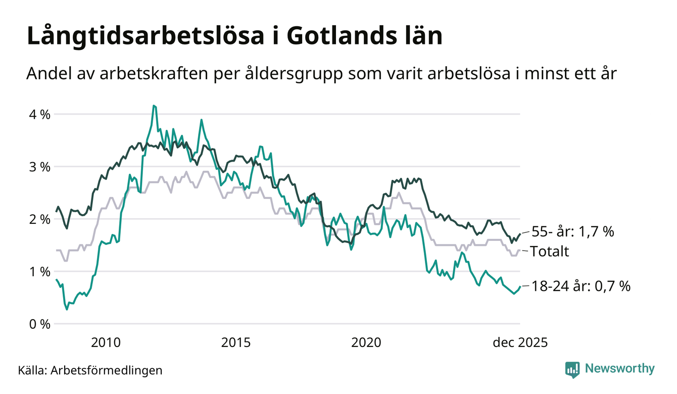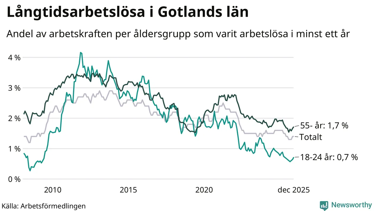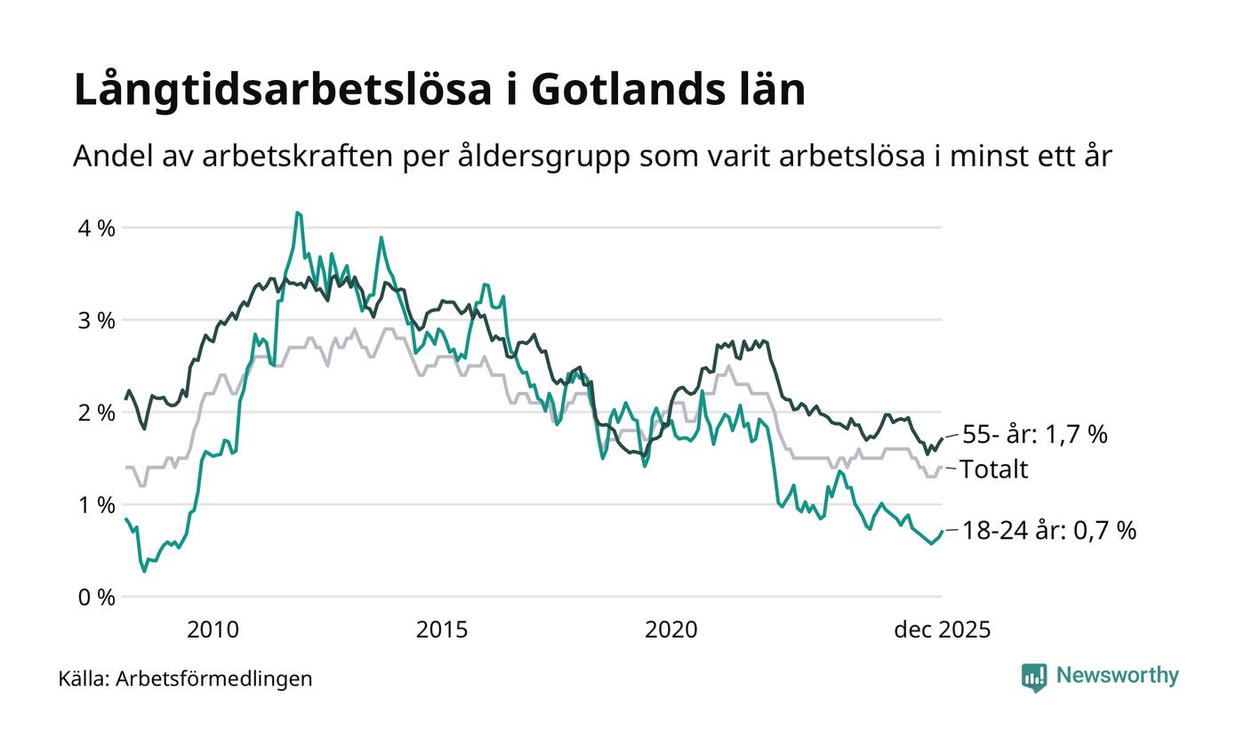 Av de 401 personerna som varit arbetslösa i mer än ett år i Gotlands län är 126 personer mellan 55 och 651 år och 20 är mellan 18 och 24 år. För den äldre gruppen är andelen arbetslösa 1,7 procent medan den i den yngre gruppen är 0,7 procent. Även i riket som helhet är långtidsarbetslösheten högre i gruppen äldre.
