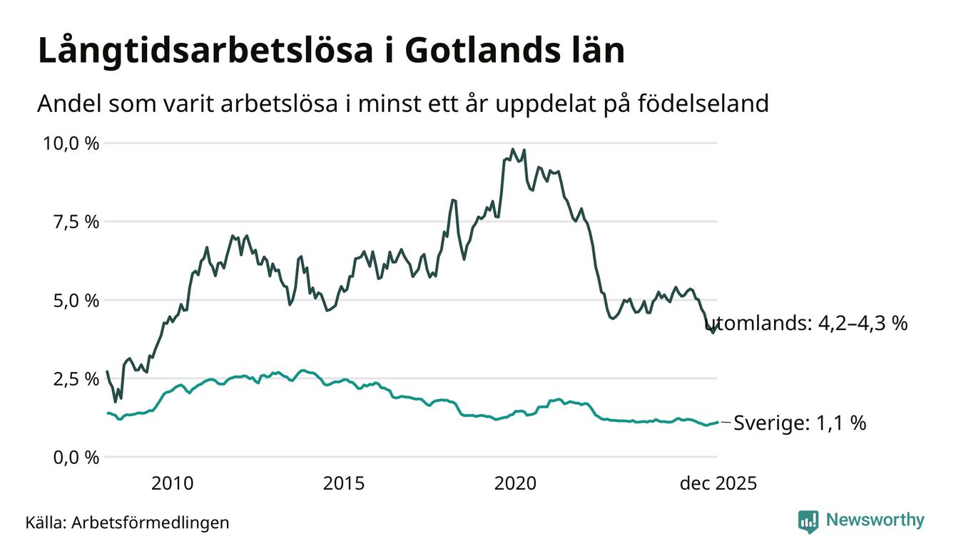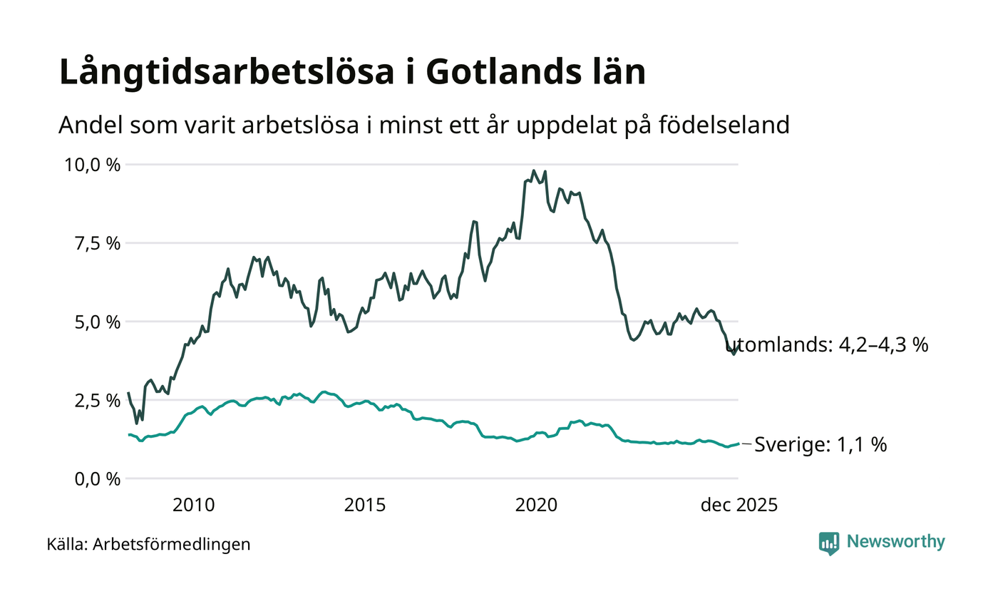 282 av de långtidsarbetslösa på Gotland är födda i Sverige och mellan 120 och 123 är födda utomlands. Det innebär att långtidsarbetslösheten bland Sverigefödda är 1,1 procent, medan den ligger mellan 4,2 och 4,3 procent för utlandsfödda.