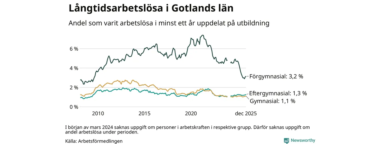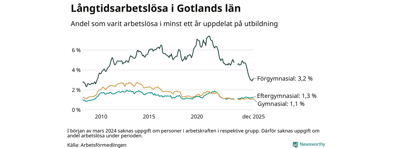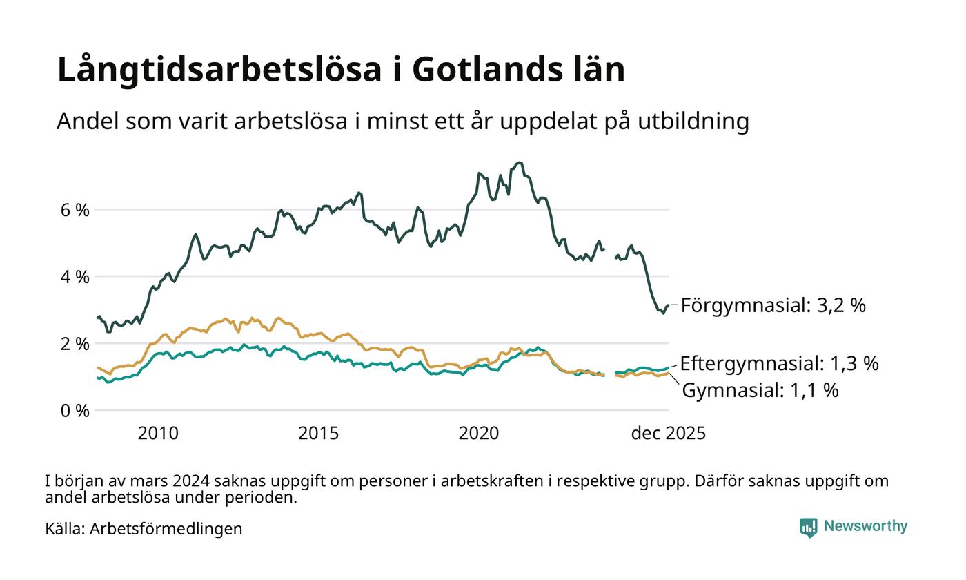I december hade 401 Gotlandsbor varit arbetslösa i minst ett år, vilket är tolv fler än månaden innan. Det är den fjärde månaden i rad med ökande antal långtidsarbetslösa. 401 personer motsvarar 1,4 procent av arbetskraften i länet – andelen långtidsarbetslösa är ungefär på samma nivå som för ett år sedan. Gotlands län hade tredje lägst andel långtidsarbetslösa i landet i december.