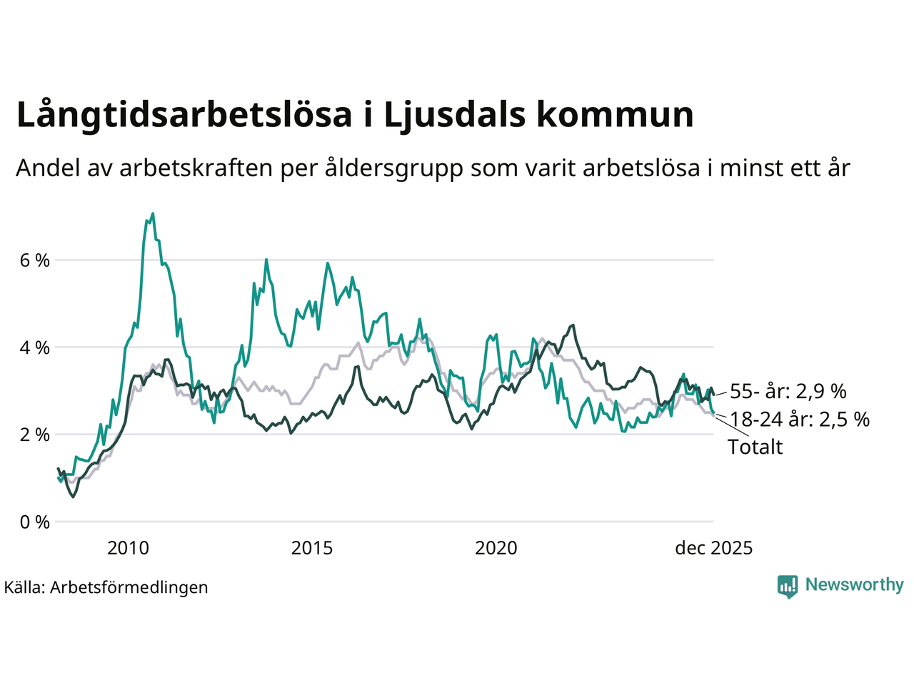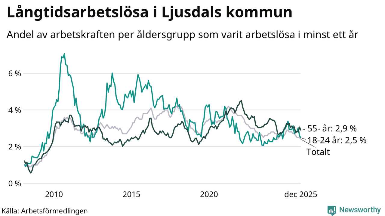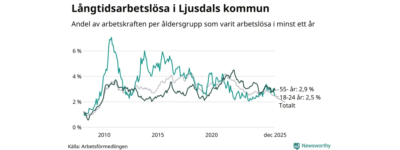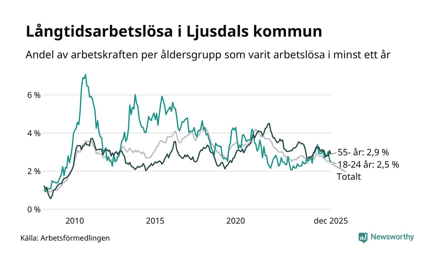 Av de 207 personerna som varit arbetslösa i mer än ett år i Ljusdals kommun är 63 personer mellan 55 och 651 år och 23 är mellan 18 och 24 år. För den äldre gruppen är andelen arbetslösa 2,9 procent medan den i den yngre gruppen är 2,5 procent. Även i riket som helhet är långtidsarbetslösheten högre i gruppen äldre.