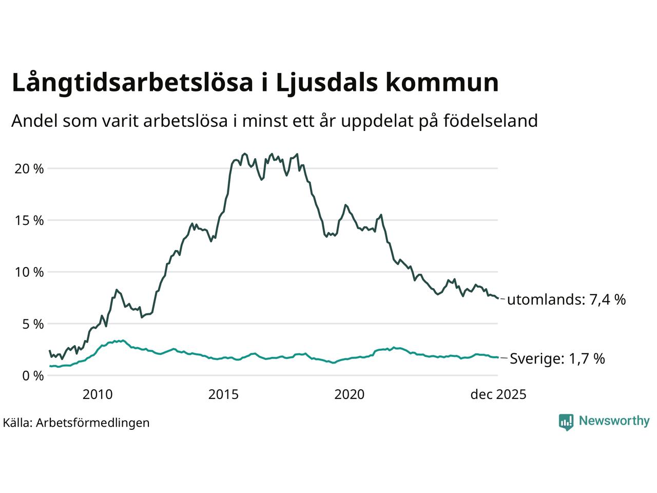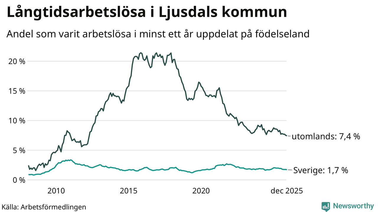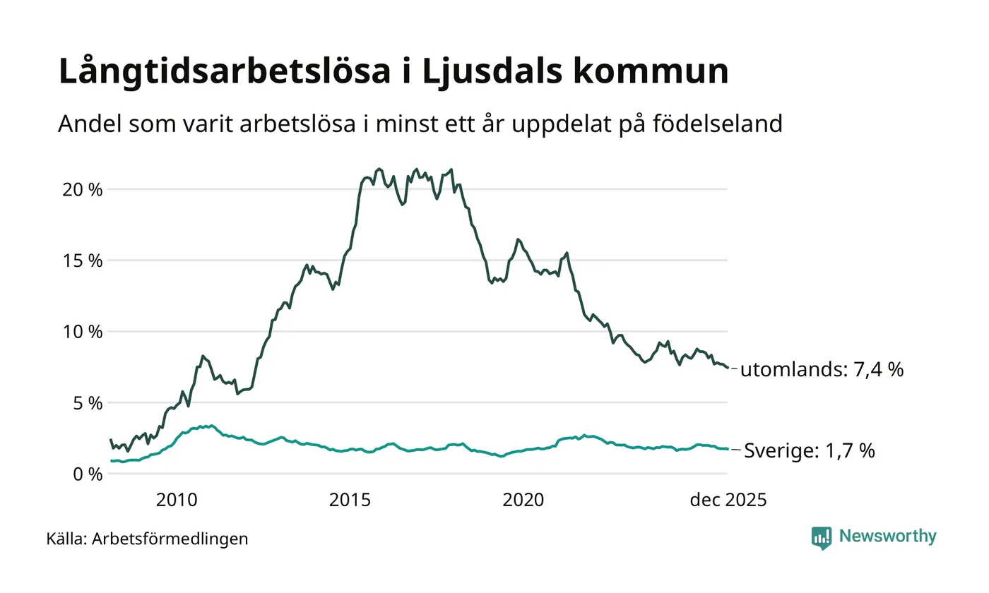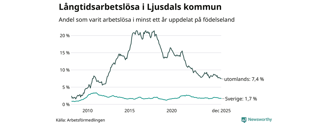 126 av de långtidsarbetslösa i Ljusdal är födda i Sverige, medan 81 är födda utomlands. Det innebär att långtidsarbetslösheten bland Sverigefödda är 1,7 procent, medan den är fyra gånger så hög – 7,4 procent – bland födda utomlands. Även i riket som helhet är arbetslösheten högre bland utrikesfödda.