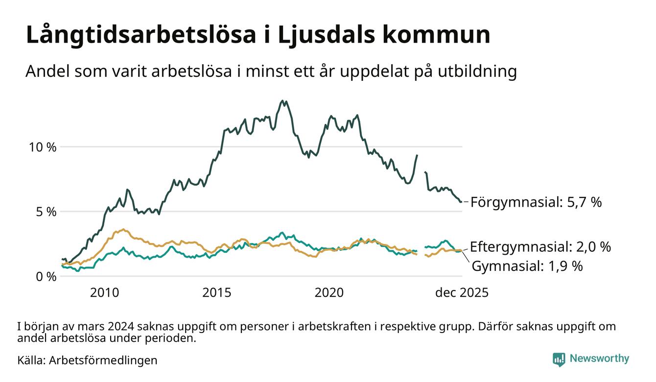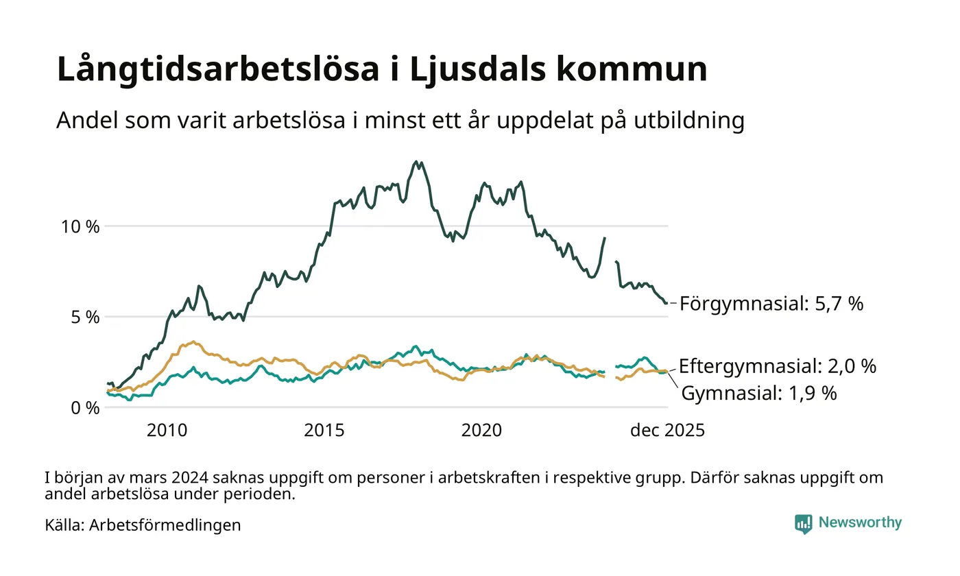 Antalet långtidsarbetslösa minskade i Ljusdal i december jämfört med månaden innan. Därmed har antalet långtidsarbetslösa minskat varje månad sedan i januari 2025.