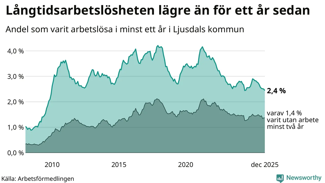 I december hade 207 Ljusdalsbor varit arbetslösa i minst ett år, vilket är fem färre än månaden innan. Det är den elfte månaden i rad med minskande antal långtidsarbetslösa. 207 personer motsvarar 2,4 procent av arbetskraften i kommunen – andelen långtidsarbetslösa är 0,3 procentenheter lägre än samma månad för ett år sedan.