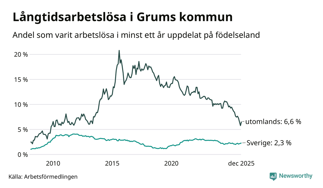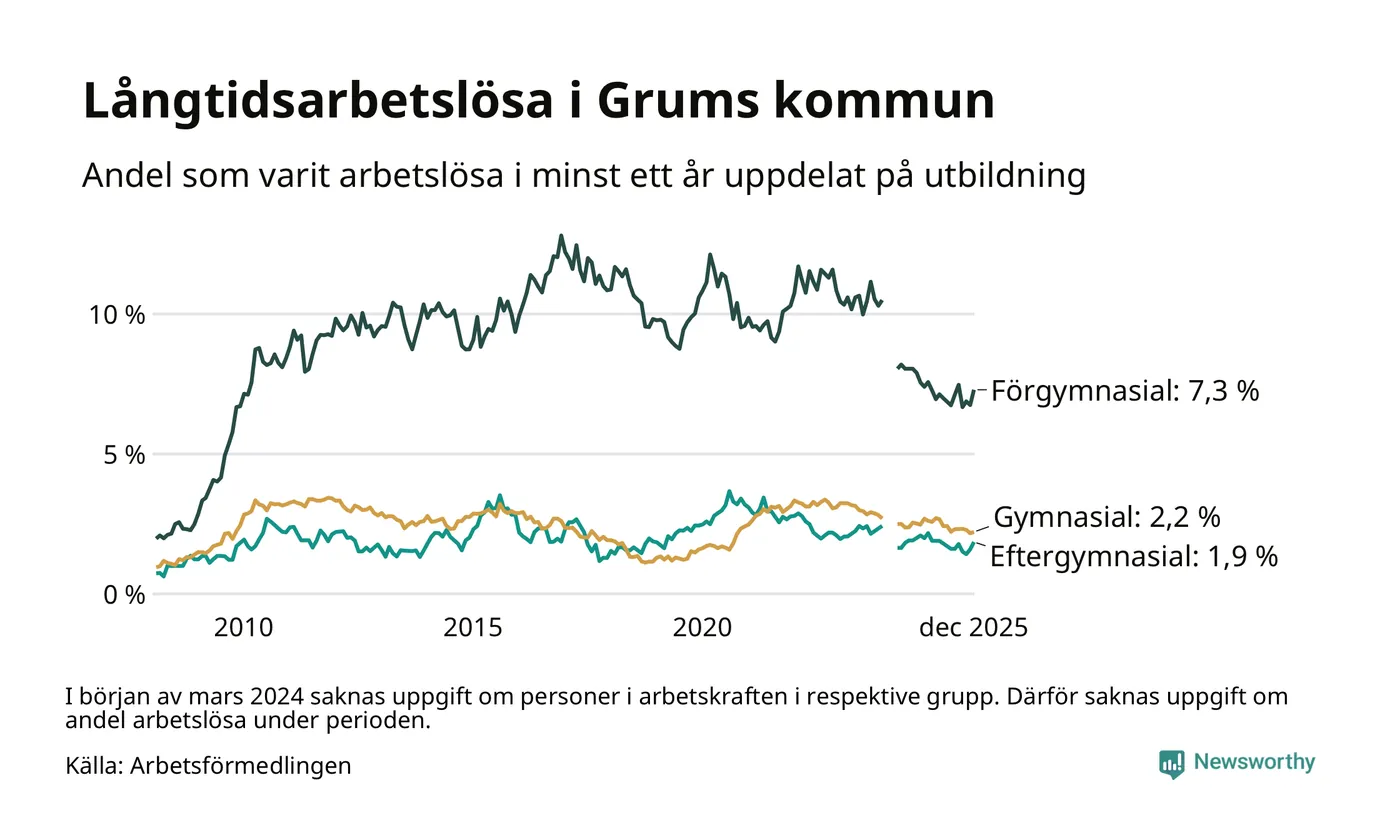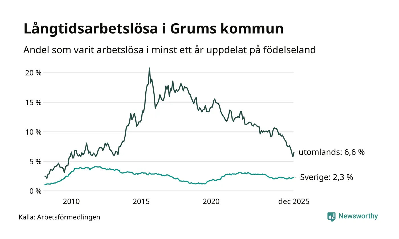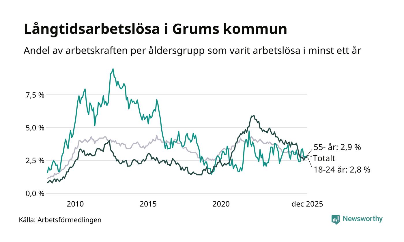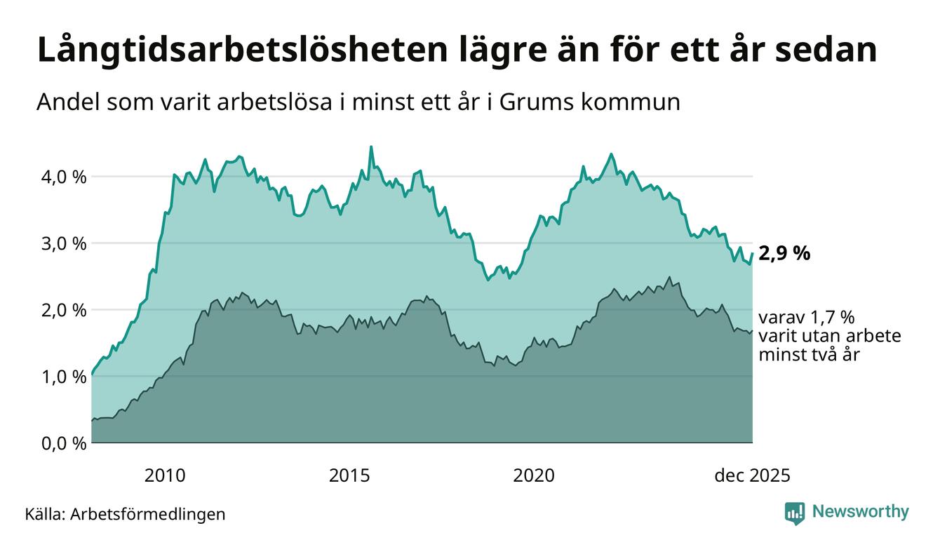 I december hade 115 Grumsbor varit arbetslösa i minst ett år, vilket är sju fler än månaden innan. 115 personer motsvarar 2,9 procent av arbetskraften i kommunen – andelen långtidsarbetslösa är 0,3 procentenheter lägre än samma månad för ett år sedan.