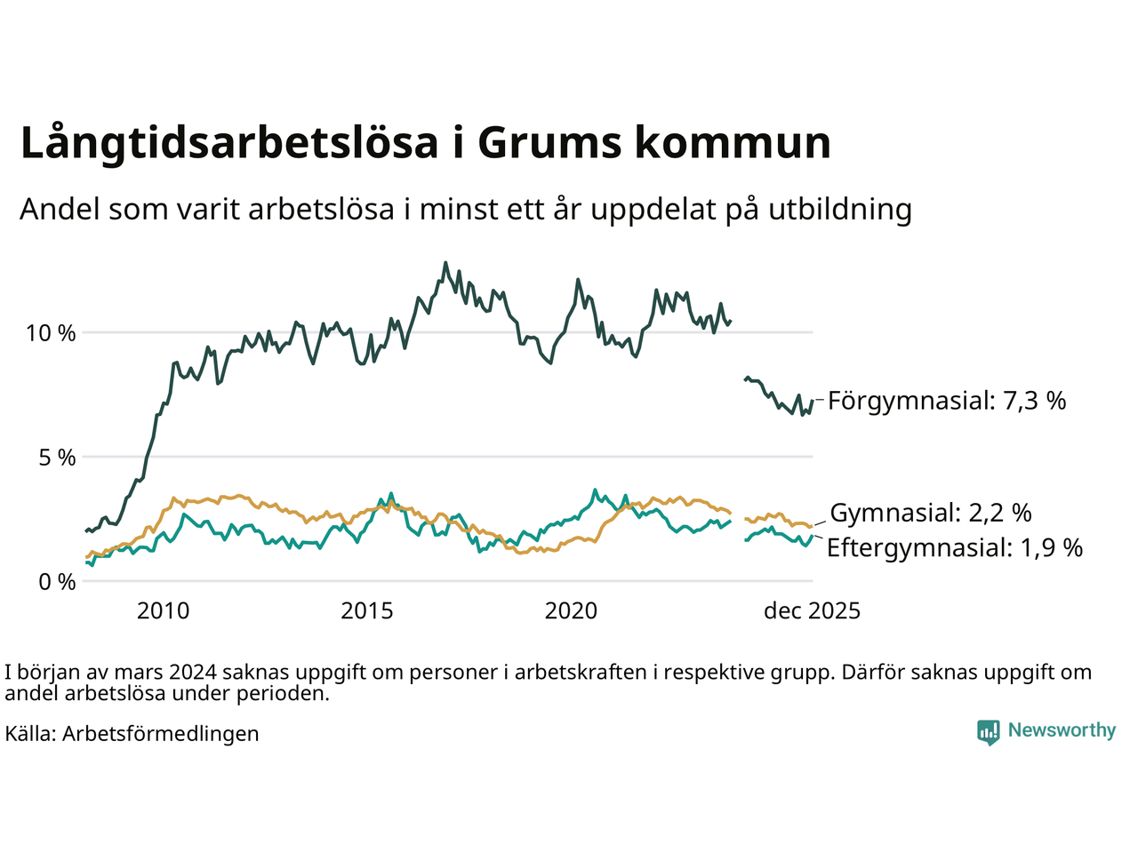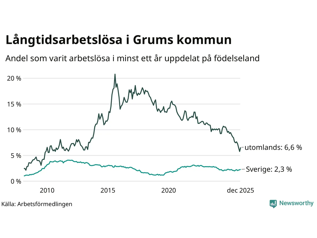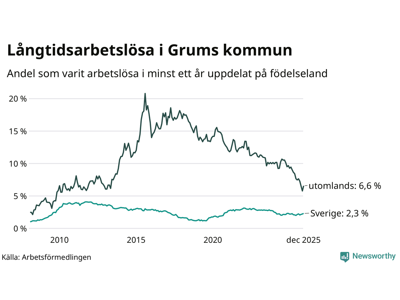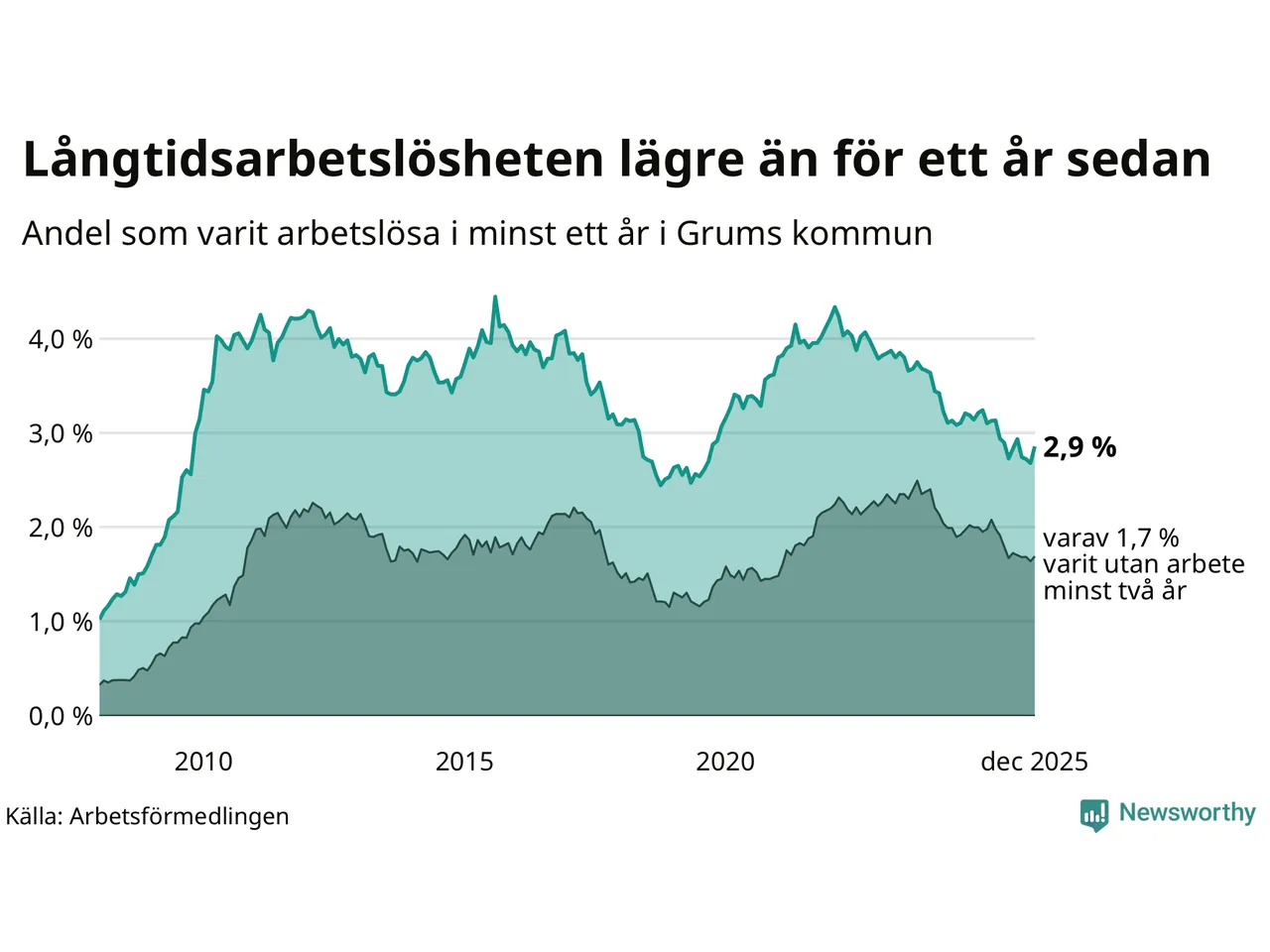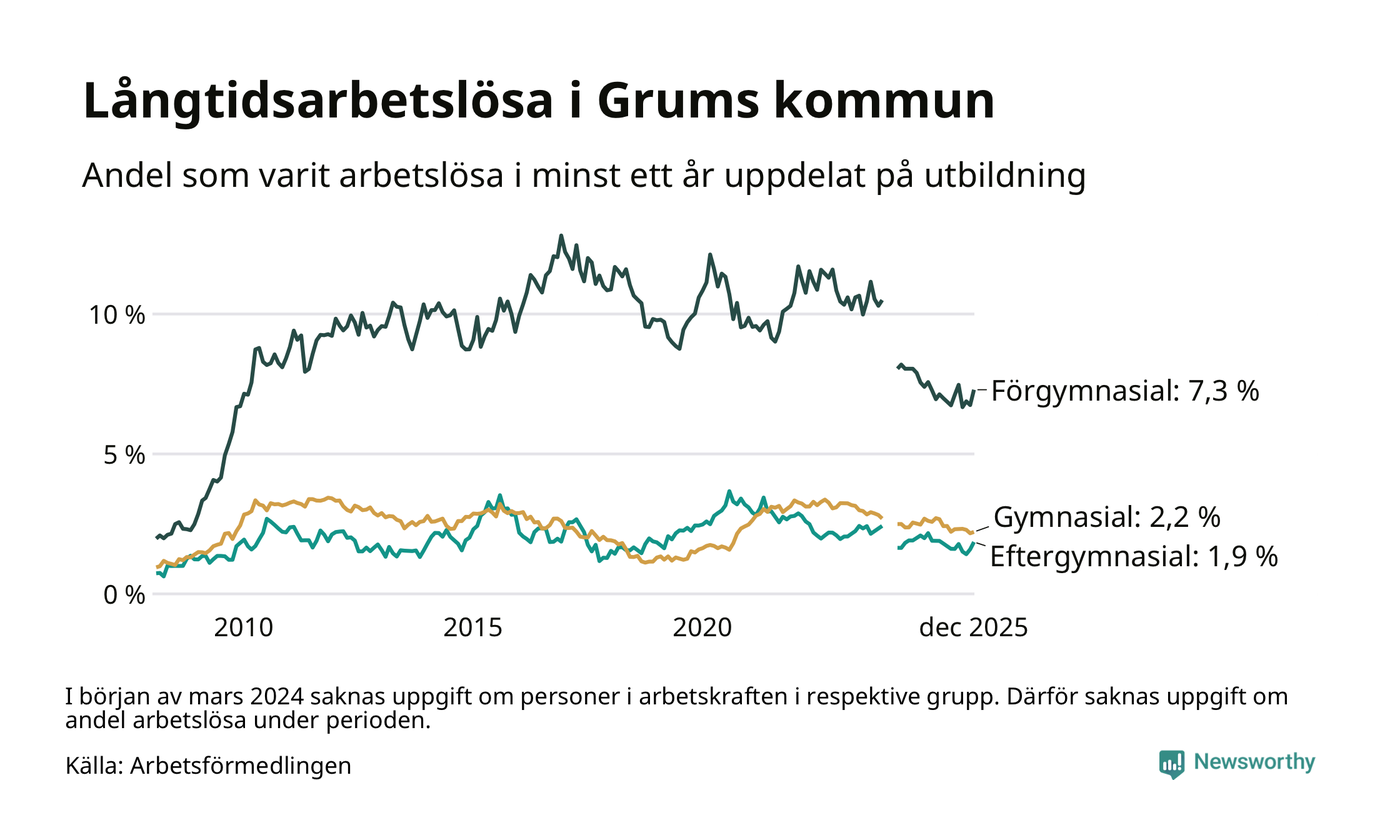 I december hade 115 Grumsbor varit arbetslösa i minst ett år, vilket är sju fler än månaden innan. 115 personer motsvarar 2,9 procent av arbetskraften i kommunen – andelen långtidsarbetslösa är 0,3 procentenheter lägre än samma månad för ett år sedan.
