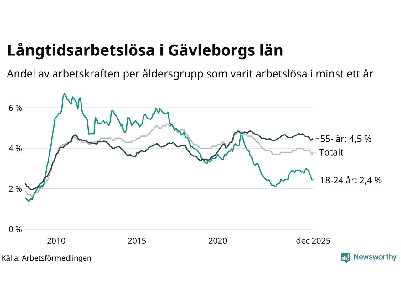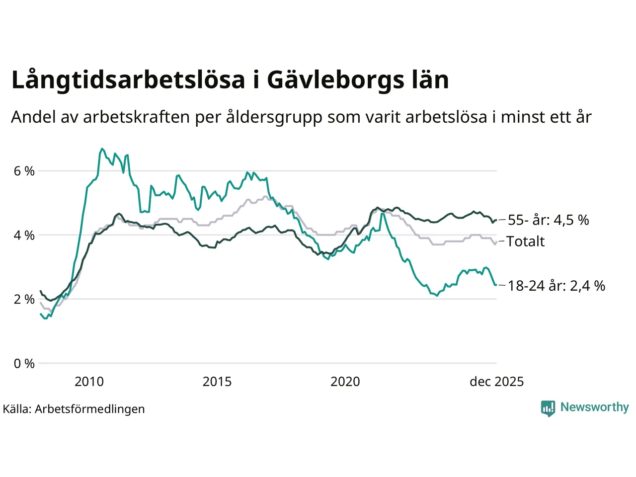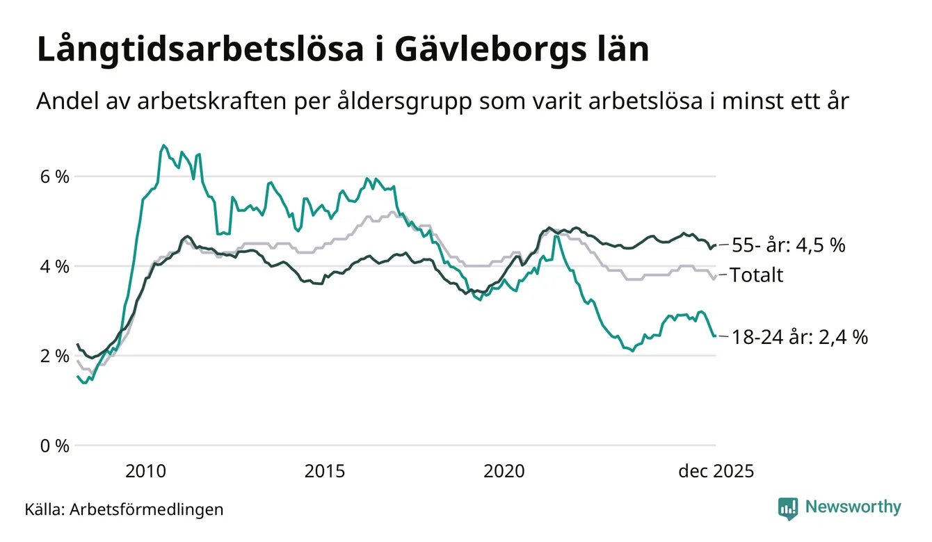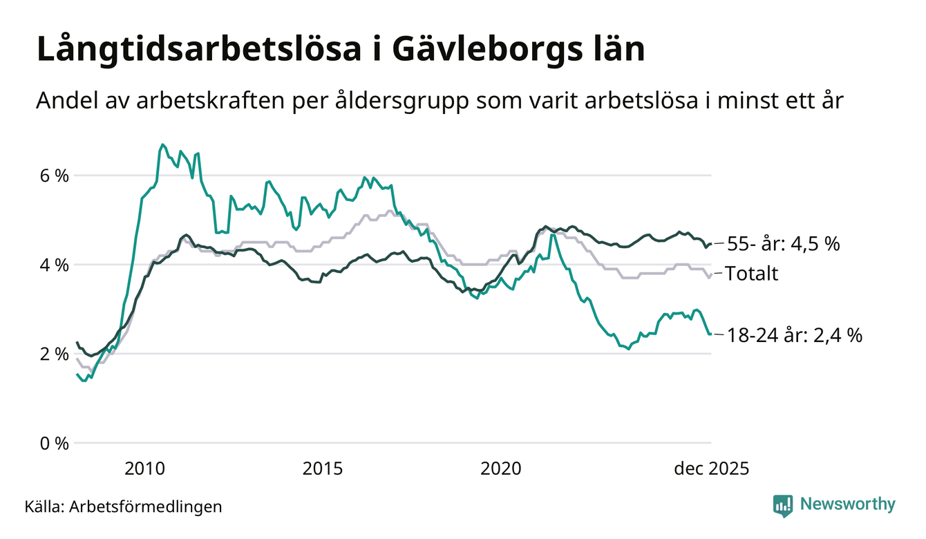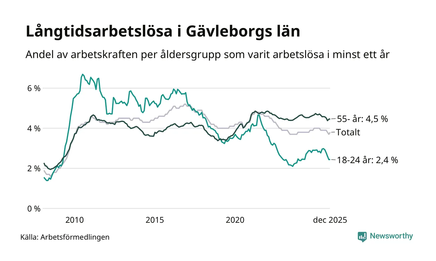 Av de 5 114 personerna som varit arbetslösa i mer än ett år i Gävleborgs län är 1 466 personer mellan 55 och 651 år och 344 är mellan 18 och 24 år. För den äldre gruppen är andelen arbetslösa 4,5 procent medan den i den yngre gruppen är 2,4 procent. Även i riket som helhet är långtidsarbetslösheten högre i gruppen äldre.