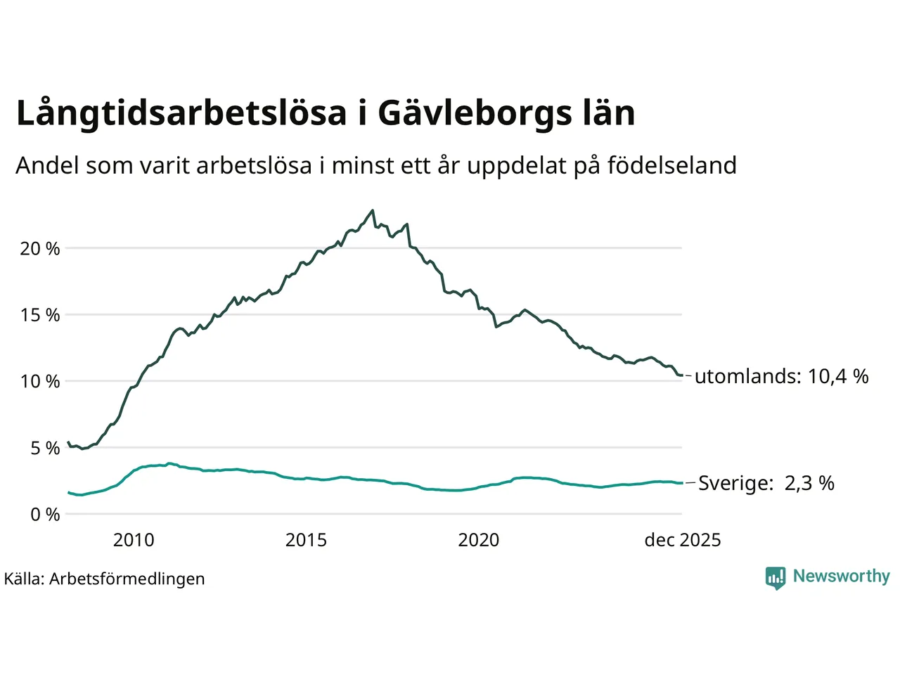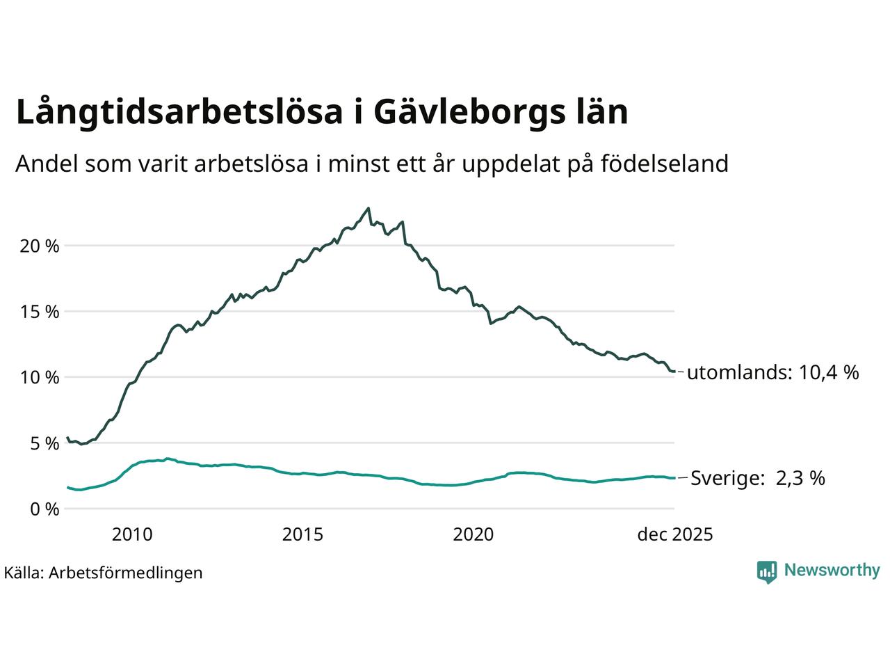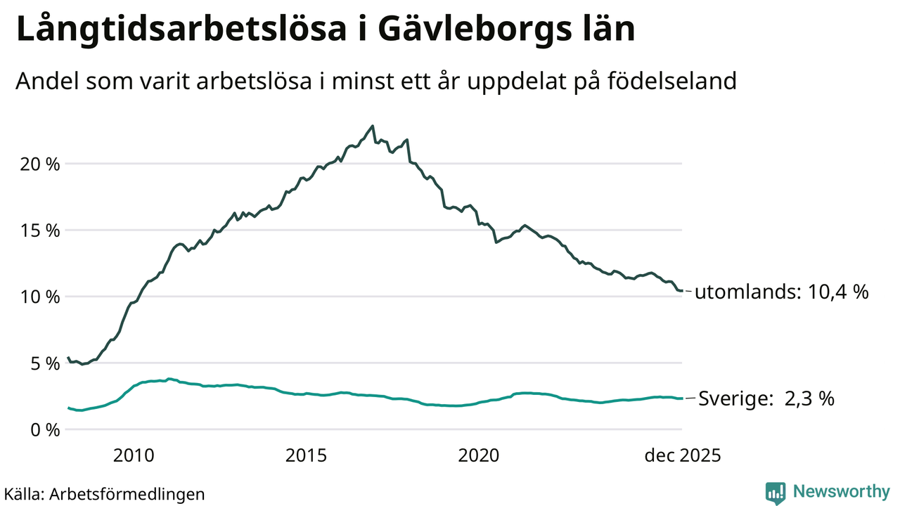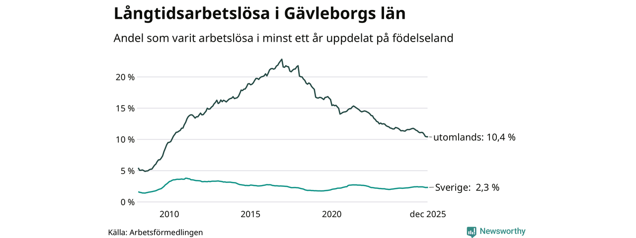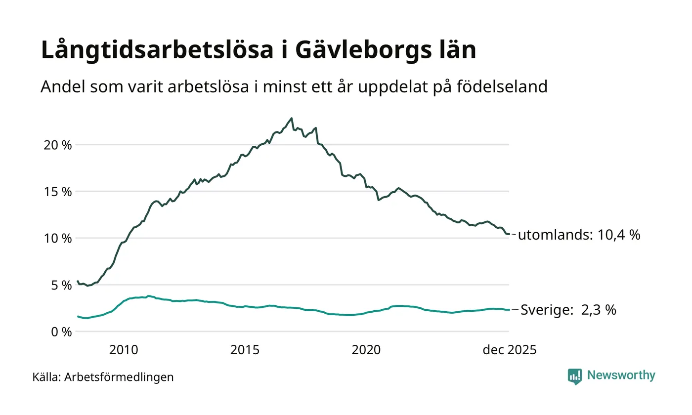 2 601 av de långtidsarbetslösa i Gävleborg är födda i Sverige och mellan 2 514 och 2 517 är födda utomlands. Det innebär att långtidsarbetslösheten bland Sverigefödda är 2,3 procent, medan den ligger på 10,4 procent för utlandsfödda.