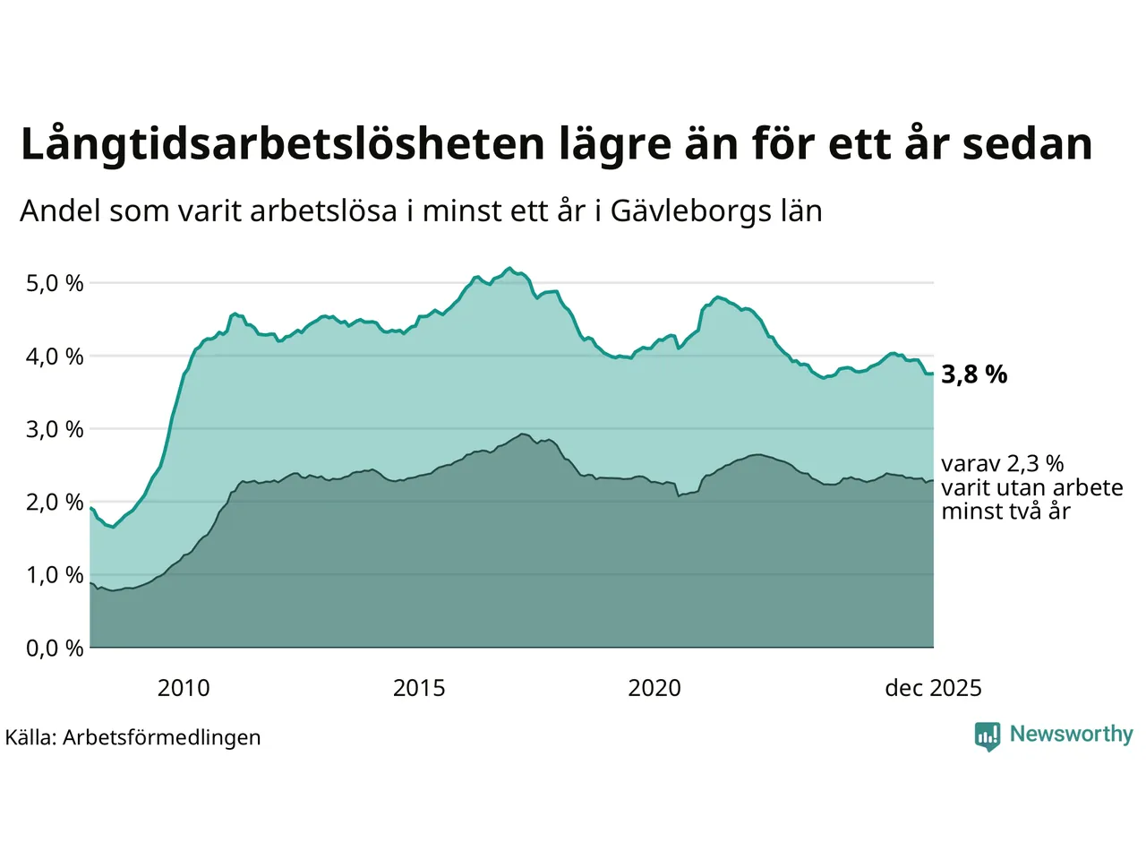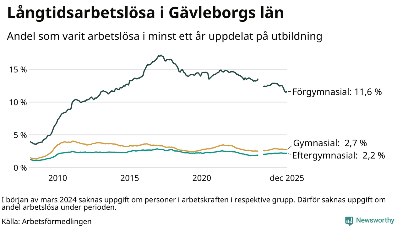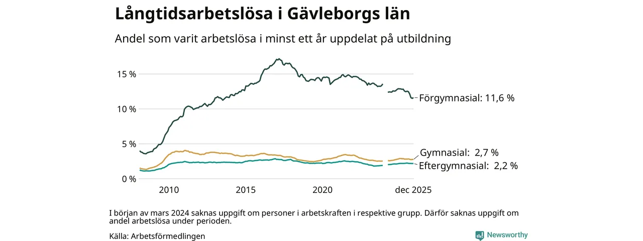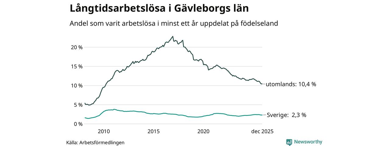 I december hade 5 114 Gävleborgsbor varit arbetslösa i minst ett år, vilket är sju fler än månaden innan. Det är den första månaden sedan juli 2025 som antalet arbetslösa ökar. 5 114 personer motsvarar 3,8 procent av arbetskraften i länet – andelen långtidsarbetslösa är 0,2 procentenheter lägre än samma månad för ett år sedan. Gävleborgs län hade tredje högst andel långtidsarbetslösa i landet i december.