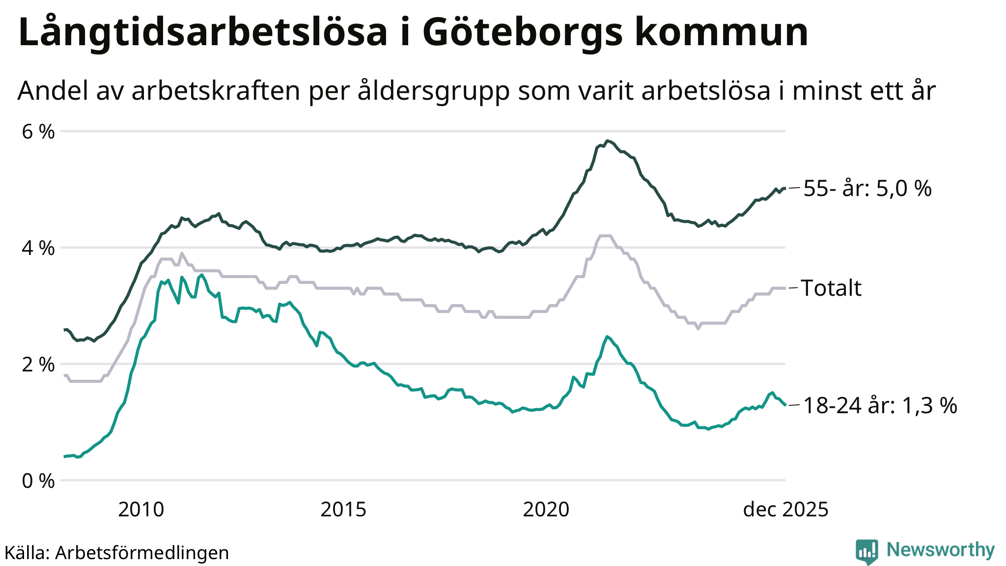 | Andel arbetslösa i minst ett år | 3,3 % | 2,5 % | 2,9 % |