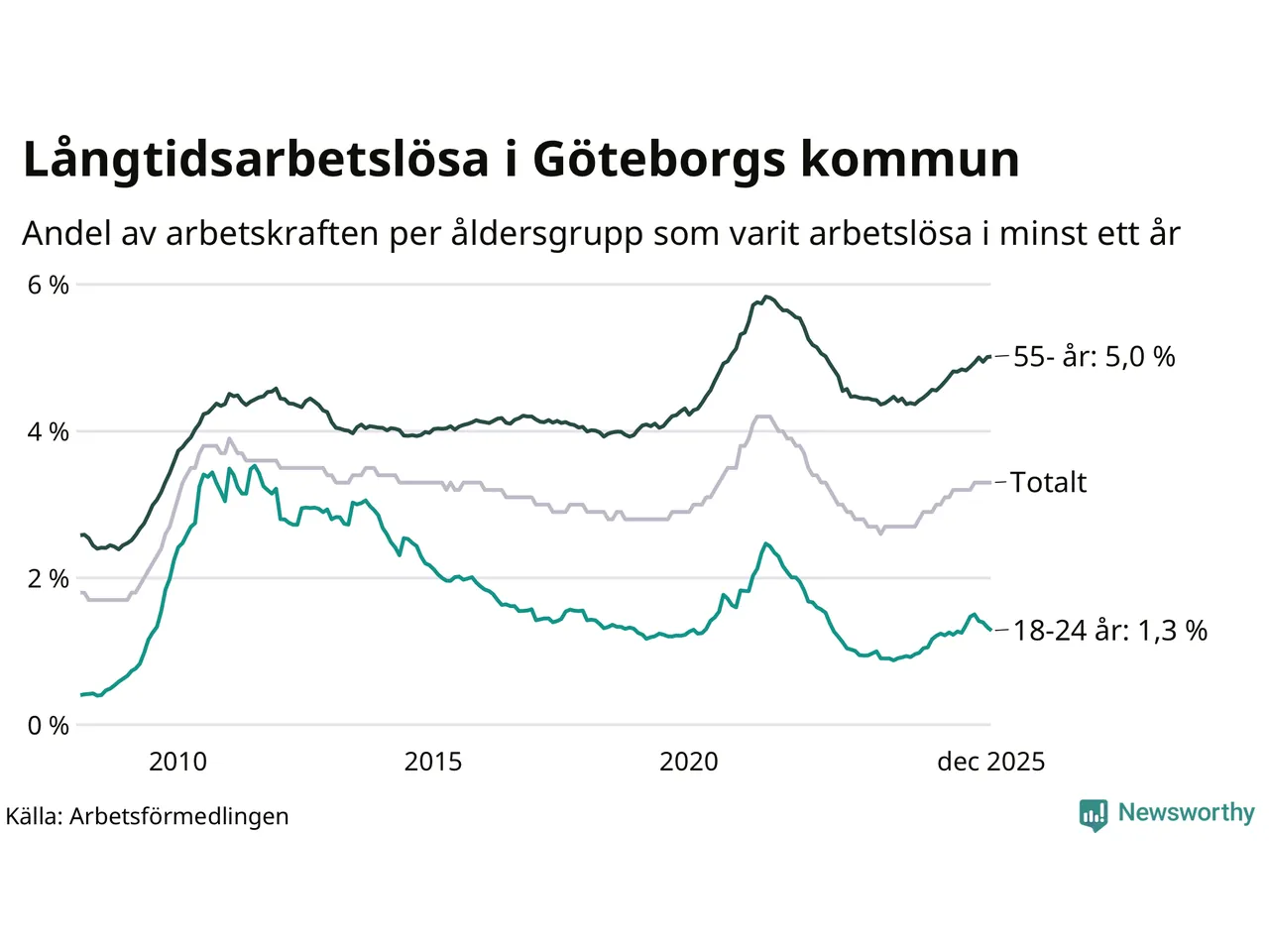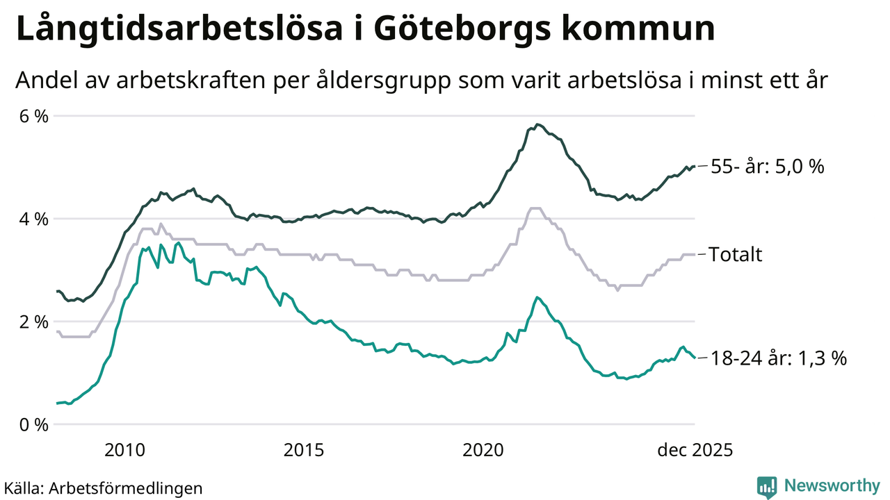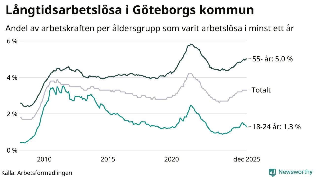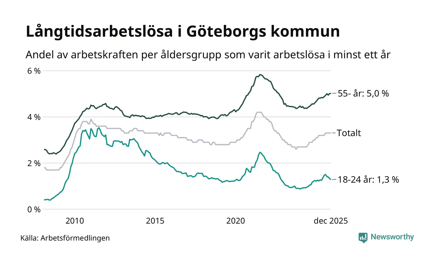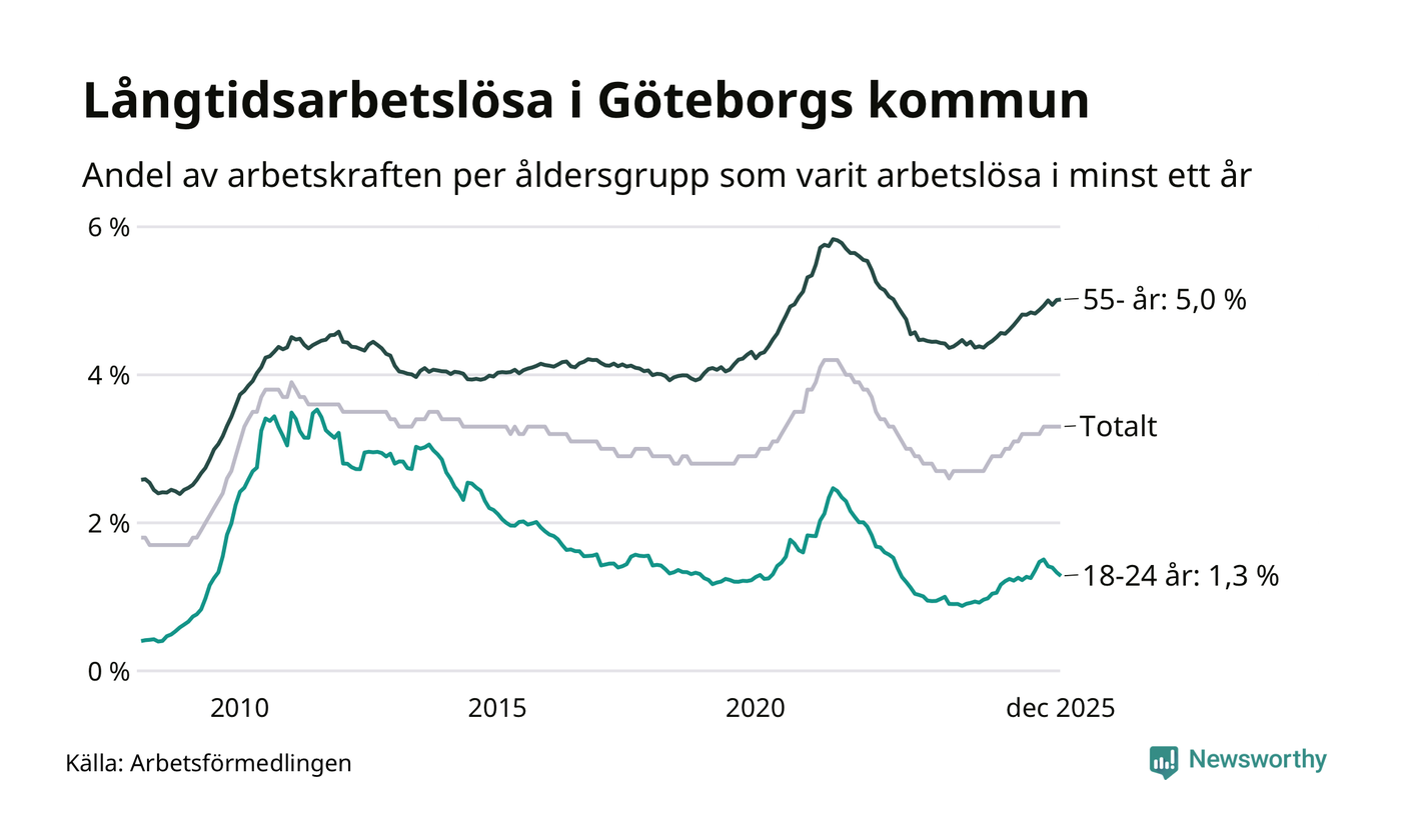 Av de 10 783 personerna som varit arbetslösa i mer än ett år i Göteborgs kommun är 2 809 personer mellan 55 och 651 år och 441 är mellan 18 och 24 år. För den äldre gruppen är andelen arbetslösa 5,0 procent medan den i den yngre gruppen är 1,3 procent. Även i riket som helhet är långtidsarbetslösheten högre i gruppen äldre.