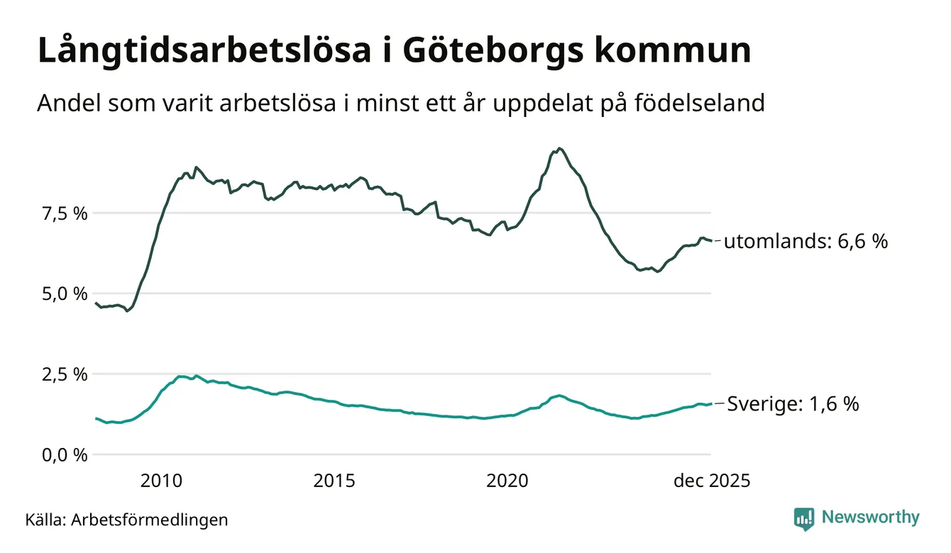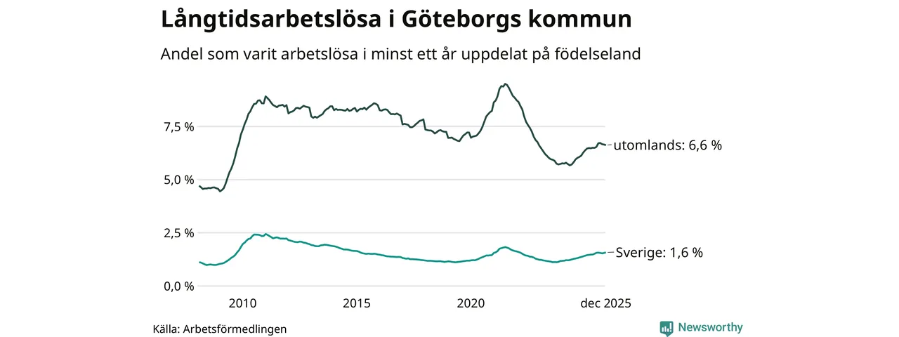 3 410 av de långtidsarbetslösa i Göteborg är födda i Sverige, medan 7 373 är födda utomlands. Det innebär att långtidsarbetslösheten bland Sverigefödda är 1,6 procent, medan den är fyra gånger så hög – 6,6 procent – bland födda utomlands. Även i riket som helhet är arbetslösheten högre bland utrikesfödda.