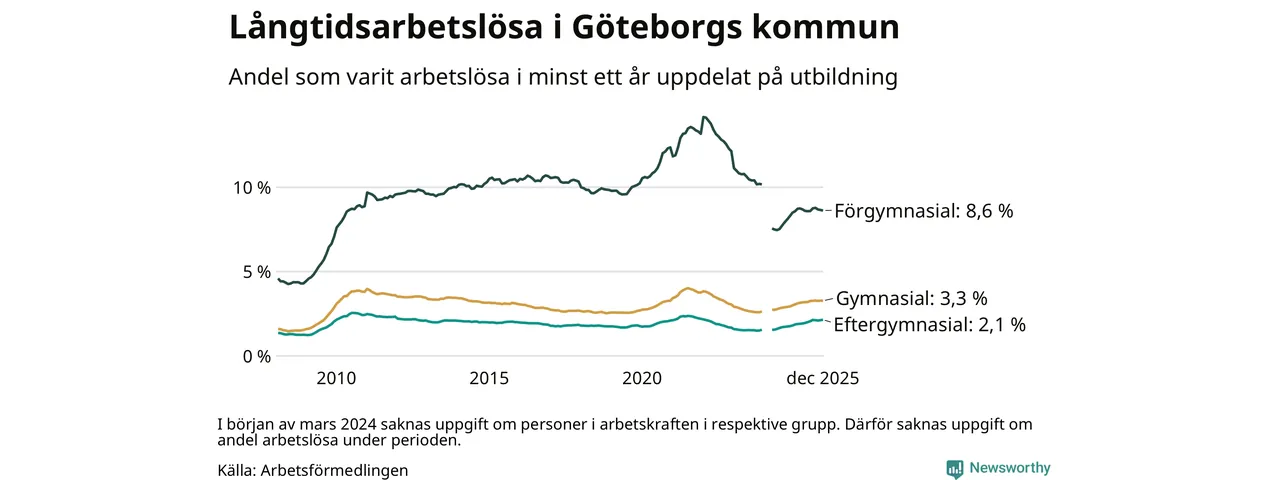 Andelen som varit utan arbete i minst ett år i Göteborg var högre i december jämfört med samma månad för ett år sedan. Det visar Arbetsfömedlingens senaste månadsstatistik.