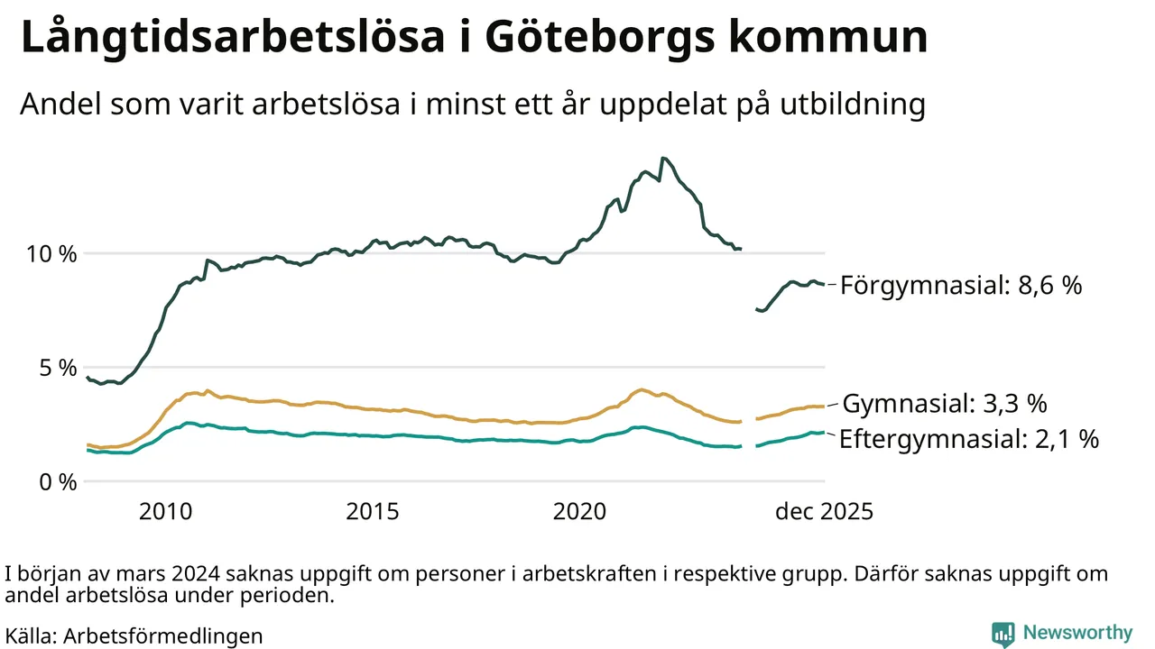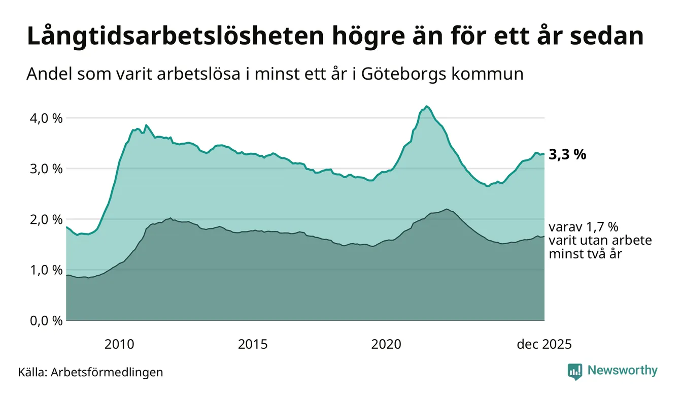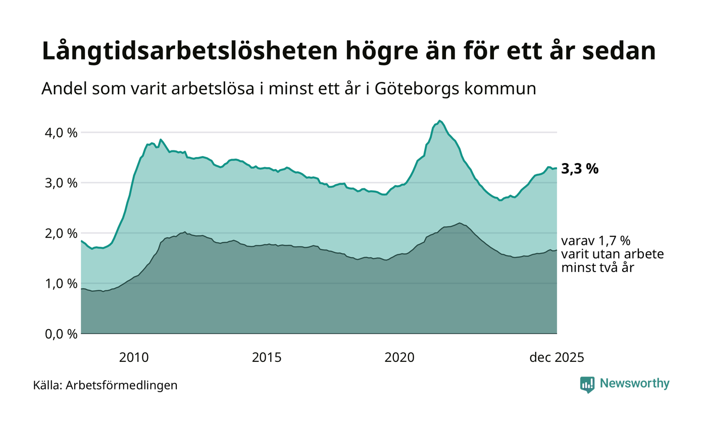 I december hade 10 783 Göteborgsbor varit arbetslösa i minst ett år, vilket är 26 fler än månaden innan. 10 783 personer motsvarar 3,3 procent av arbetskraften i kommunen – andelen långtidsarbetslösa är 0,3 procentenheter högre än samma månad för ett år sedan.