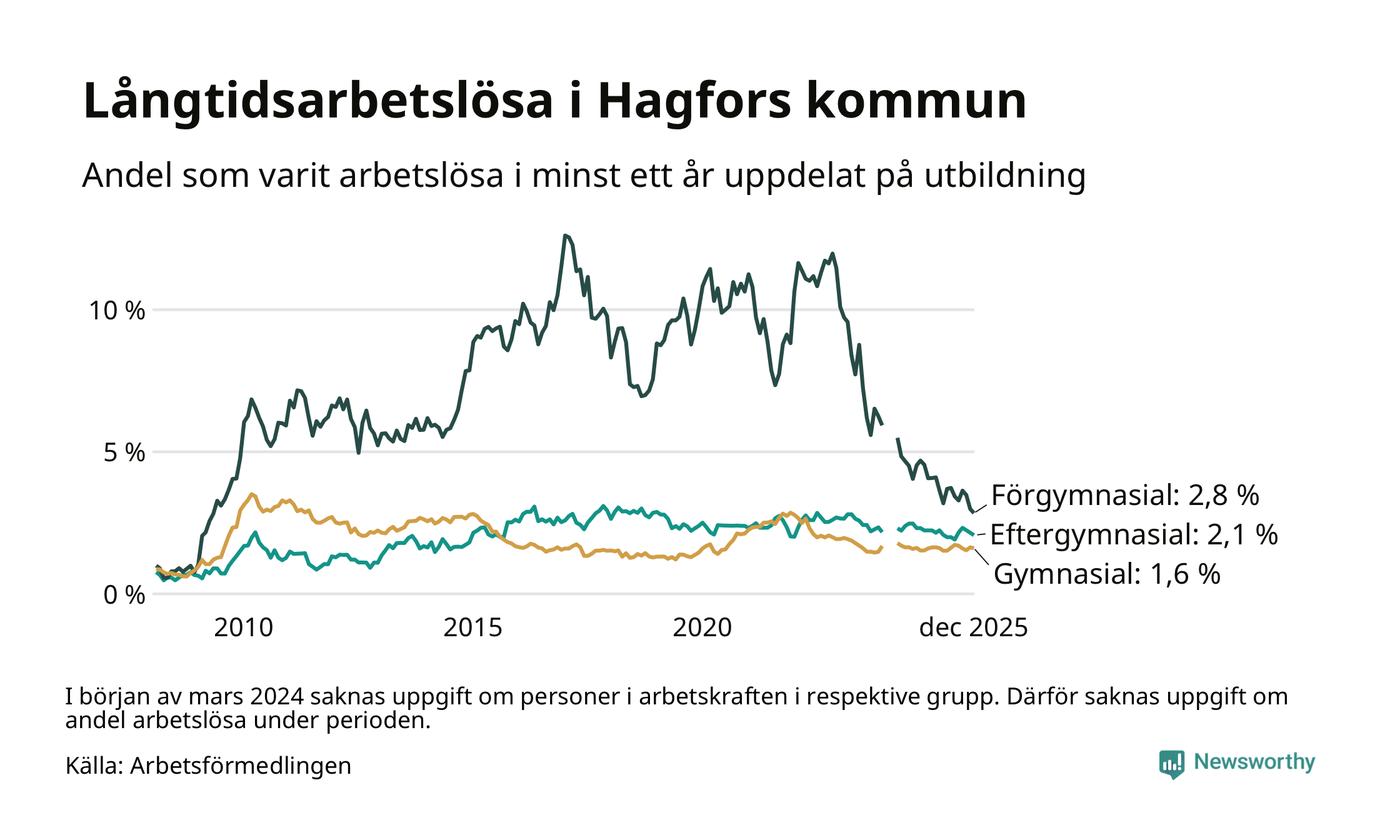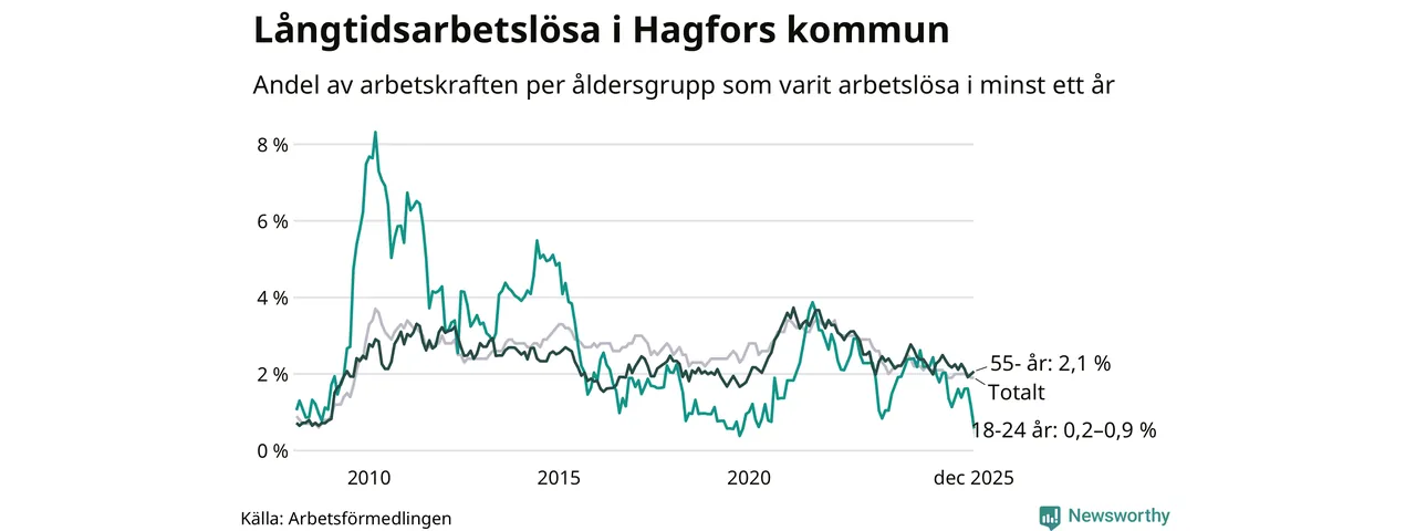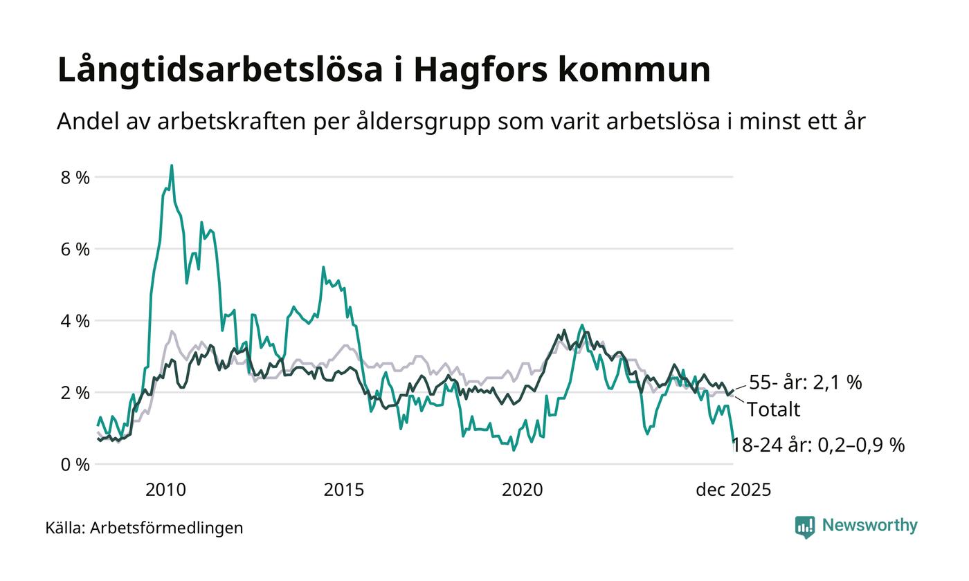 Av de 90 personerna som varit arbetslösa i mer än ett år i Hagfors kommun är 29 personer mellan 55 och 651 år och mellan en och fyra är mellan 18 och 24 år. För den äldre gruppen är andelen arbetslösa 2,1 procent medan den i den yngre gruppen är mellan 0,2 och 0,9 procent. Även i riket som helhet är långtidsarbetslösheten högre i gruppen äldre.