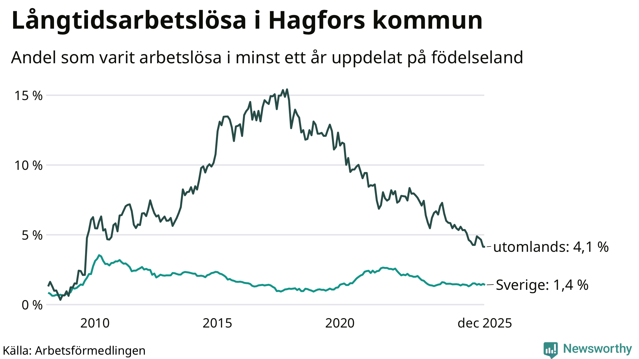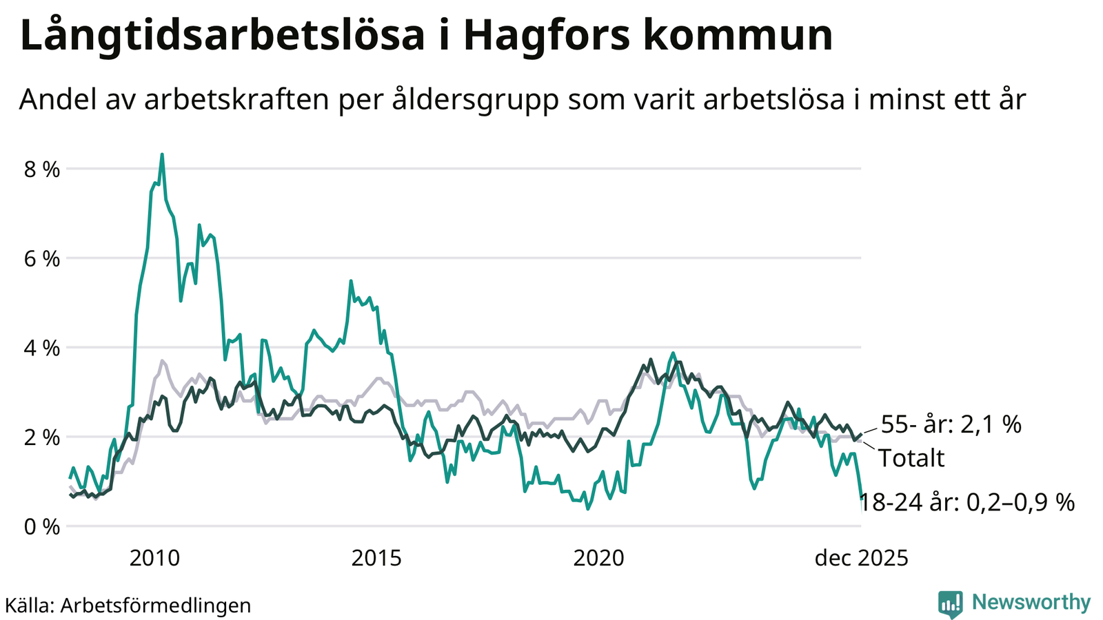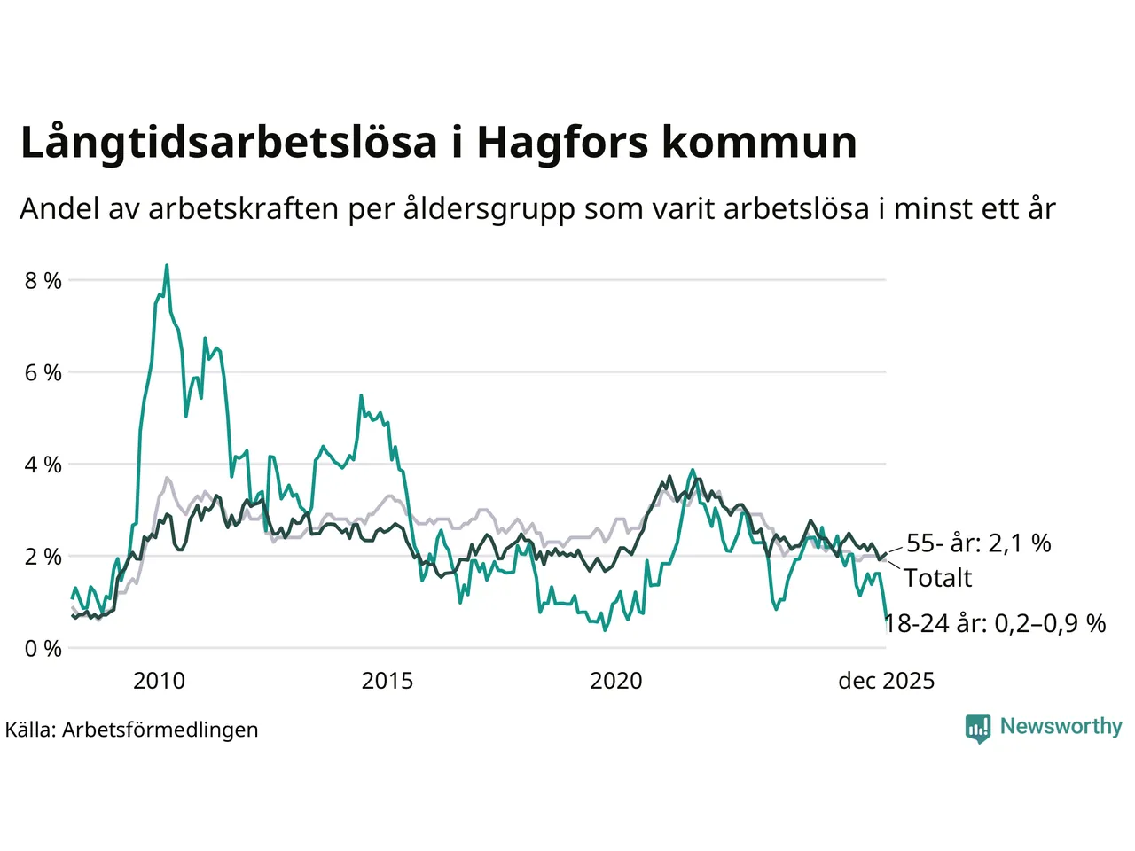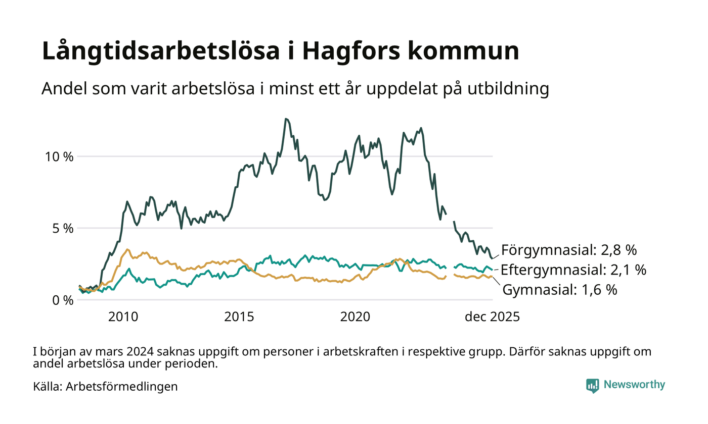 | Andel arbetslösa i minst två år | 0,9 % | 1,3 % | 1,5 % |