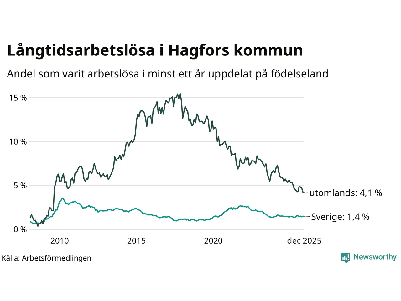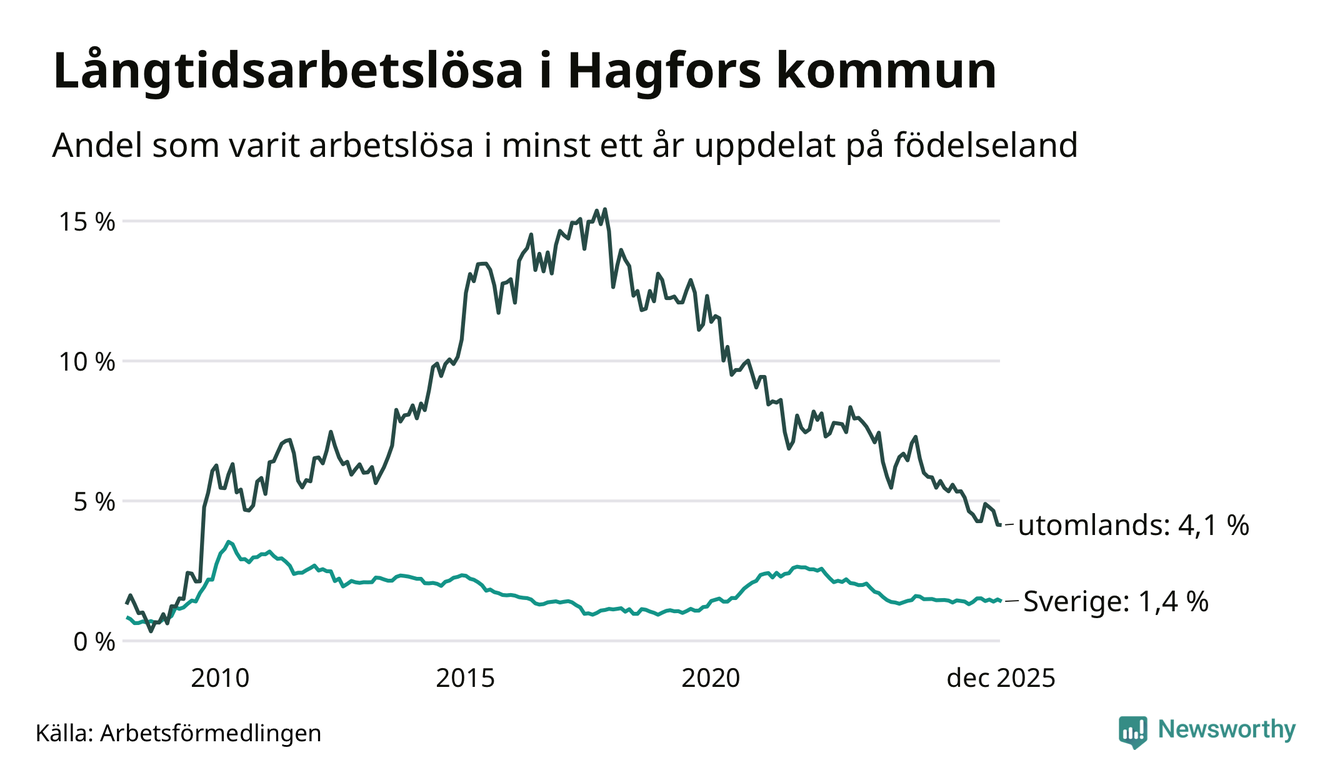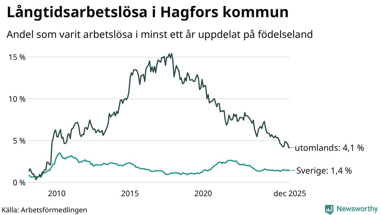 56 av de långtidsarbetslösa i Hagfors är födda i Sverige, medan 34 är födda utomlands. Det innebär att långtidsarbetslösheten bland Sverigefödda är 1,4 procent, medan den är tre gånger så hög – 4,1 procent – bland födda utomlands. Även i riket som helhet är arbetslösheten högre bland utrikesfödda.