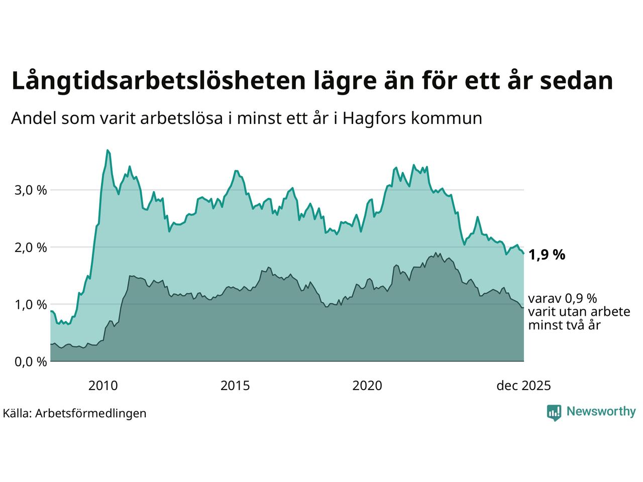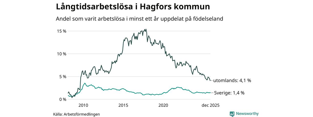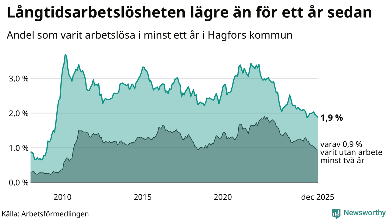 I december hade 90 Hagforsbor varit arbetslösa i minst ett år, vilket är tre färre än månaden innan. 90 personer motsvarar 1,9 procent av arbetskraften i kommunen – andelen långtidsarbetslösa är 0,2 procentenheter lägre än samma månad för ett år sedan.