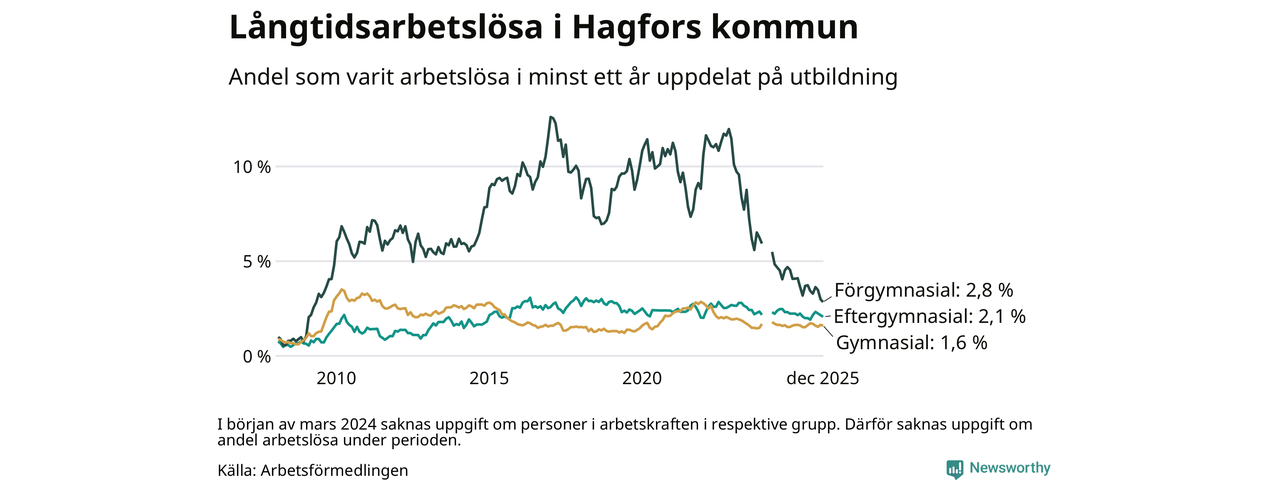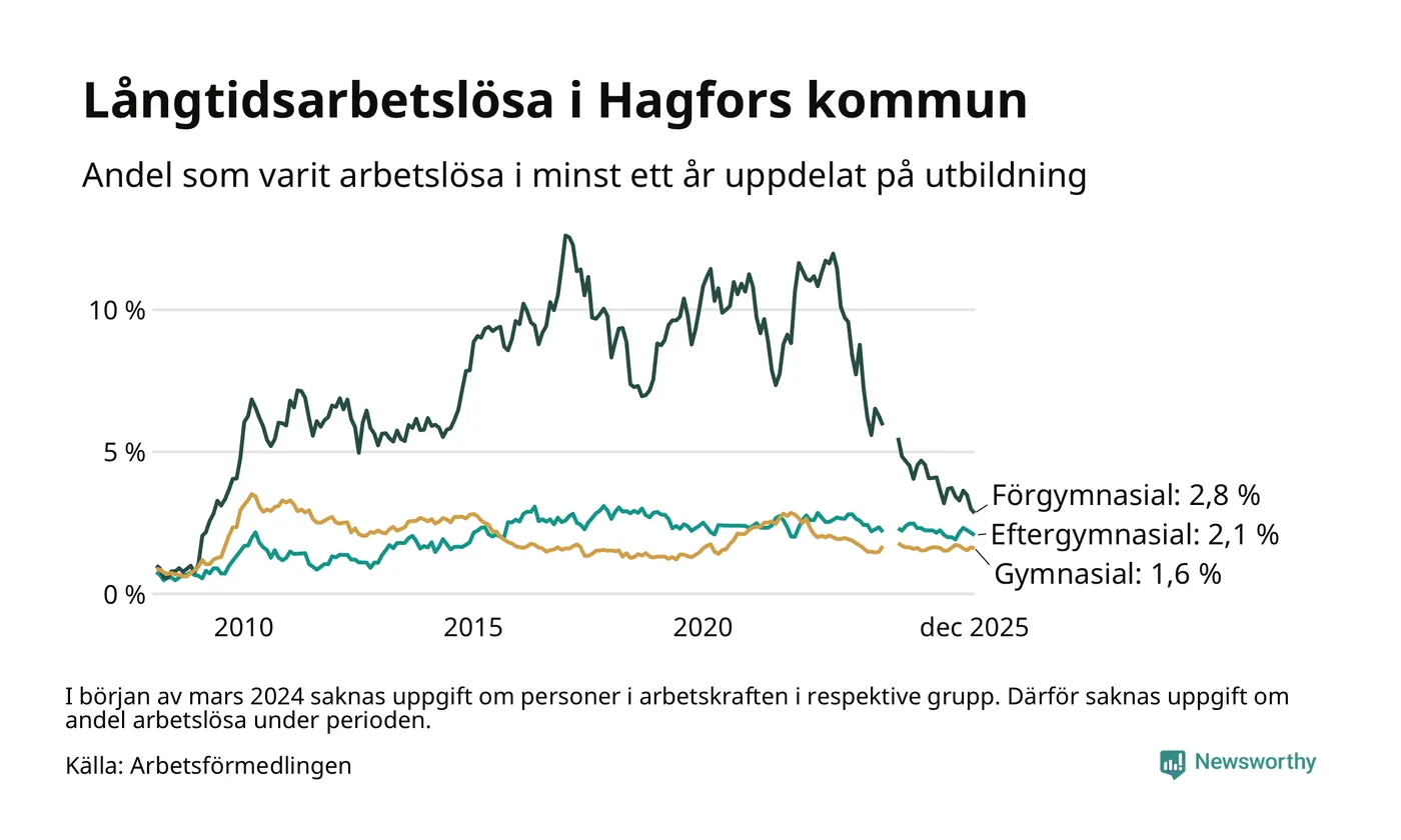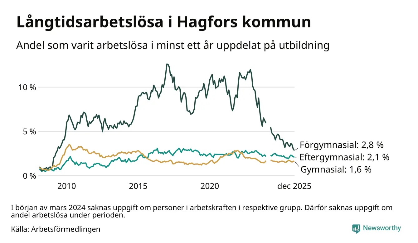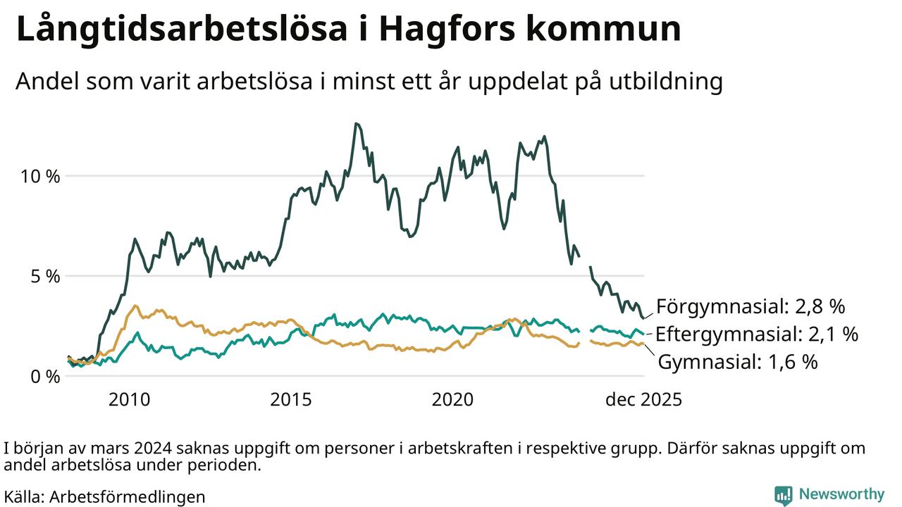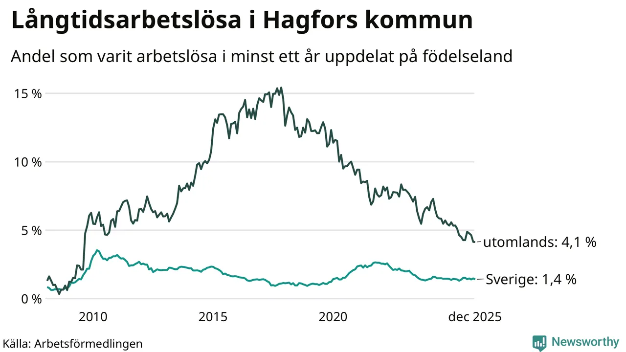 Andelen som varit utan arbete i minst ett år i Hagfors var lägre i december jämfört med samma månad för ett år sedan. Det visar Arbetsfömedlingens senaste månadsstatistik.
