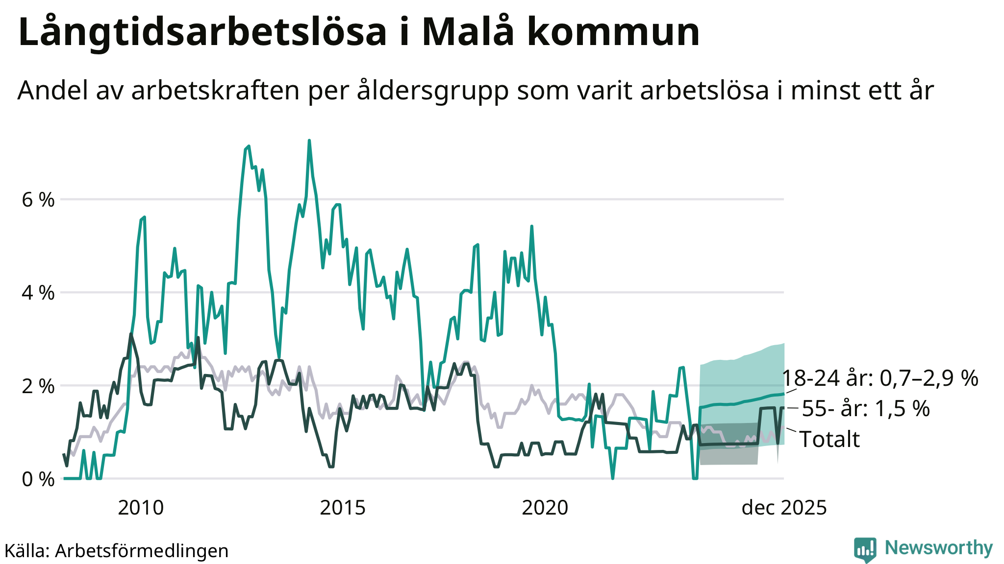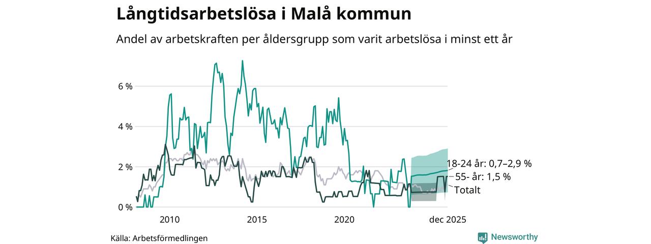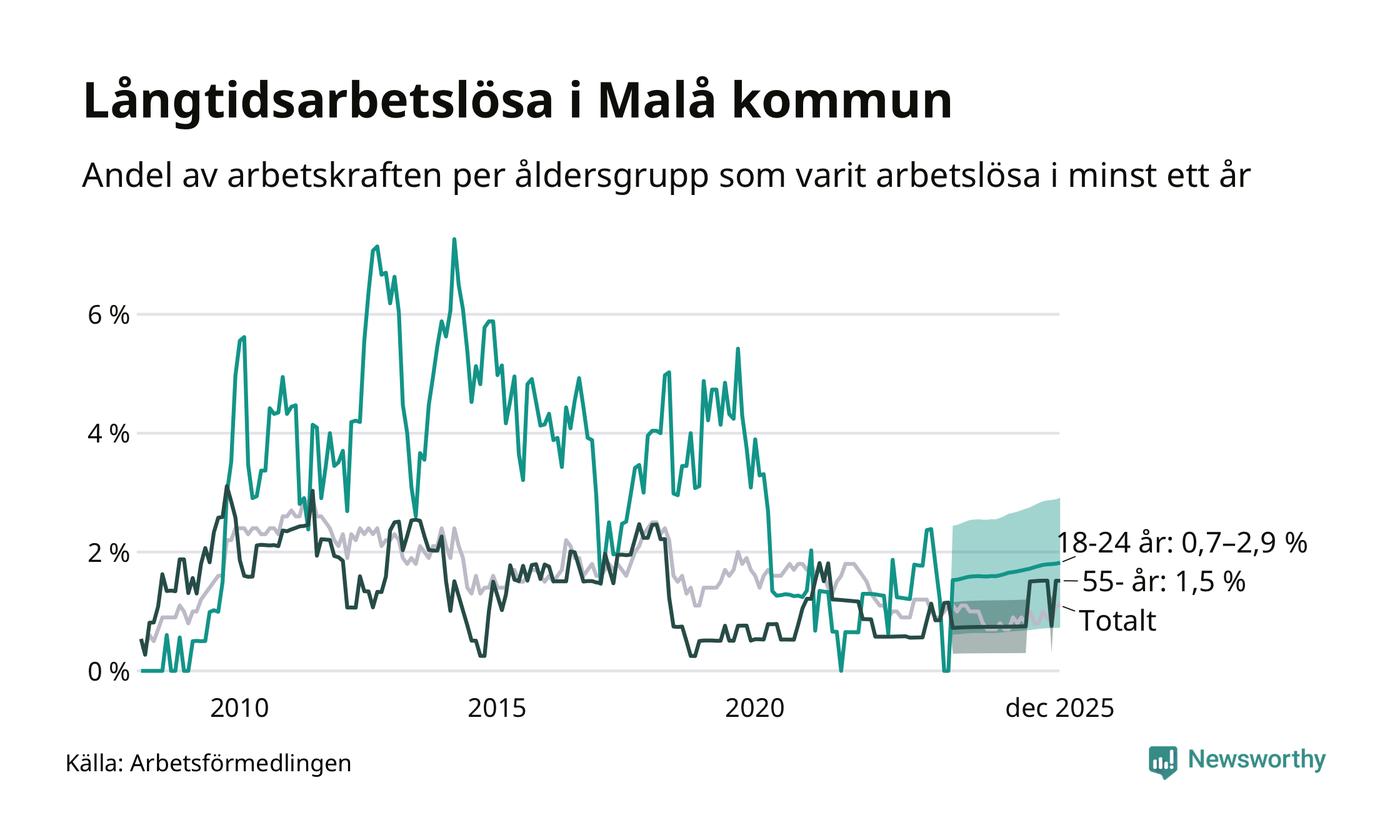 Av de 15 personerna som varit arbetslösa i mer än ett år i Malå kommun är fem personer mellan 55 och 651 år och mellan en och fyra är mellan 18 och 24 år. För den äldre gruppen är andelen arbetslösa 1,5 procent medan den i den yngre gruppen är mellan 0,7 och 2,9 procent. Även i riket som helhet är långtidsarbetslösheten högre i gruppen äldre.