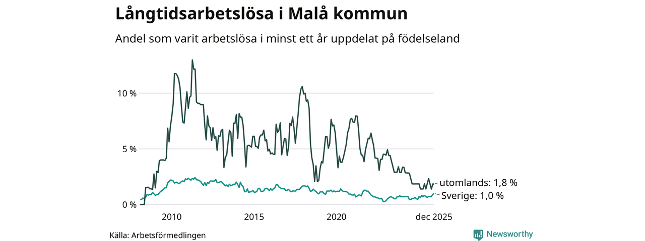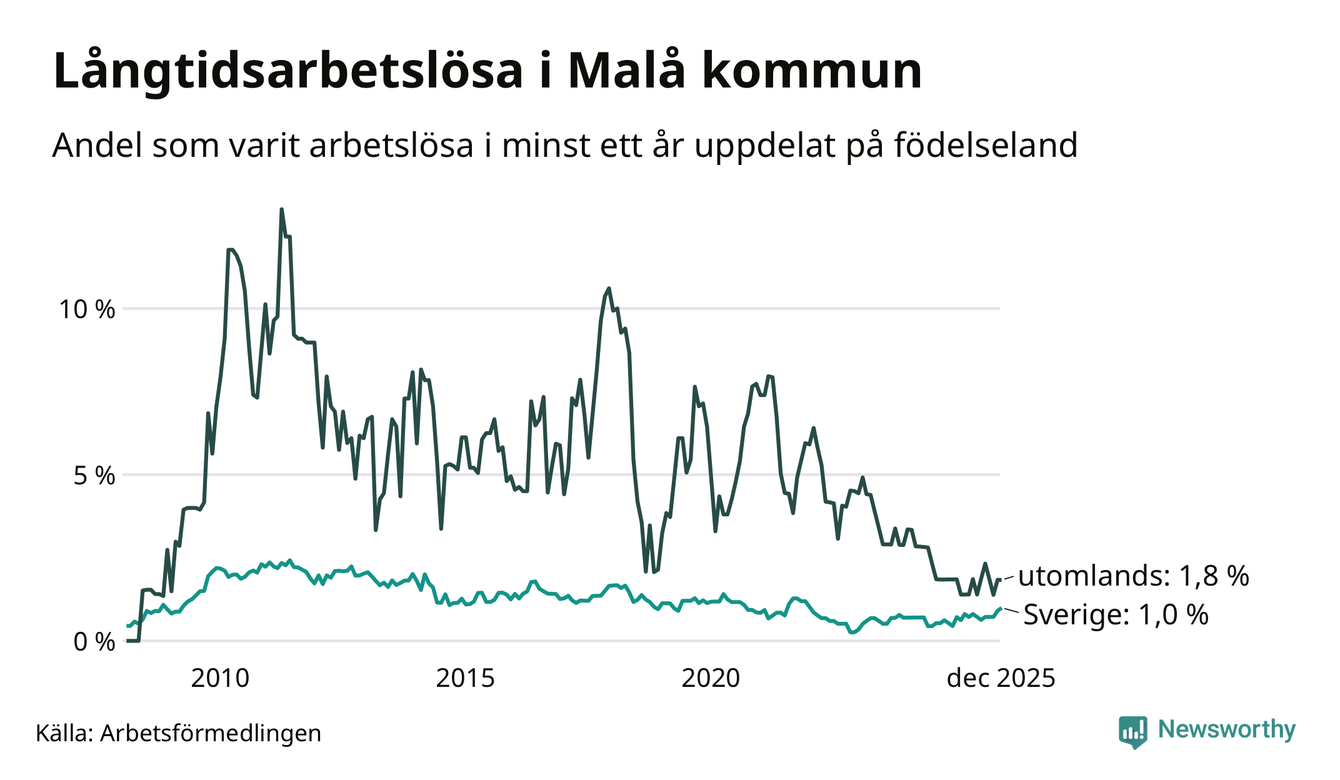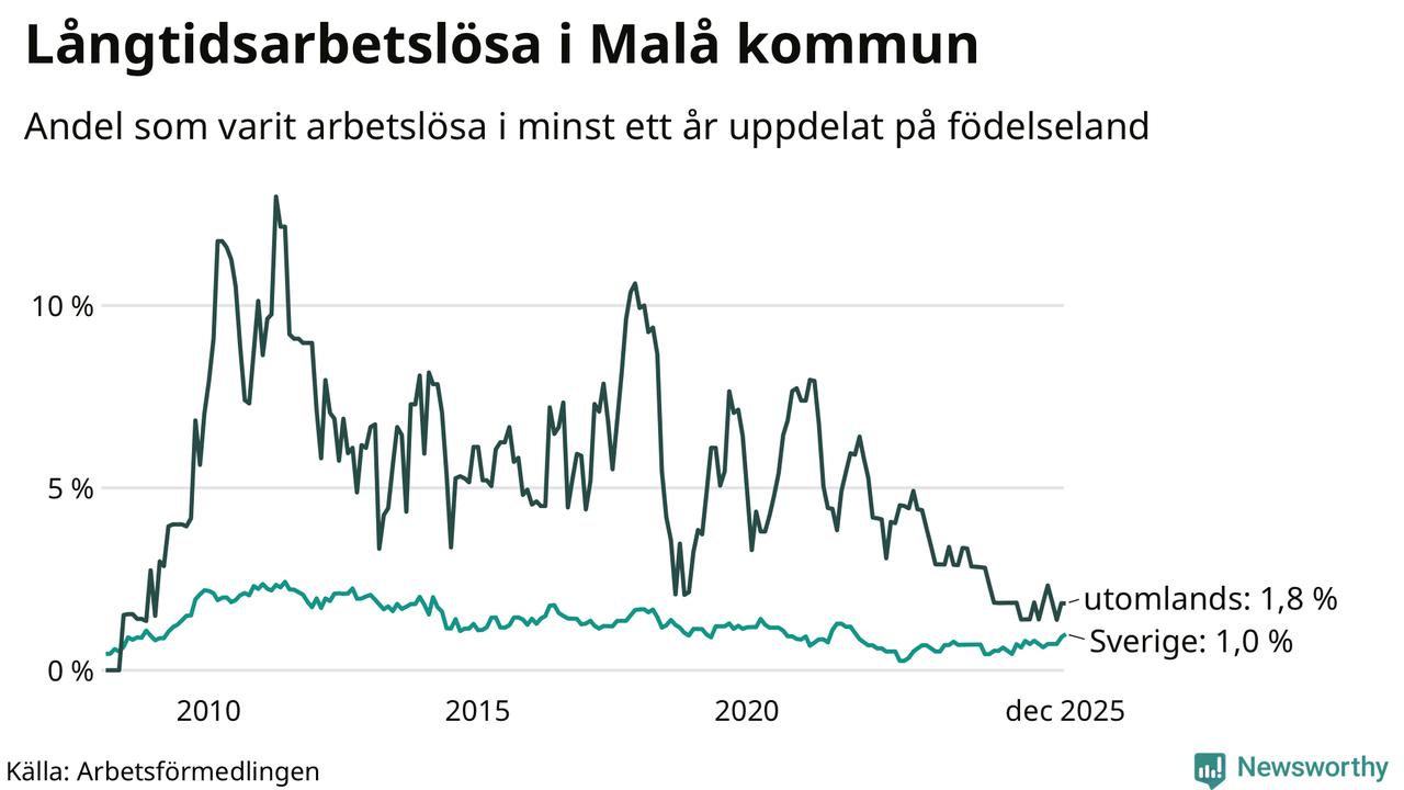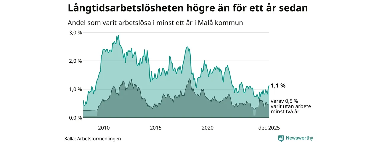 I december hade 15 Malåbor varit arbetslösa i minst ett år, vilket är en fler än månaden innan. 15 personer motsvarar 1,1 procent av arbetskraften i kommunen – andelen långtidsarbetslösa är 0,4 procentenheter högre än samma månad för ett år sedan. Malå tillhör de kommuner som har lägst andel långtidsarbetslösa i hela landet just nu.