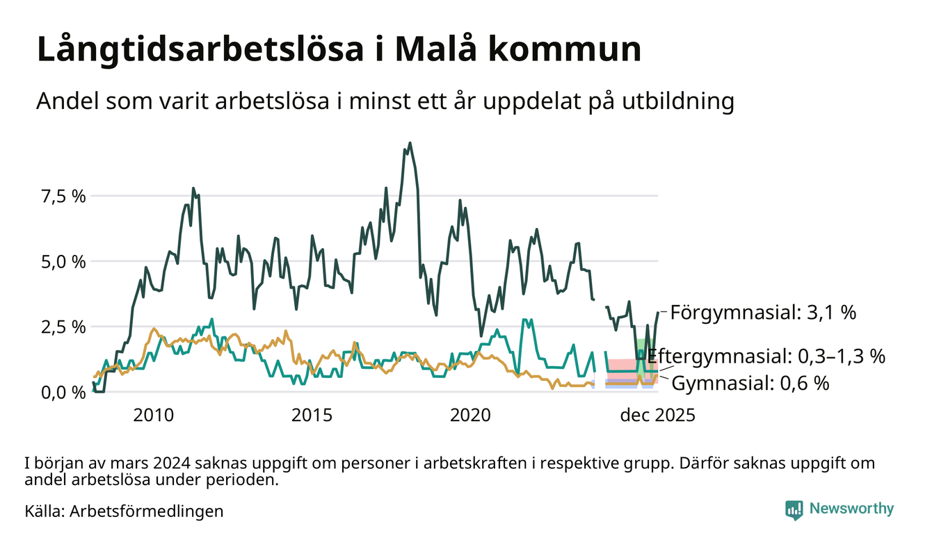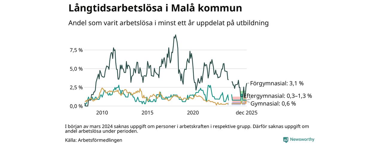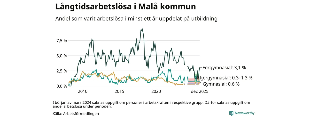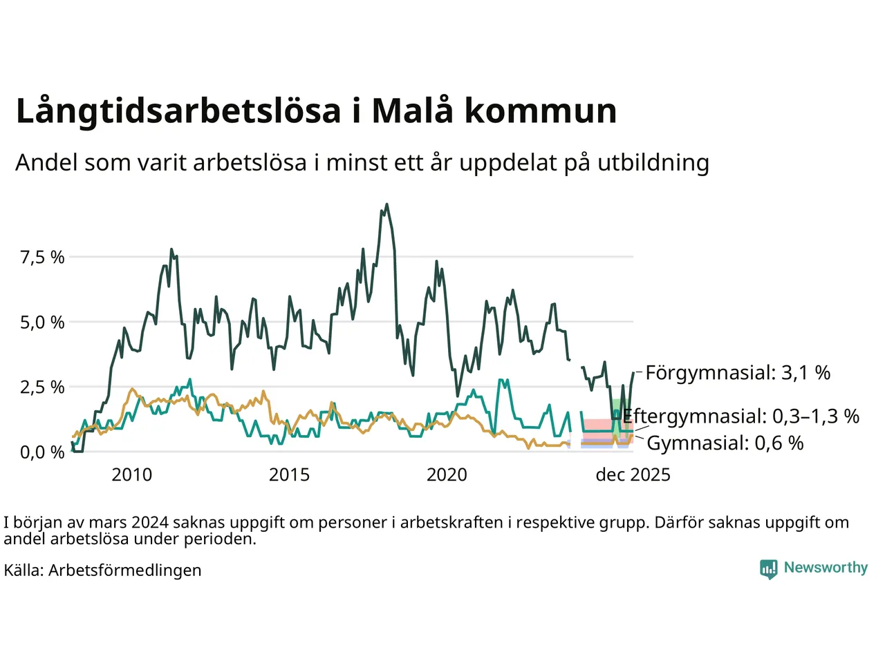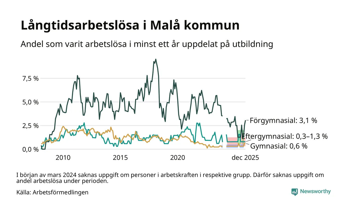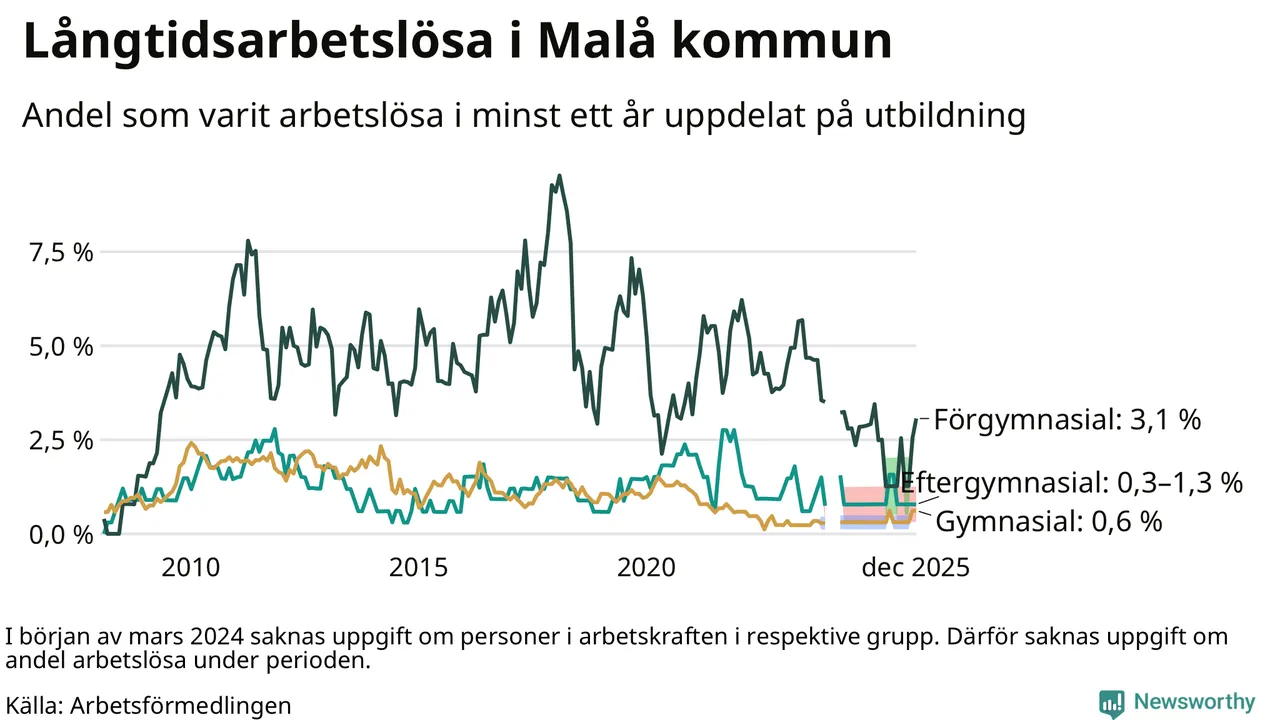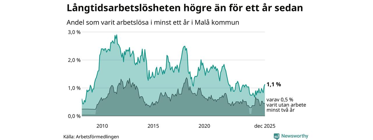 Inte sedan maj 2023 har andelen långtidsarbetslösa varit så hög i Malå. Det visar Arbetsförmedlingens senaste månadsstatistik.