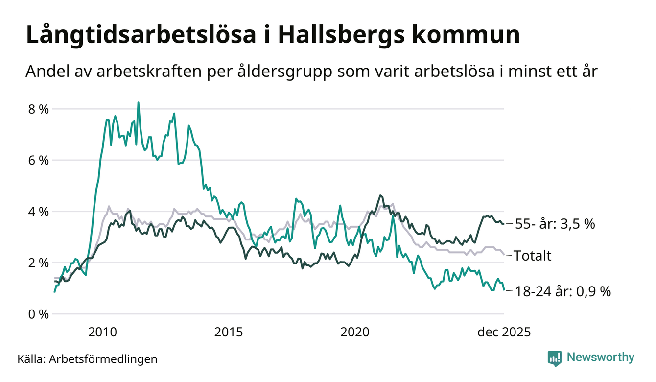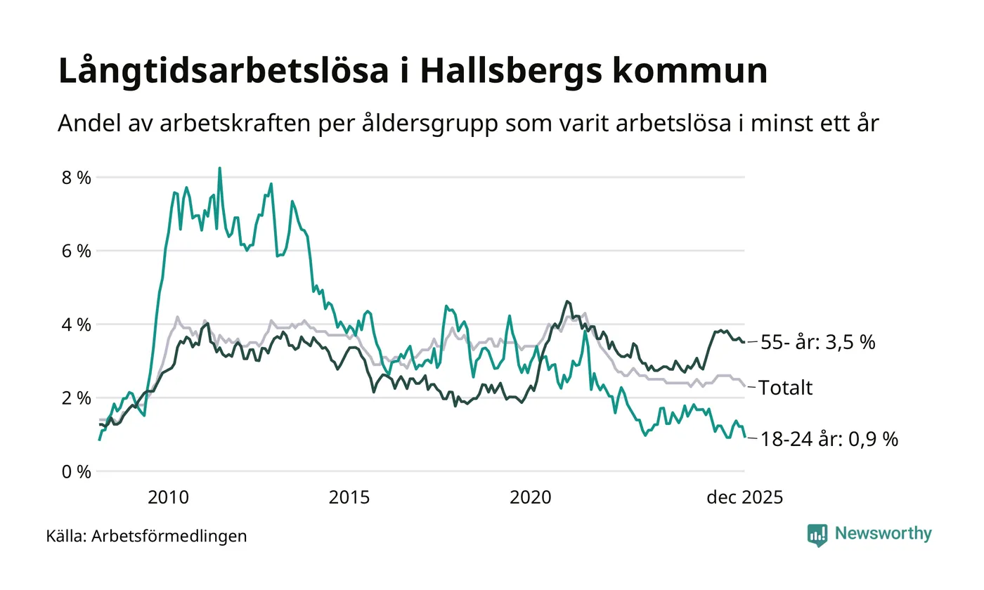 Av de 174 personerna som varit arbetslösa i mer än ett år i Hallsbergs kommun är 62 personer mellan 55 och 651 år och sex är mellan 18 och 24 år. För den äldre gruppen är andelen arbetslösa 3,5 procent medan den i den yngre gruppen är 0,9 procent. Även i riket som helhet är långtidsarbetslösheten högre i gruppen äldre.