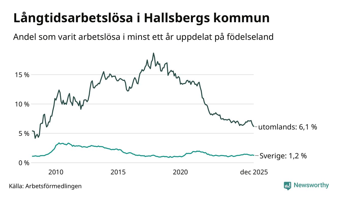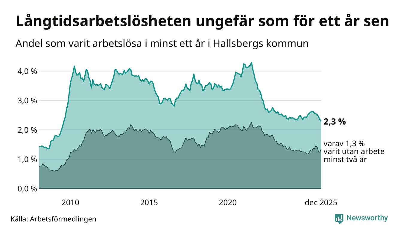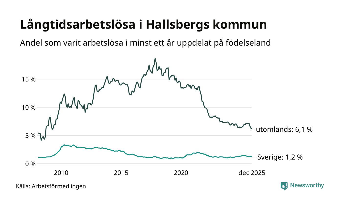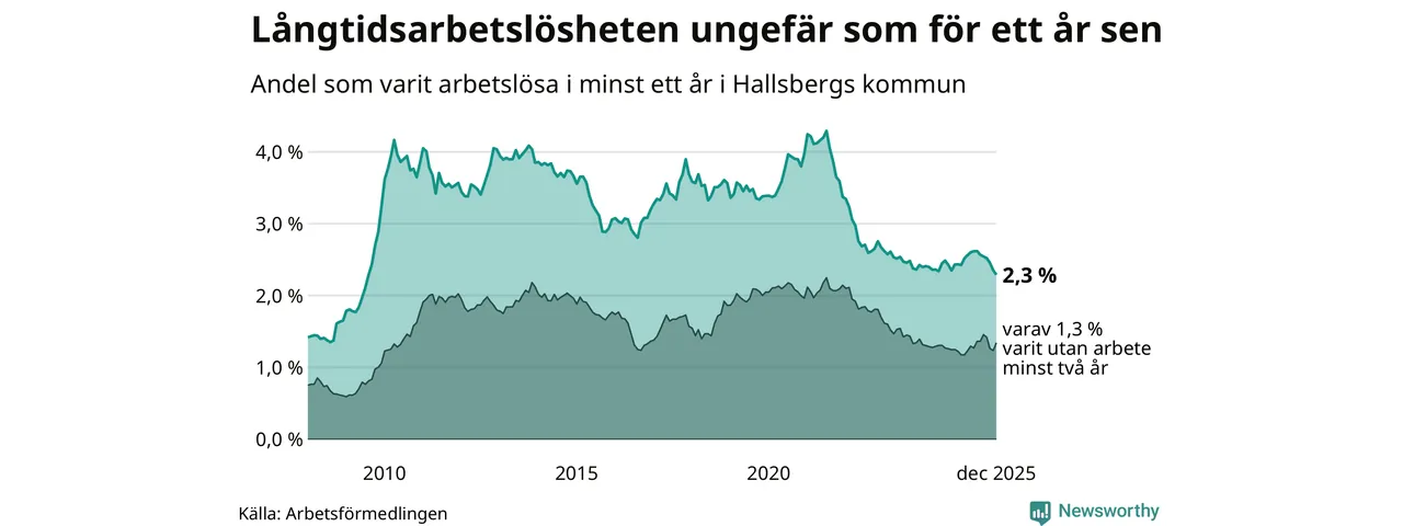 I december hade 174 Hallsbergsbor varit arbetslösa i minst ett år, vilket är fem färre än månaden innan. Det är den sjätte månaden i rad med minskande antal långtidsarbetslösa. 174 personer motsvarar 2,3 procent av arbetskraften i kommunen – andelen långtidsarbetslösa är ungefär på samma nivå som för ett år sedan.