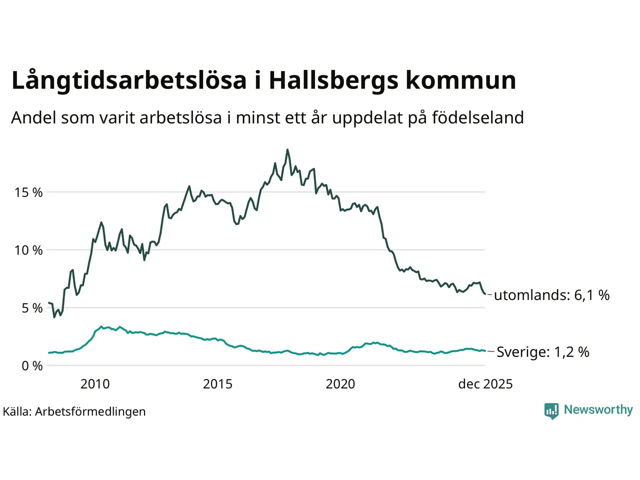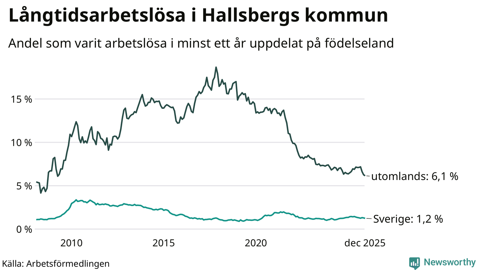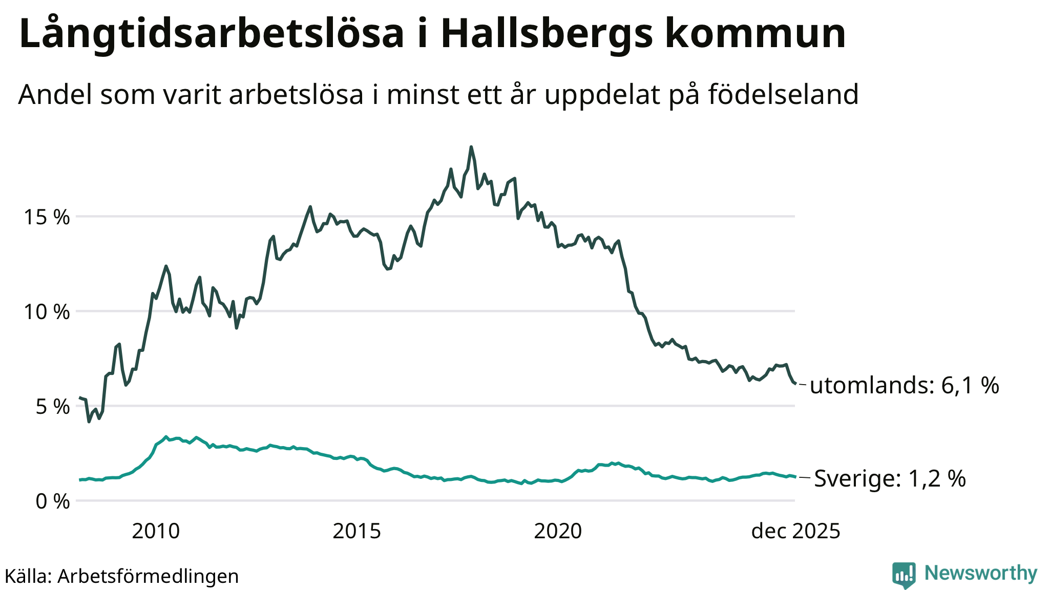I december hade 174 Hallsbergsbor varit arbetslösa i minst ett år, vilket är fem färre än månaden innan. Det är den sjätte månaden i rad med minskande antal långtidsarbetslösa. 174 personer motsvarar 2,3 procent av arbetskraften i kommunen – andelen långtidsarbetslösa är ungefär på samma nivå som för ett år sedan.
