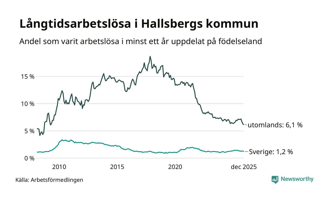 74 av de långtidsarbetslösa i Hallsberg är födda i Sverige, medan 100 är födda utomlands. Det innebär att långtidsarbetslösheten bland Sverigefödda är 1,2 procent, medan den är fem gånger så hög – 6,1 procent – bland födda utomlands. Även i riket som helhet är arbetslösheten högre bland utrikesfödda.